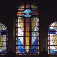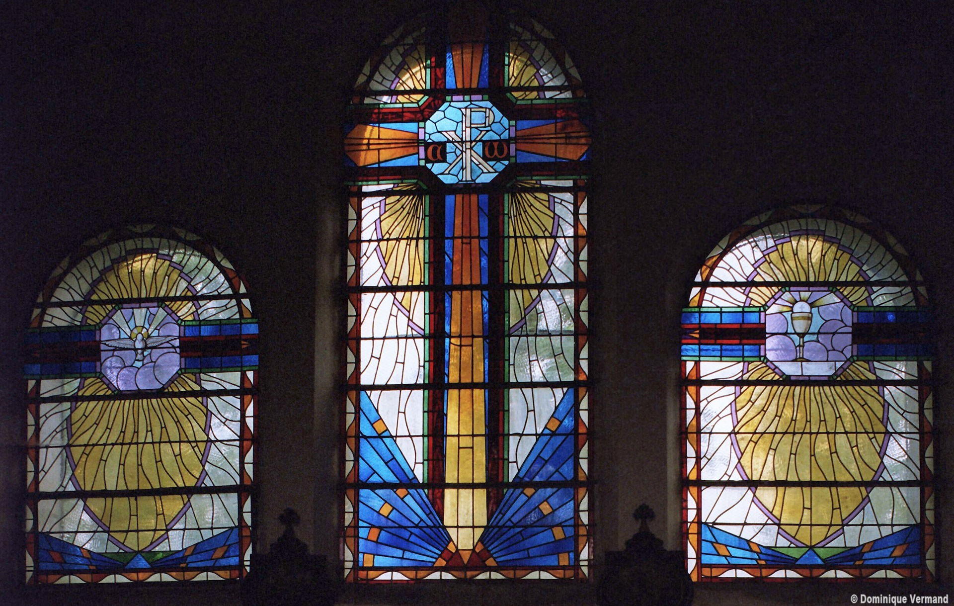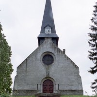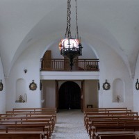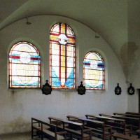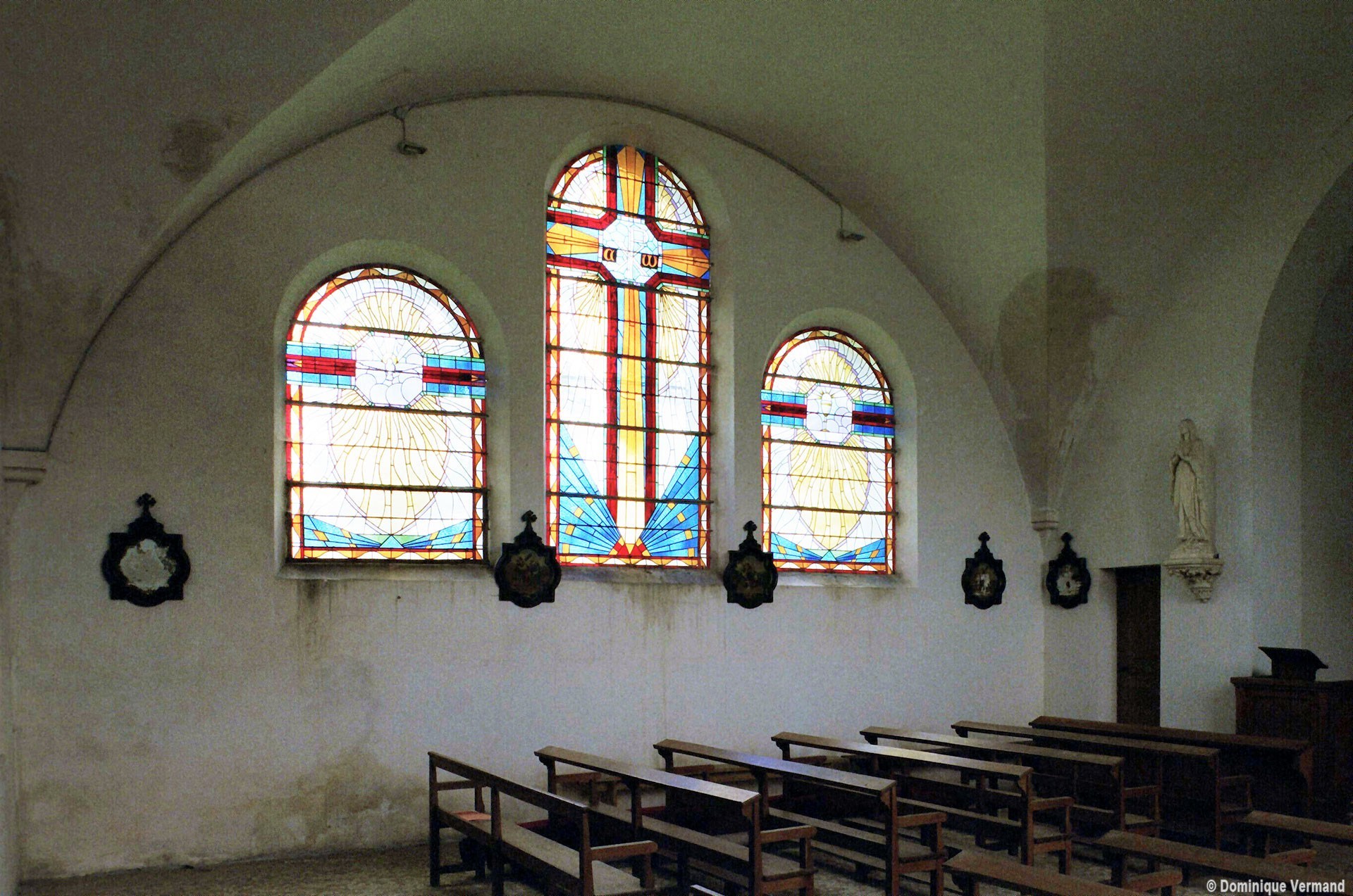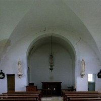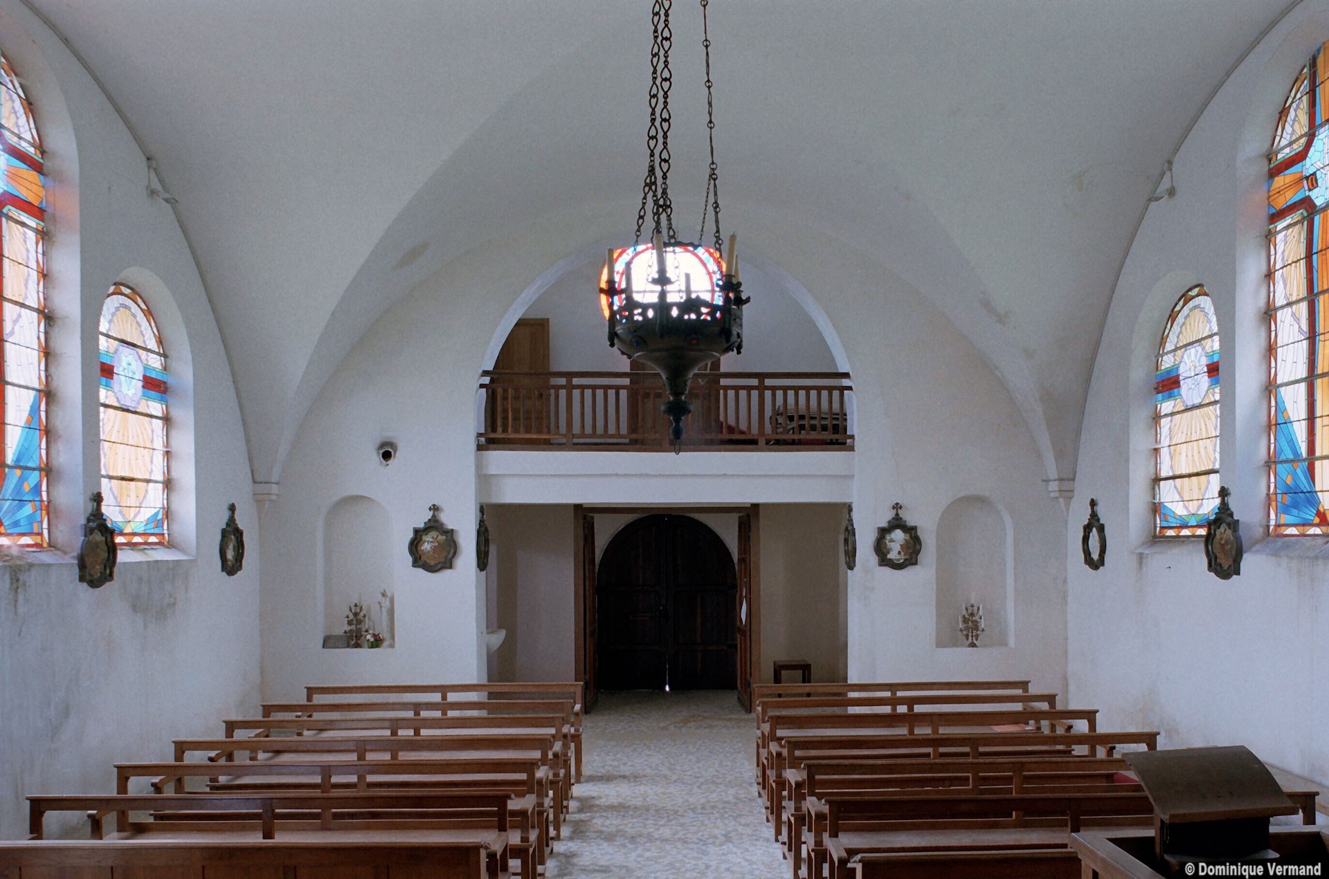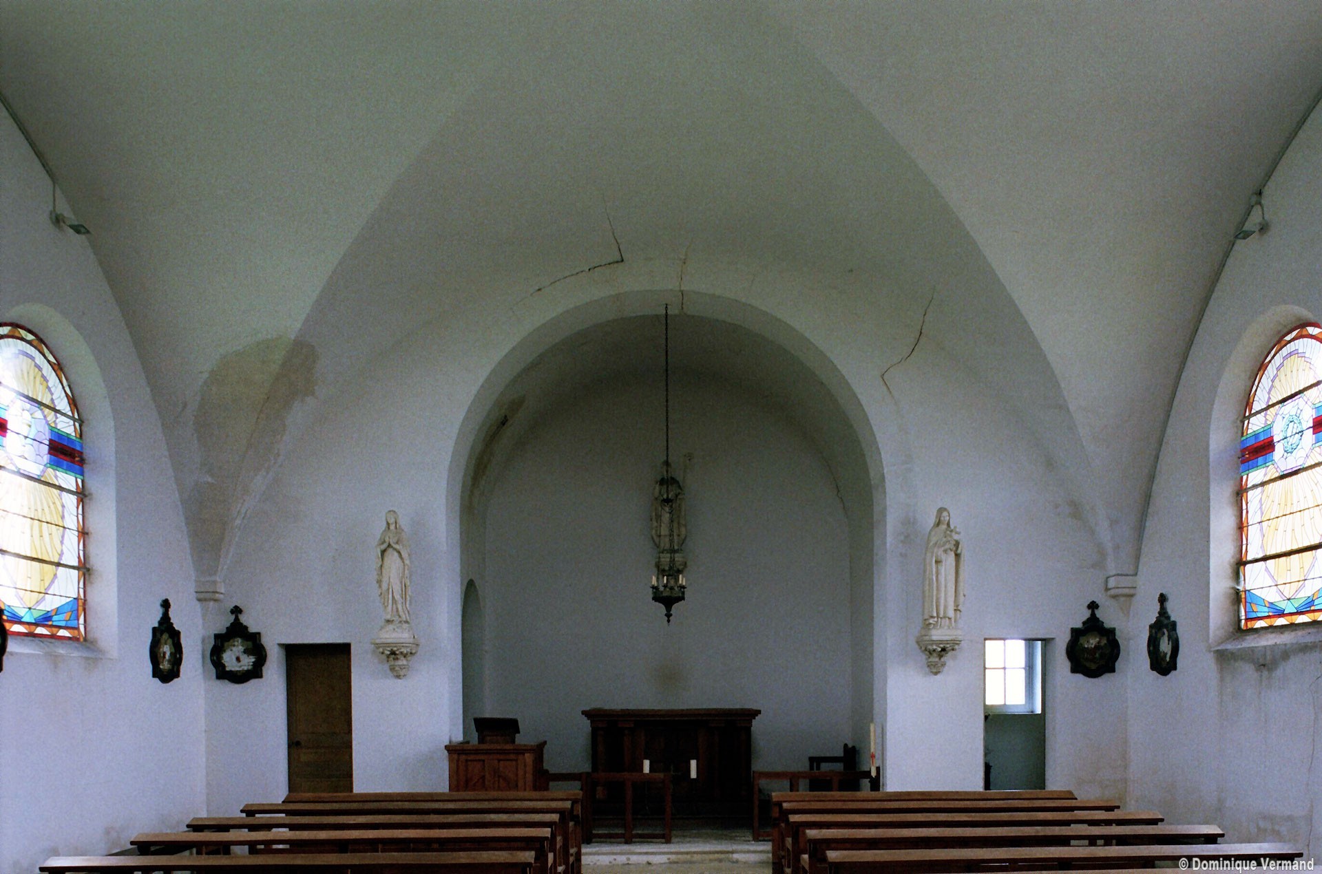 A l’ouest, le bloc de façade communique avec la nef par une grande arcade en plein cintre inscrivant un porche surmonté d’une tribune. De chaque côté, un petit espace abrite l’accès à cette dernière et un baptistère. A l’opposé, le choeur à chevet plat s’ouvre vers la nef par une arcade identique. Un petit réduit et la sacristie l’encadrent (2008).