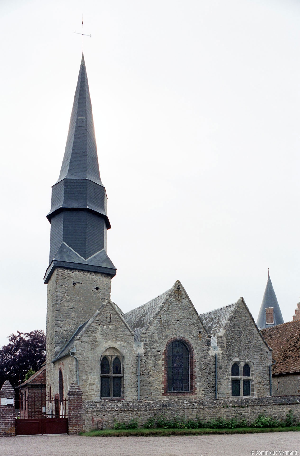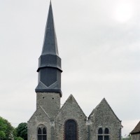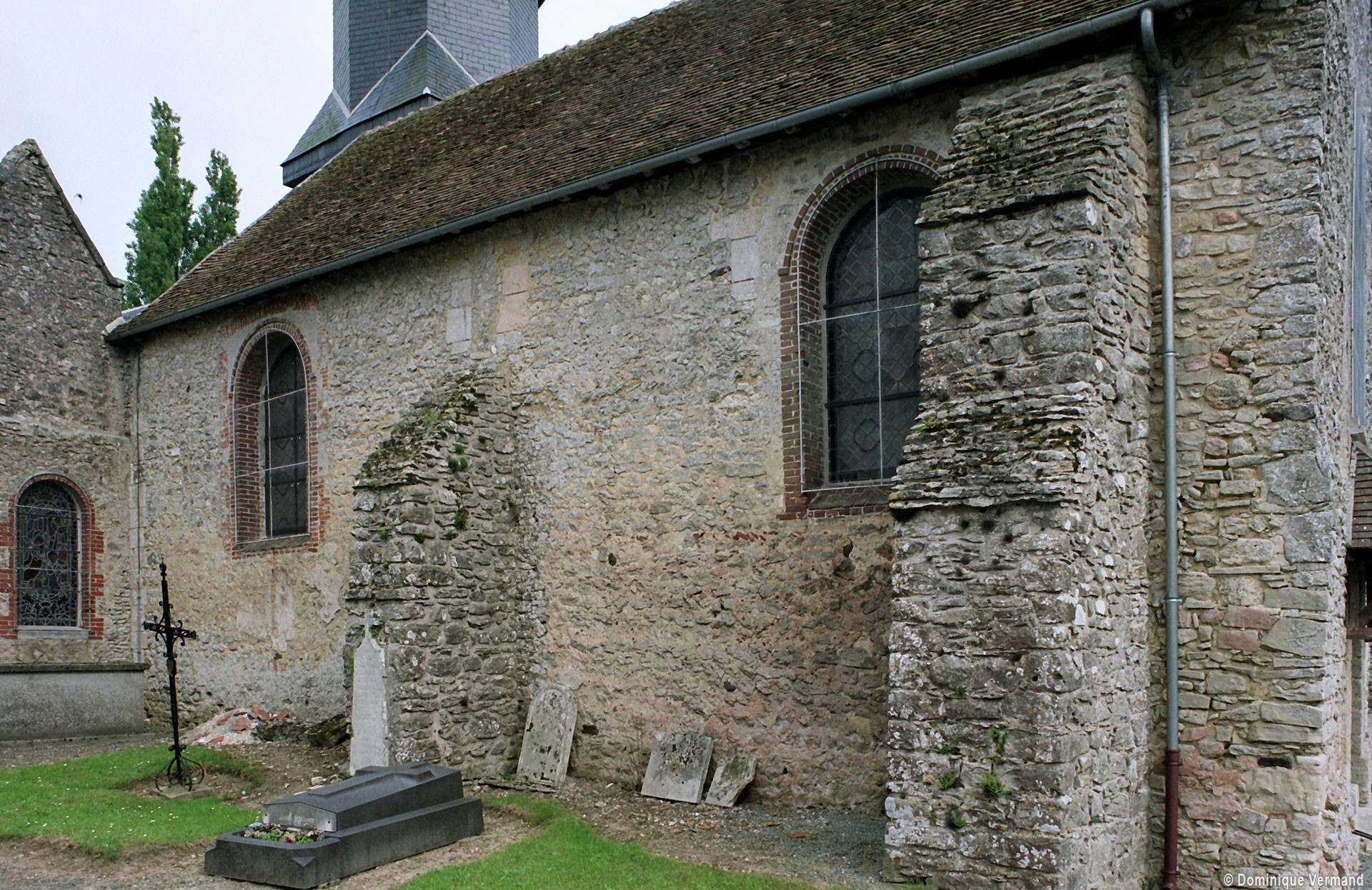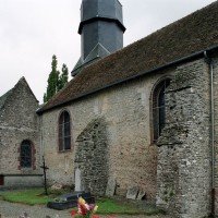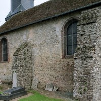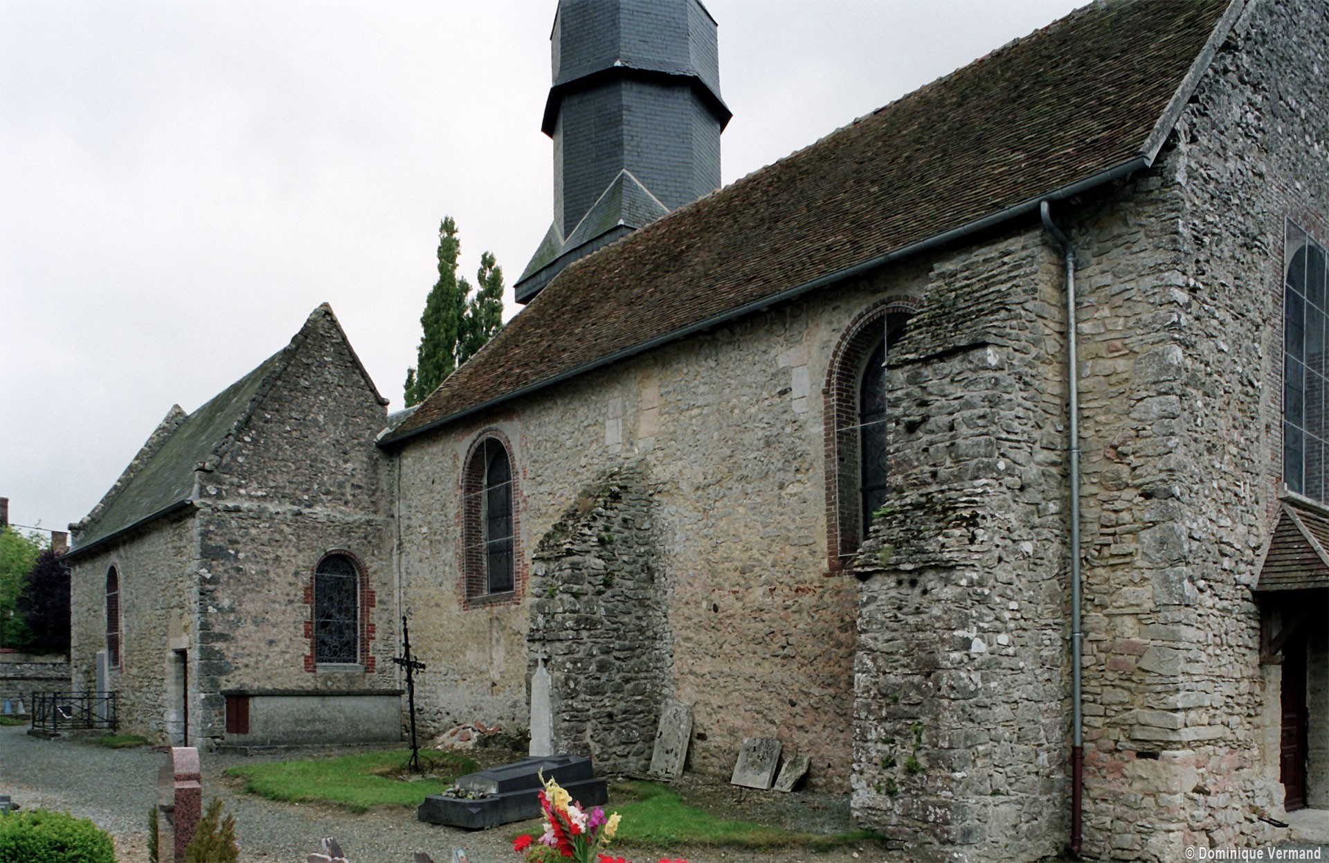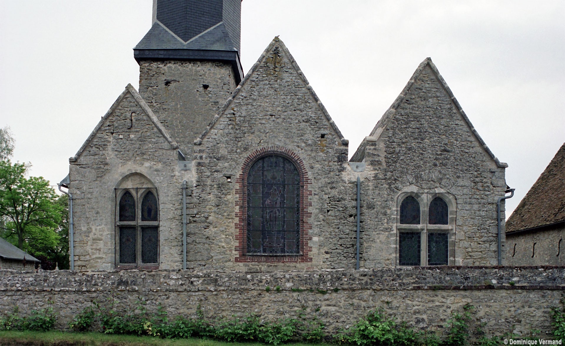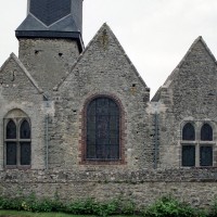 Au 14ème siècle, deux chapelles bâties de part et d’autre du choeur primitif composeront un large chevet plat dont les trois pignons correspondent à autant de toitures indépendantes. Formées de deux lancettes coupées par un meneau horizontal, les deux fenêtres orientales sont caractéristiques du vocabulaire architectural normand et anglais de l’époque et se rencontrent, dans la région, à Hodenc-en-Bray et à Senantes (où le chevet est très similaire). Sans doute bâtie la première, la chapelle sud a conservé sa charpente d’origine, dont le type se retrouve dans la nef.