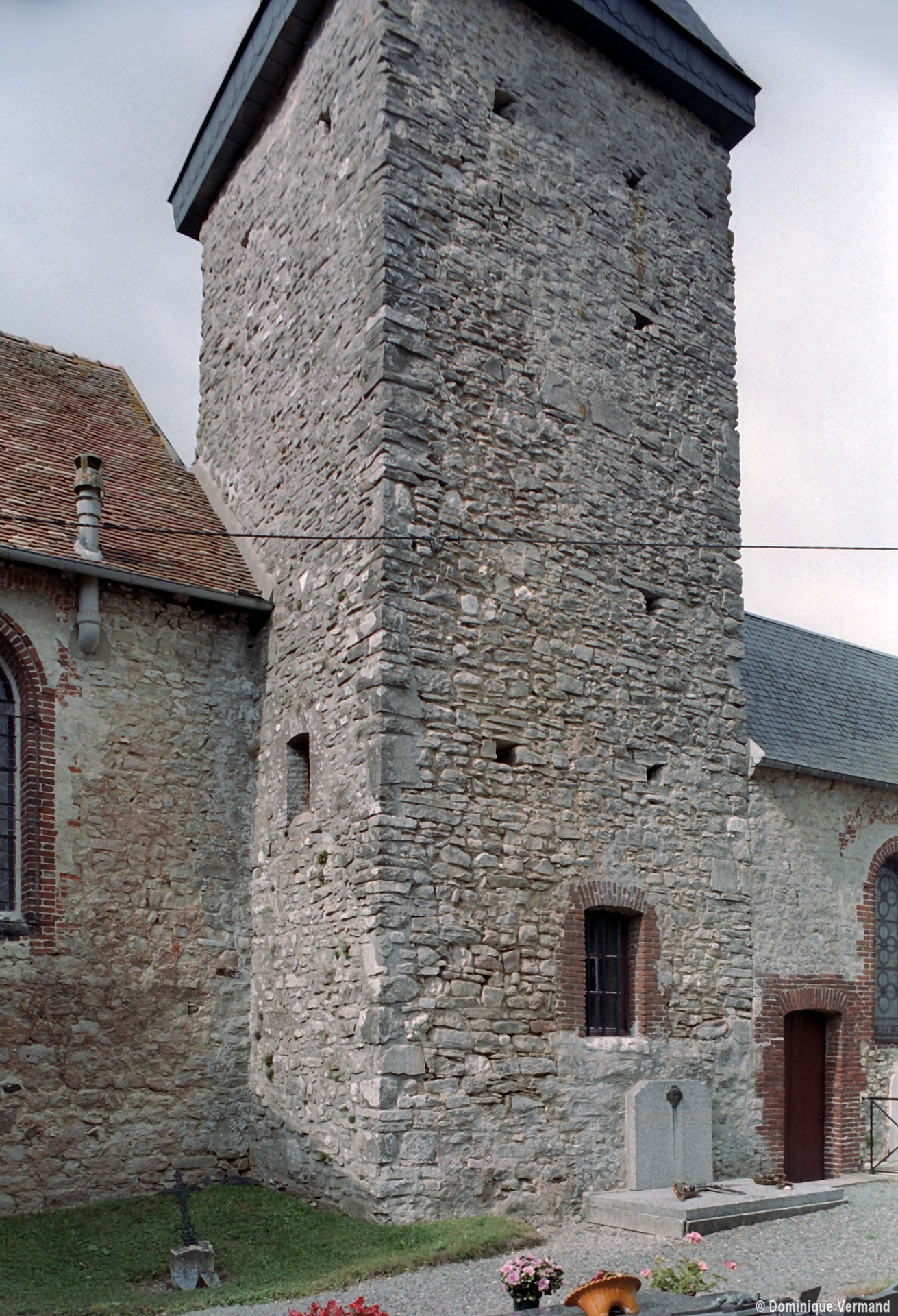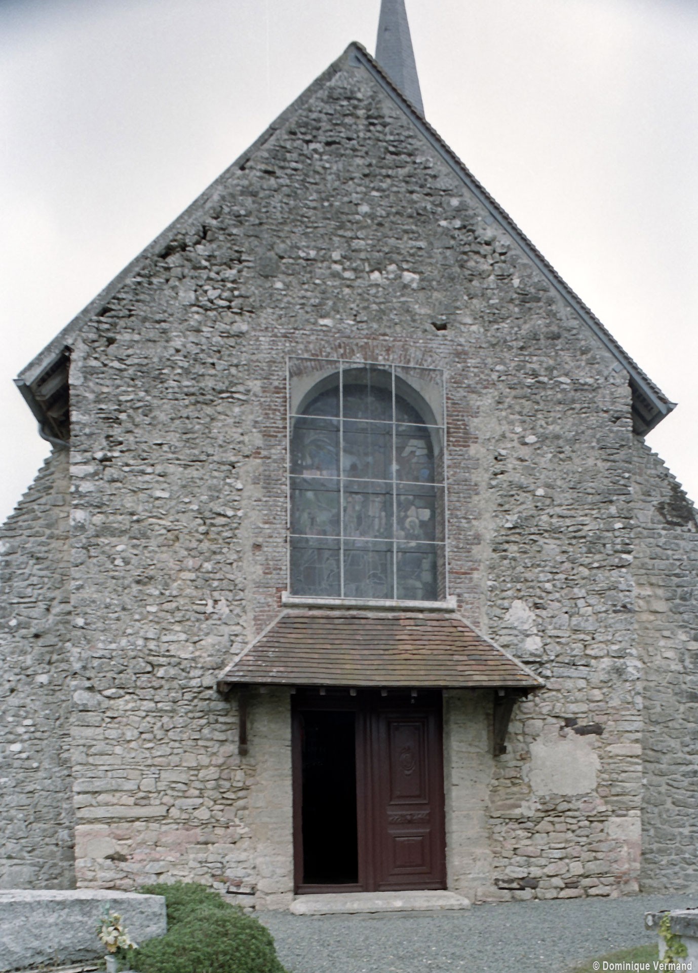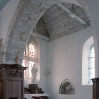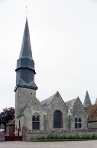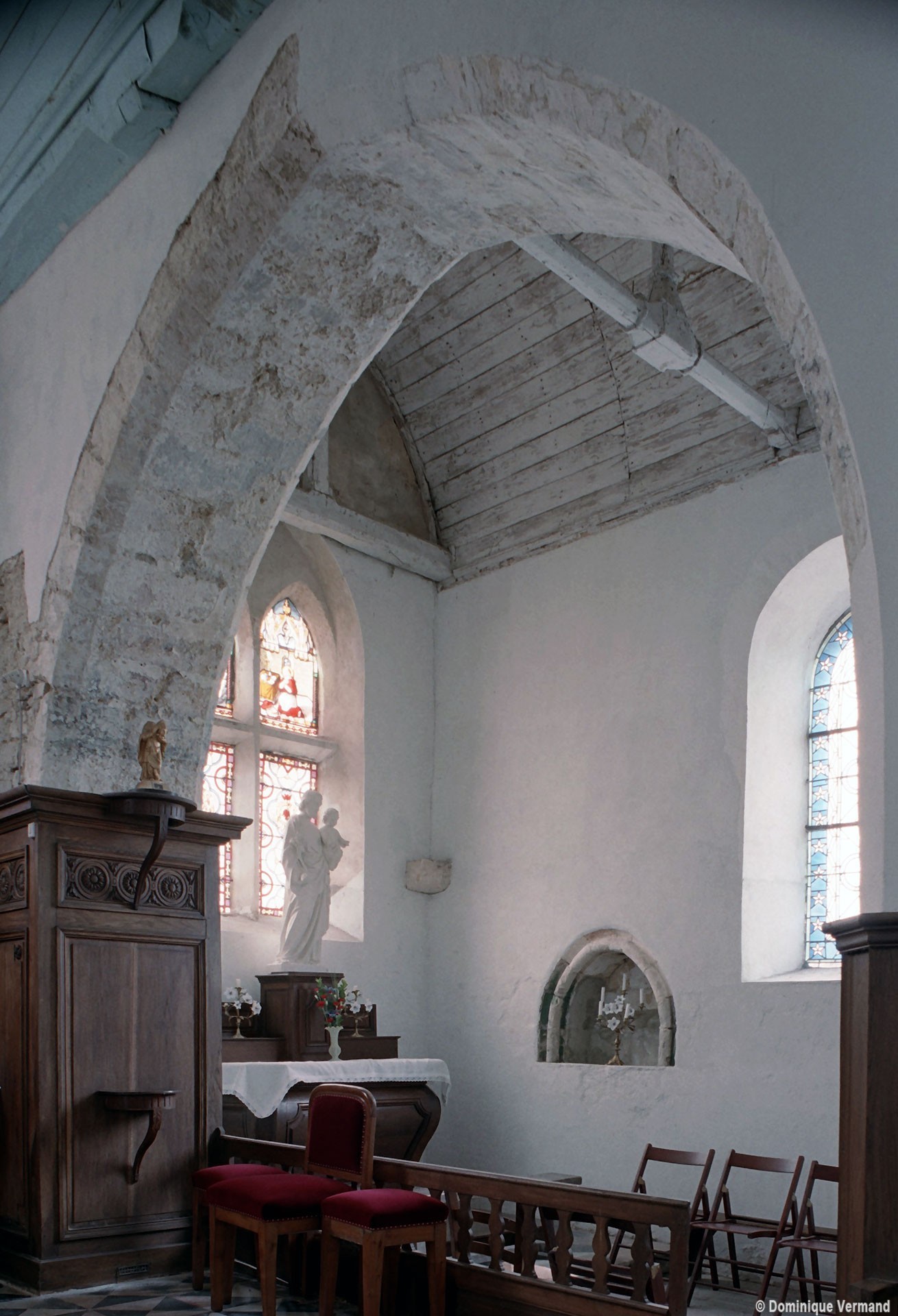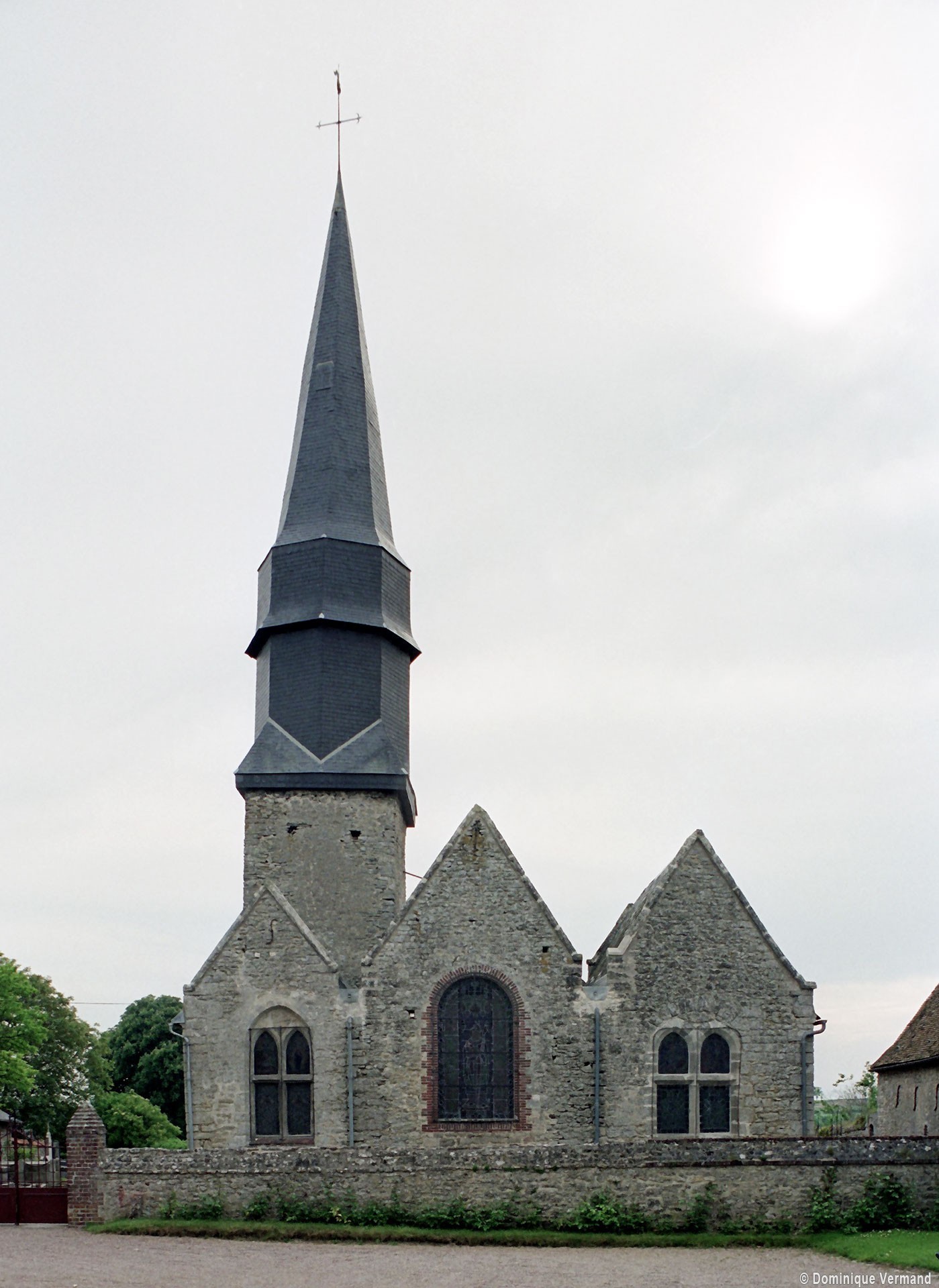 Au 14ème siècle, deux chapelles bâties de part et d’autre du choeur primitif composeront un large chevet plat dont les trois pignons correspondent à autant de toitures indépendantes. Formées de deux lancettes coupées par un meneau horizontal, les deux fenêtres orientales sont caractéristiques du vocabulaire architectural normand et anglais de l’époque et se rencontrent, dans la région, à Hodenc-en-Bray et à Senantes (où le chevet est très similaire). Sans doute bâtie la première, la chapelle sud a conservé sa charpente d’origine, dont le type se retrouve dans la nef.