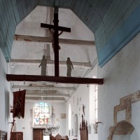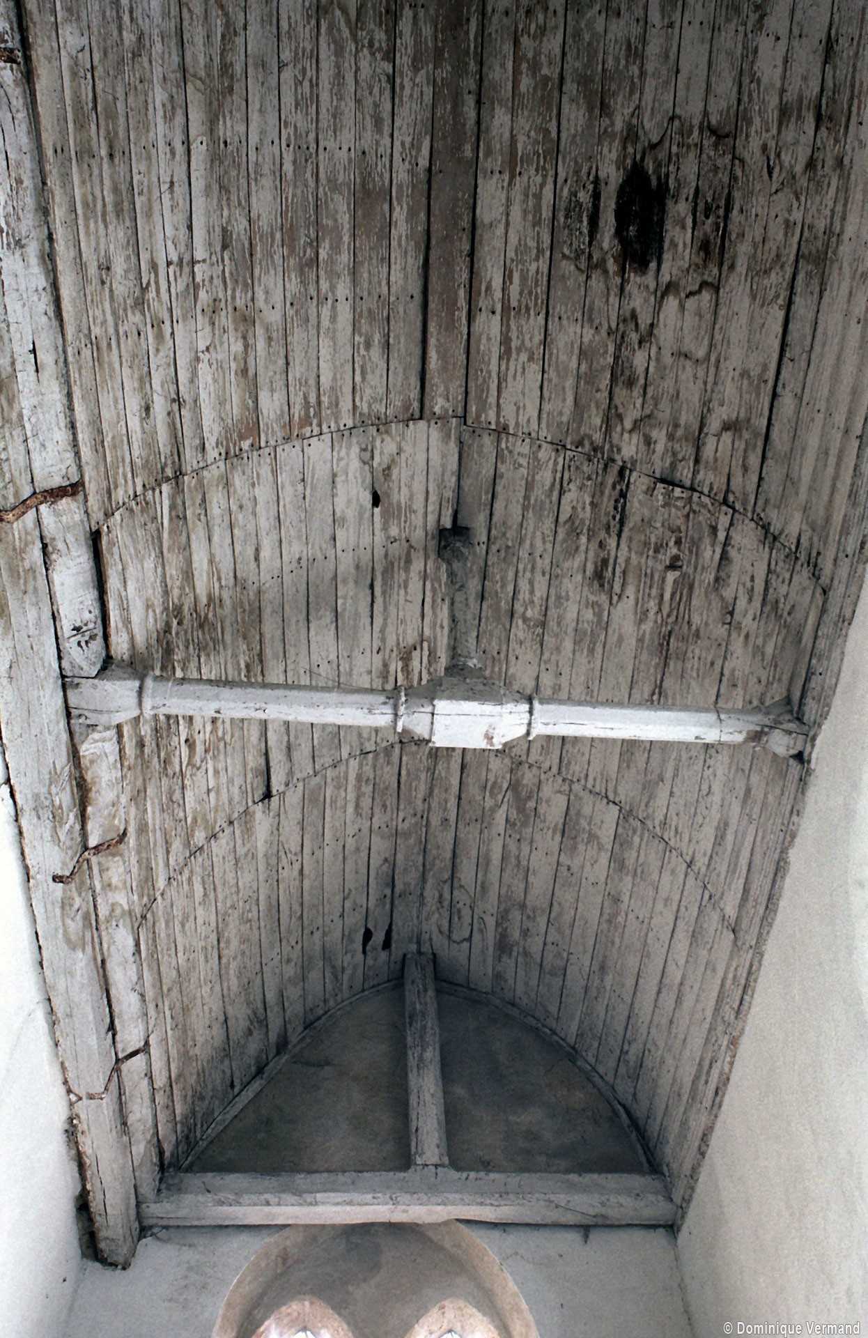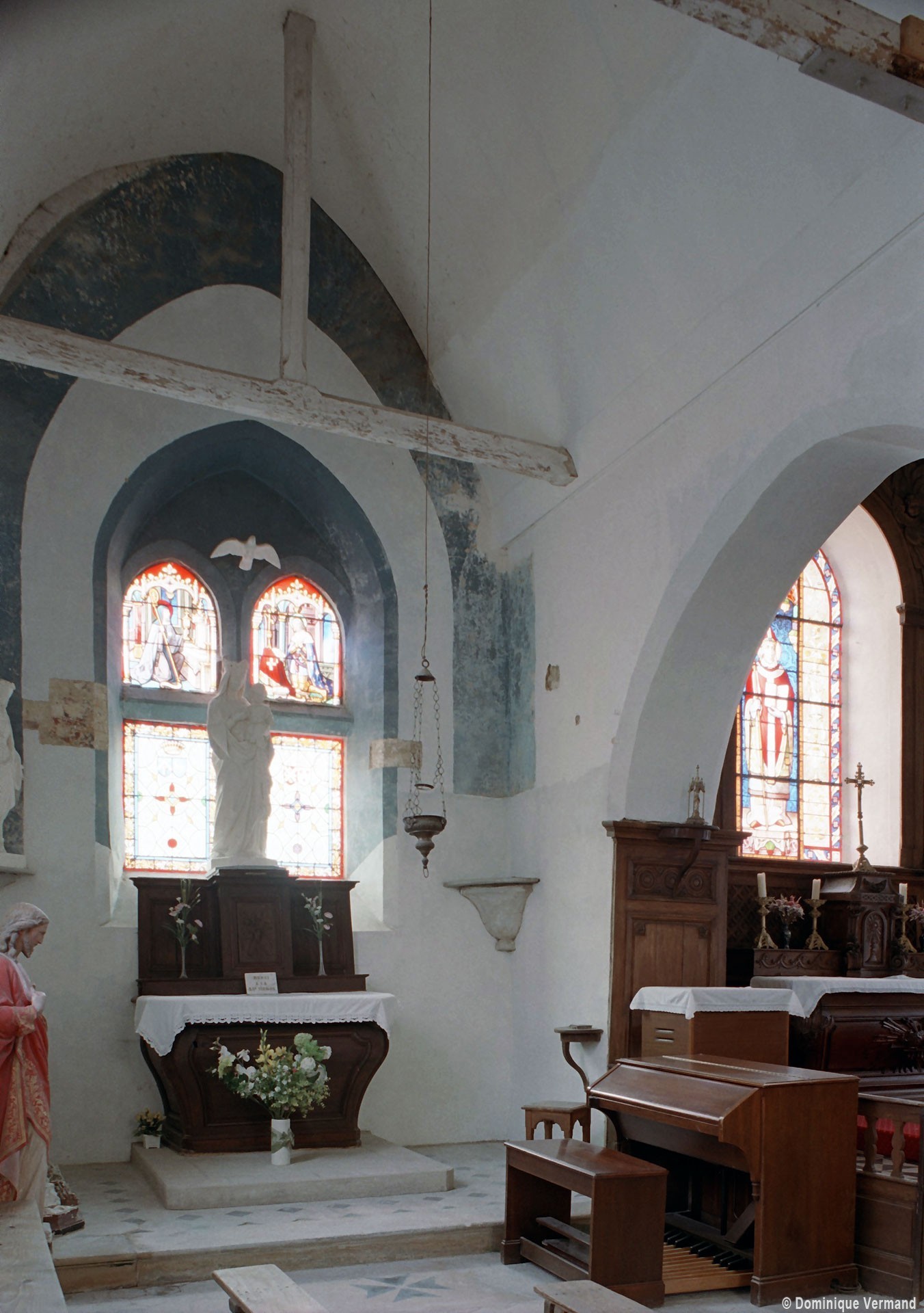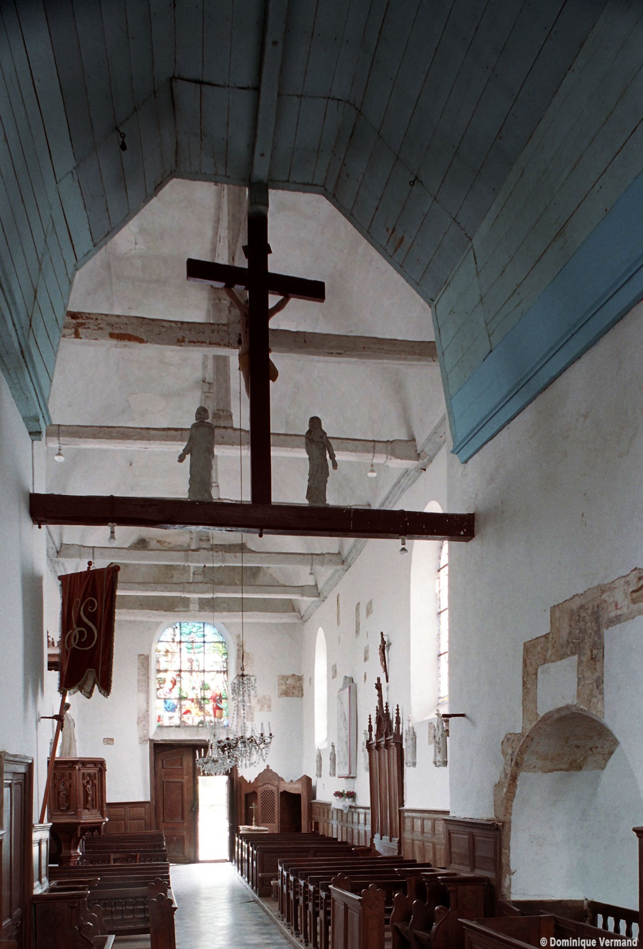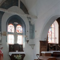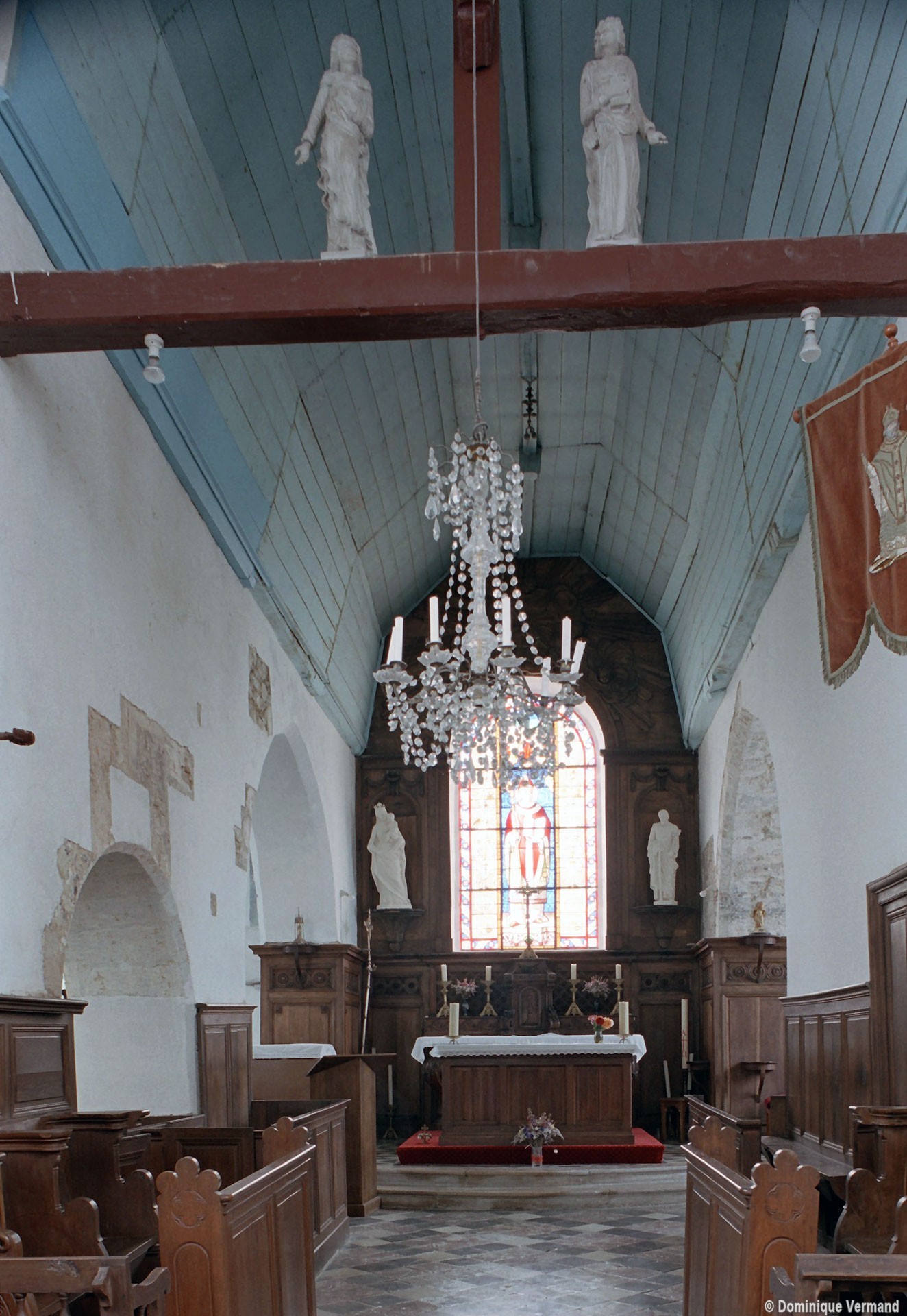 Au 14ème siècle, deux chapelles bâties de part et d’autre du choeur primitif composeront un large chevet plat dont les trois pignons correspondent à autant de toitures indépendantes. Formées de deux lancettes coupées par un meneau horizontal, les deux fenêtres orientales sont caractéristiques du vocabulaire architectural normand et anglais de l’époque et se rencontrent, dans la région, à Hodenc-en-Bray et à Senantes (où le chevet est très similaire). Sans doute bâtie la première, la chapelle sud a conservé sa charpente d’origine, dont le type se retrouve dans la nef.