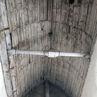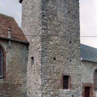 C’est peu après qu’un clocher sera construit au sud, dans l’angle formé par la nef et le choeur. Privé de l’étage de son beffroi, remplacé au 16ème siècle par la flèche actuelle, c’est une haute tour dont les maçonneries sont semblables à celles de la nef. On note la présence de trous de boulins d’origine, orifices qui permettaient d’arrimer les échafaudages lors de la construction et que l’on laissait pour d’éventuelles réparations.
