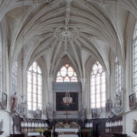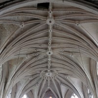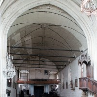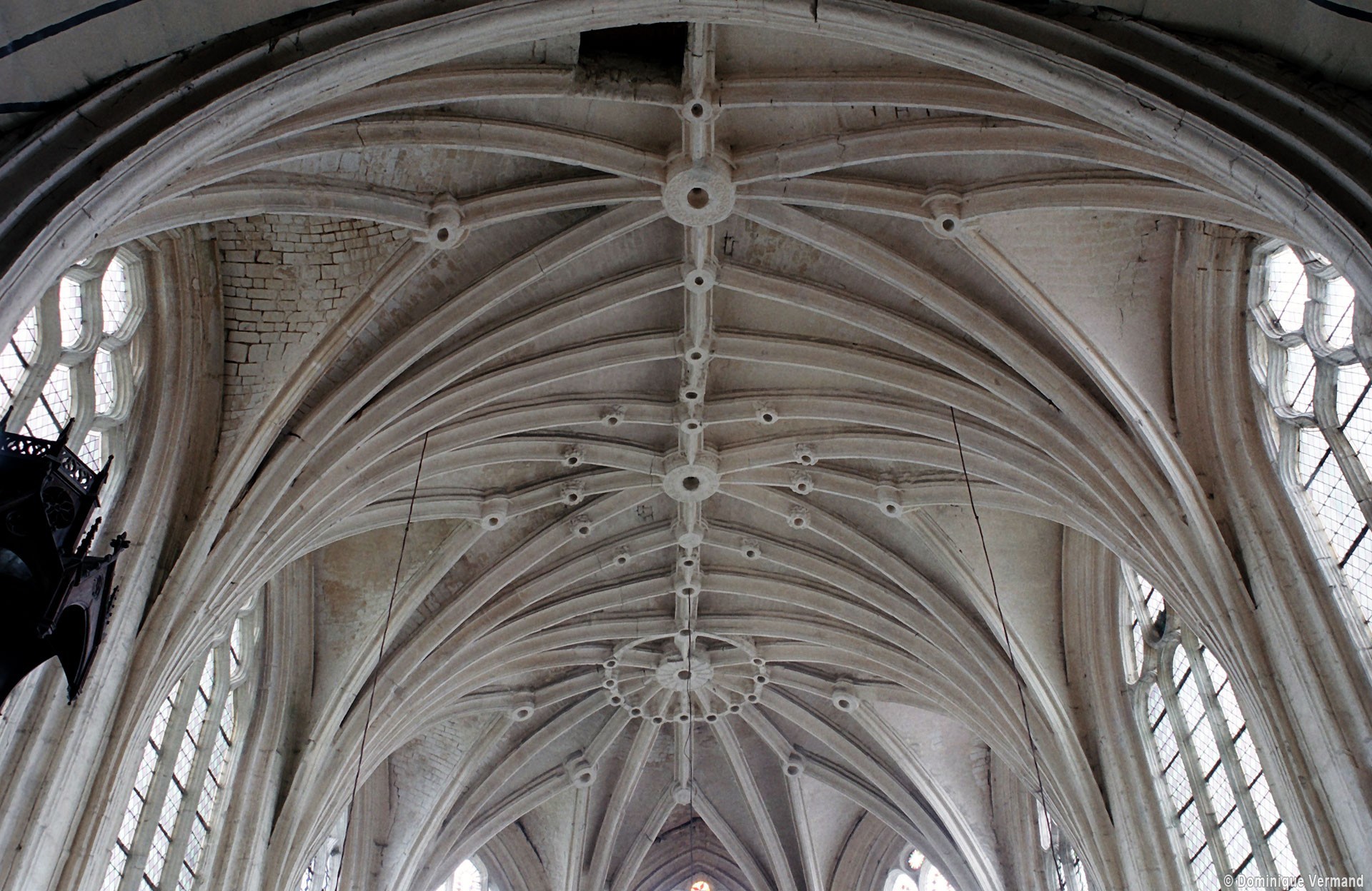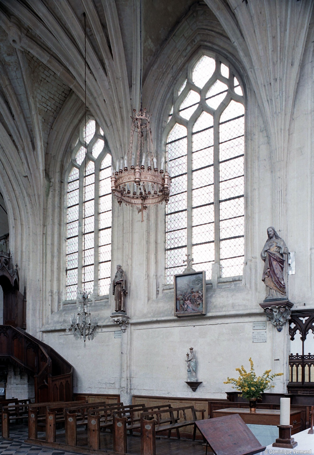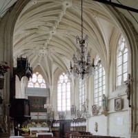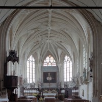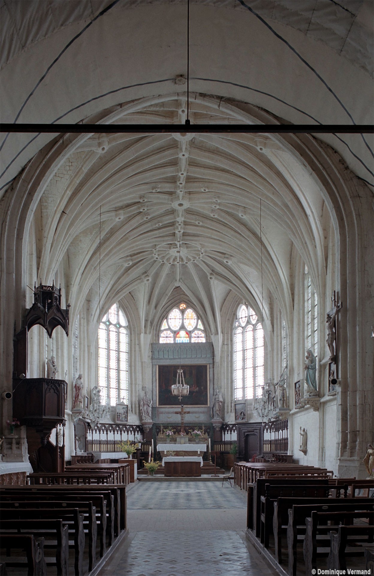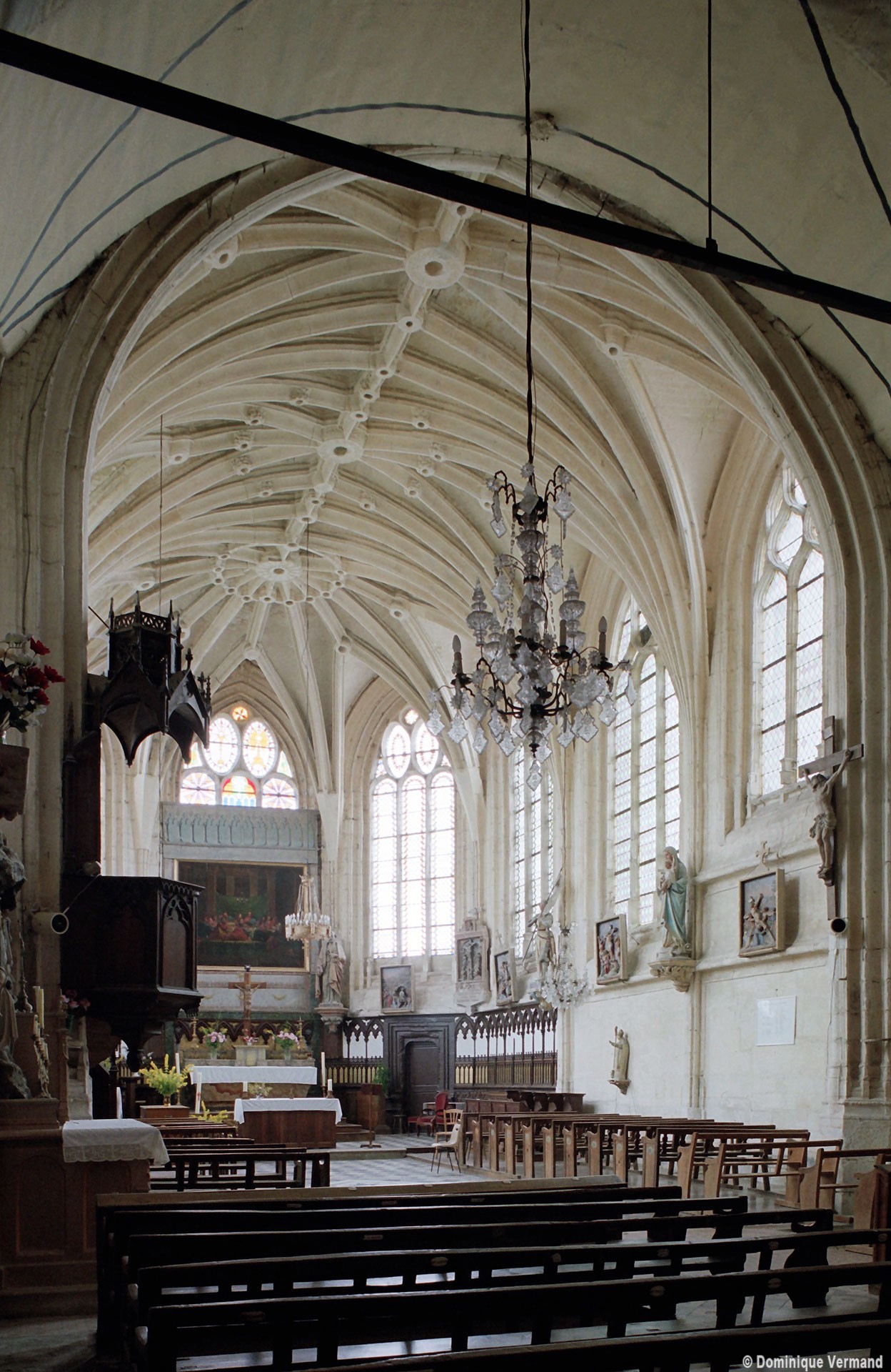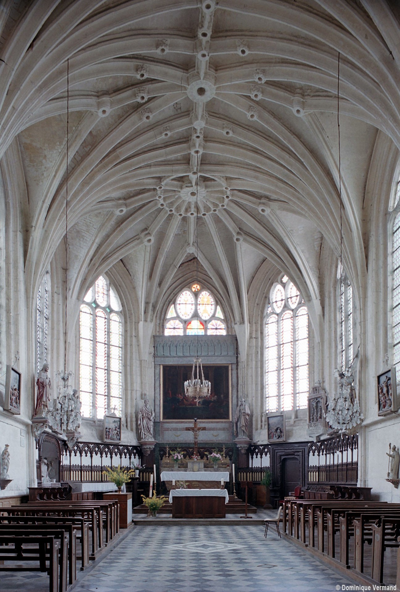 Ce dernier est incontestablement la partie la plus remarquable de l’édifice et doit sans doute sa richesse à la générosité de la famille de Barentin, titulaire de la seigneurie du lieu. Très homogène, il comprend deux travées droites et une abside pentagonale. C’est, bien sûr, le magnifique réseau des voûtes qui frappe d’emblée. A la croisée d’ogives s’ajoutent ici, et systématiquement, des liernes et des tiercerons (nervures secondaires) qui en font un exemple particulièrement représentatif des voûtes de la fin du gothique. De très nombreuses clefs pendantes ou garnies d’écussons, dessinant notamment des couronnes dans la seconde travée et l’abside, enrichissaient autrefois le réseau.