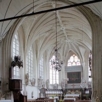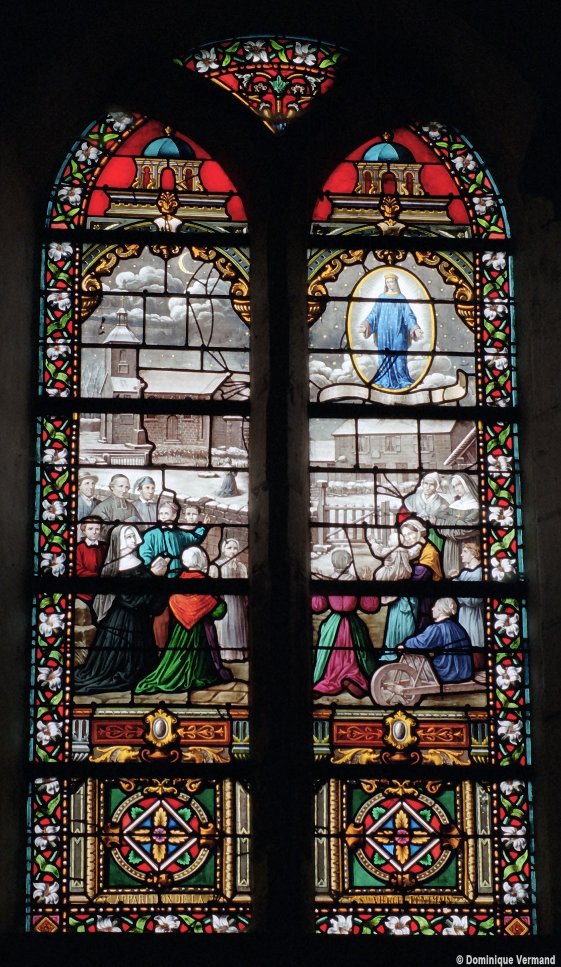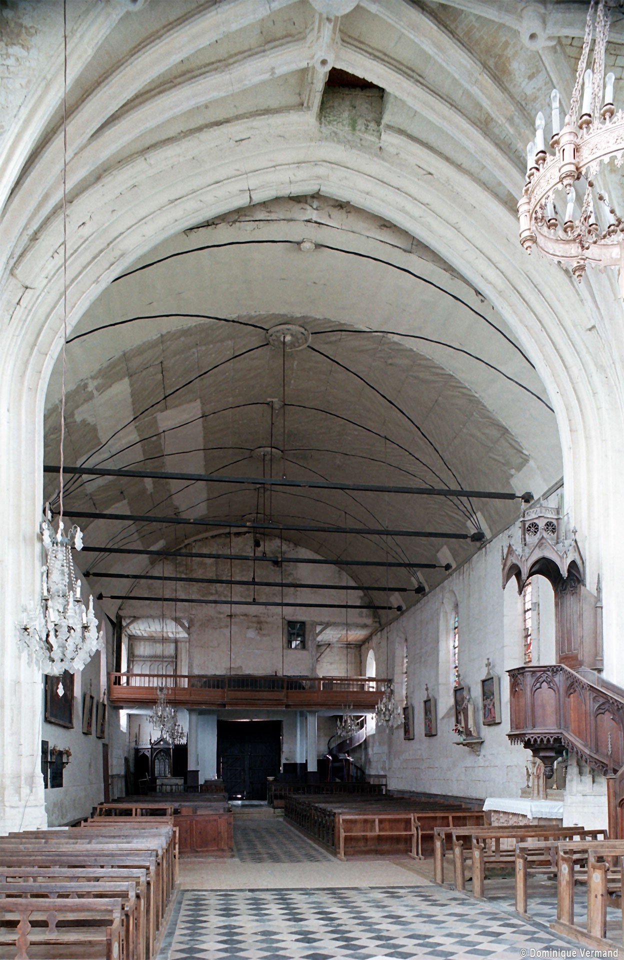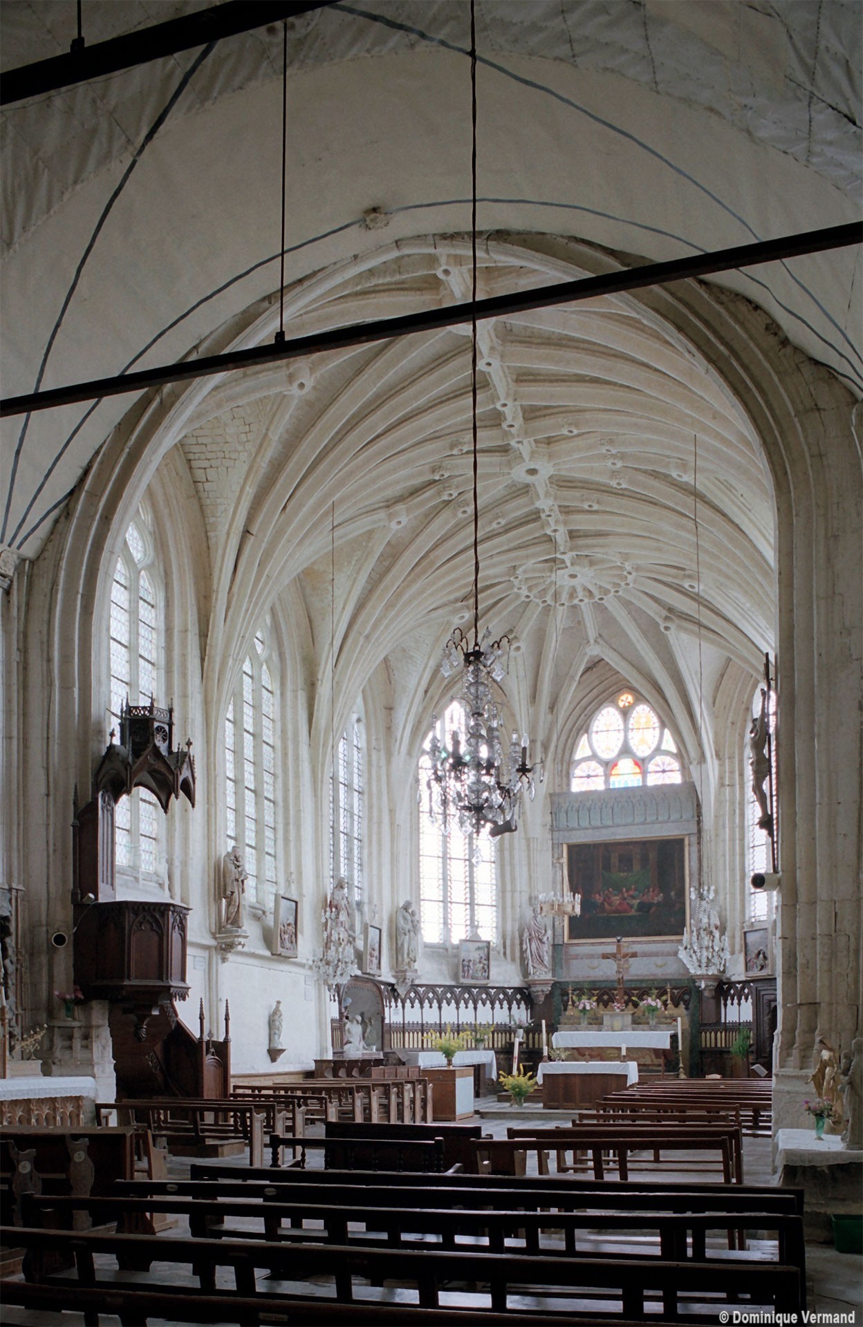 Homogène et solidement construite en pierres bien appareillées, la nef est de 1770, une date qui s’accorde bien avec le sobre décor de pilastres et de niches de la façade. Du mobilier on retiendra, dans le chœur, un petit bas-relief en bois représentant la Crucifixion, quatre hauts-reliefs anglais, en albâtre, de la seconde moitié du 15ème siècle, incrustés dans le retable du maître-autel et, dans la nef, une intéressante série de six vitraux consacrés aux Apparitions de la Vierge (1876) (2005, modifié 2017).