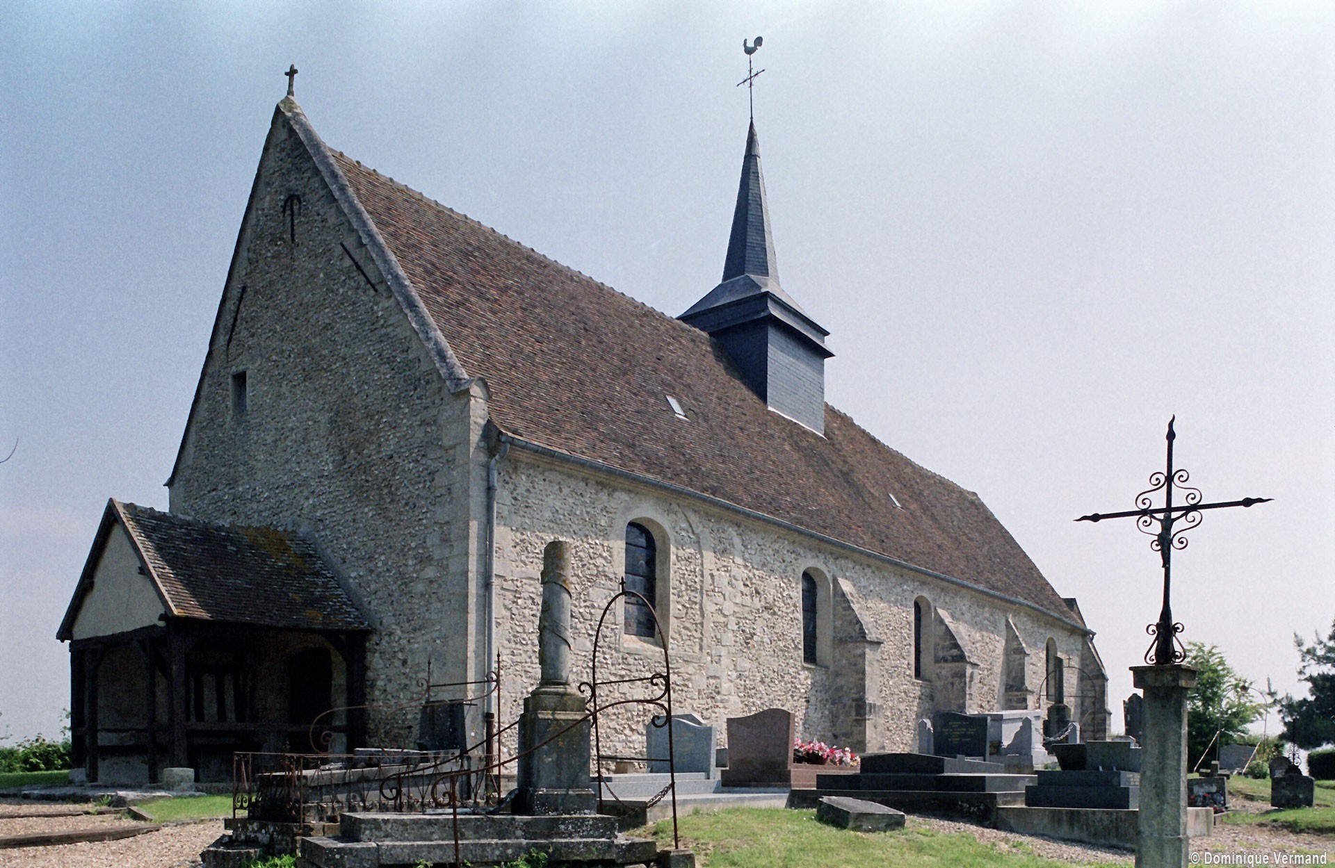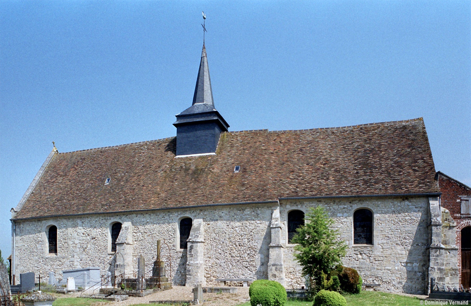 Un nouvel édifice est dédicacé en 1519, incorporant peut-être des éléments plus anciens ainsi que l’attestent certains contreforts. Sans caractère particulier, l’église associe, en un long rectangle, une nef unique et un chœur à peine moins large. Les maçonneries portent la trace de divers collages et réparations qui s’échelonnent tout au long des 16ème (la date de 1554 – ou 1557- est gravée au portail) 17ème et 18ème siècles (inscription indiquant des réparations effectuées en 1782 par les Carmélites de Gisors). Simplement plafonné, l’intérieur, remarquablement restauré et entretenu, mérite l’intérêt pour son ensemble mobilier très complet (2003).