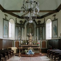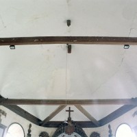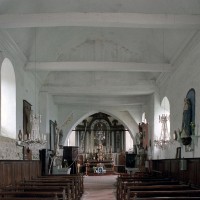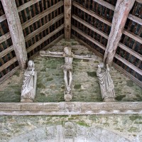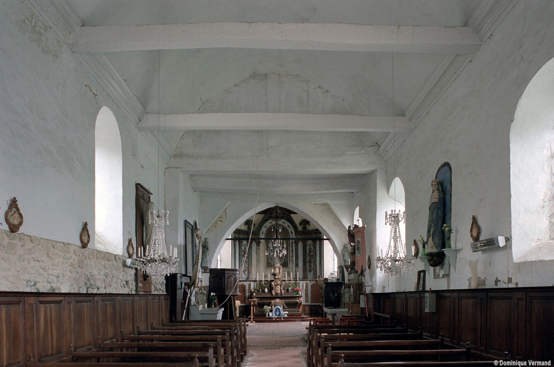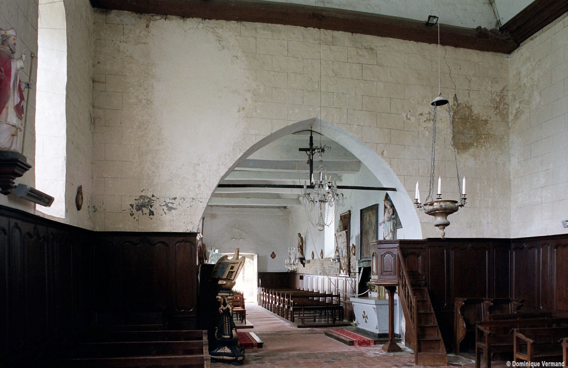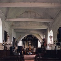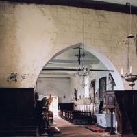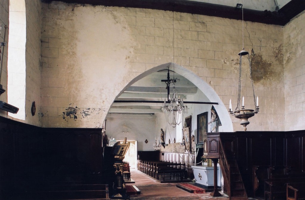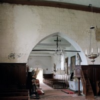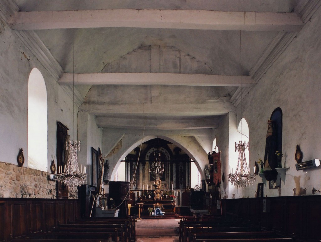 A l’intérieur, s’il n’y a guère à dire de la nef, qu’une arcade brisée assez basse met en communication avec le choeur, on admirera la belle charpente de ce dernier. Egalement du 16ème siècle, elle comporte deux entraits avec engoulants. Sous le petit porche sans date qui précède la nef ont été remontés les éléments de l’ancienne poutre de gloire et, à l’intérieur, on remarquera un Saint-Martin de la fin du 15ème siècle et un très beau lutrin de la seconde moitié du 18ème siècle (2007).