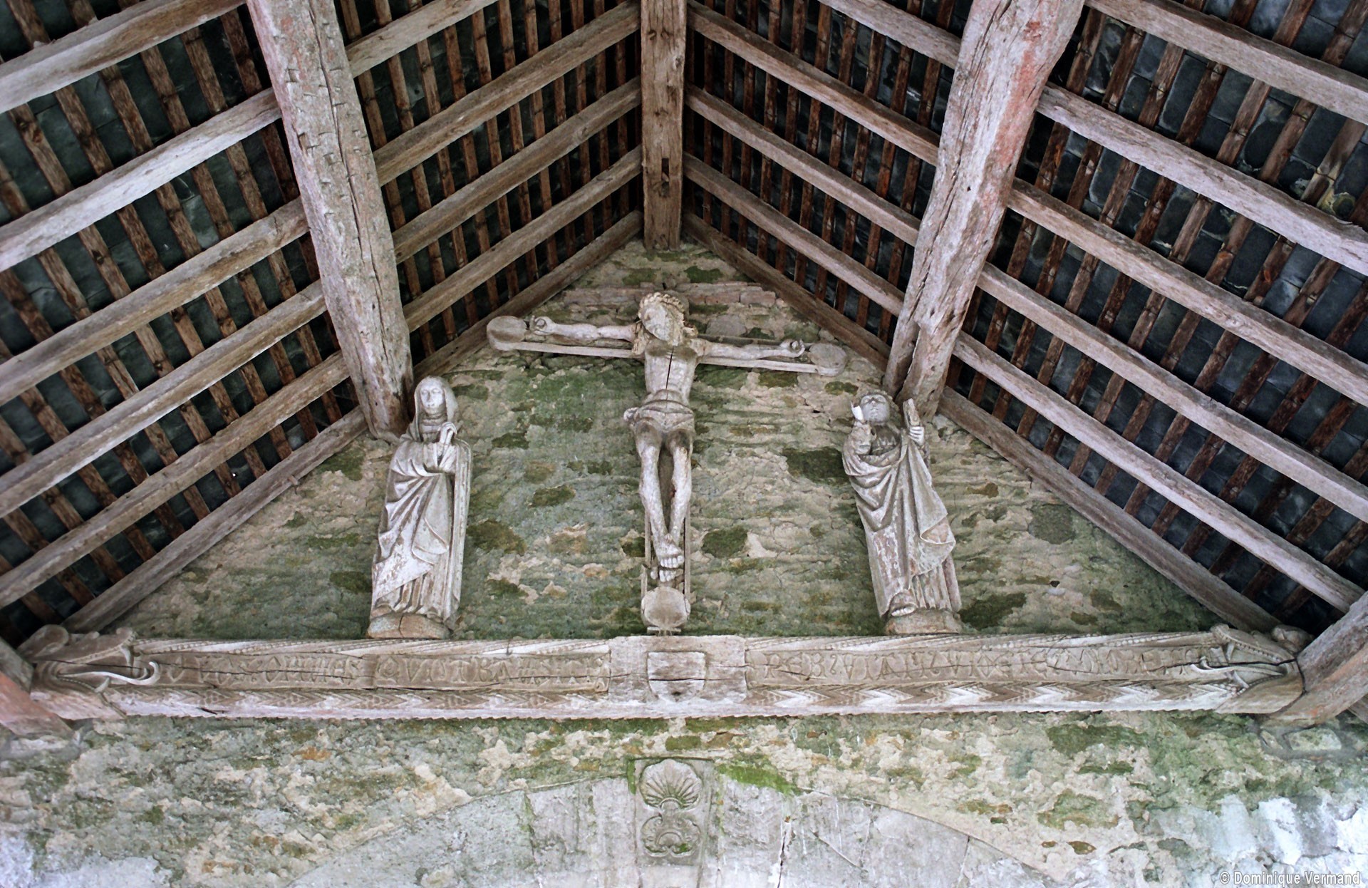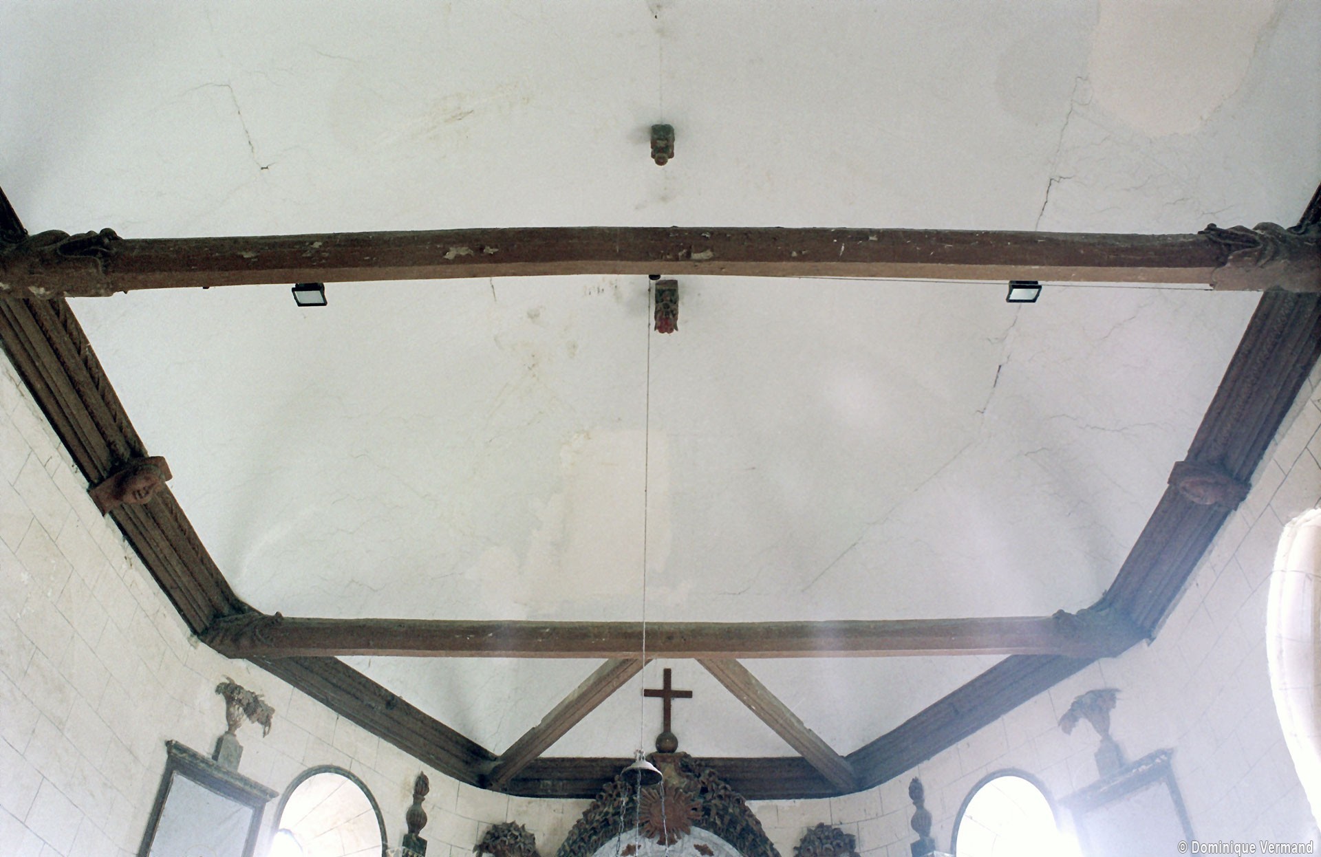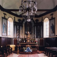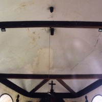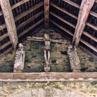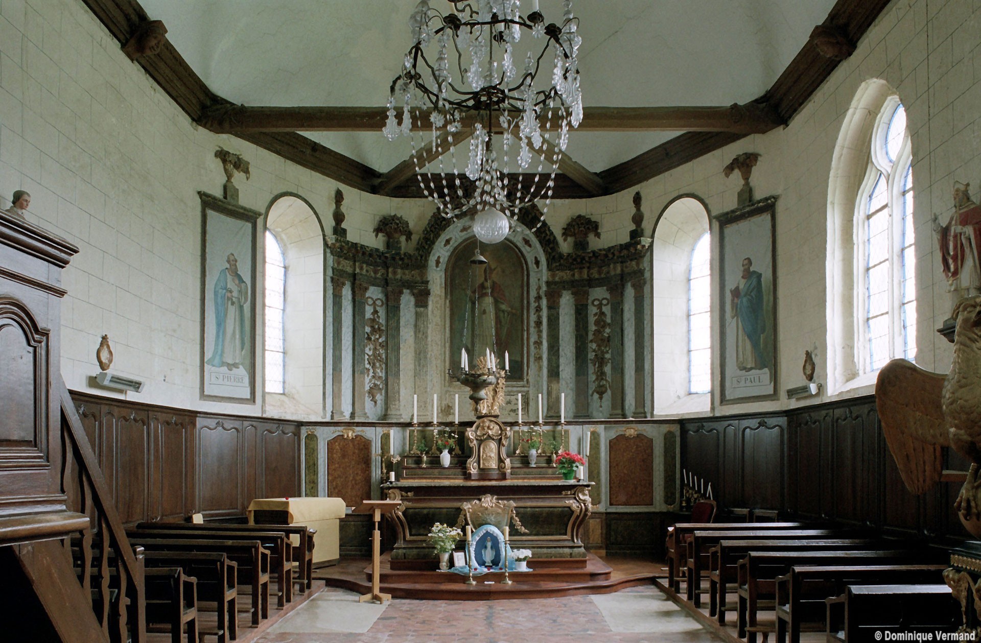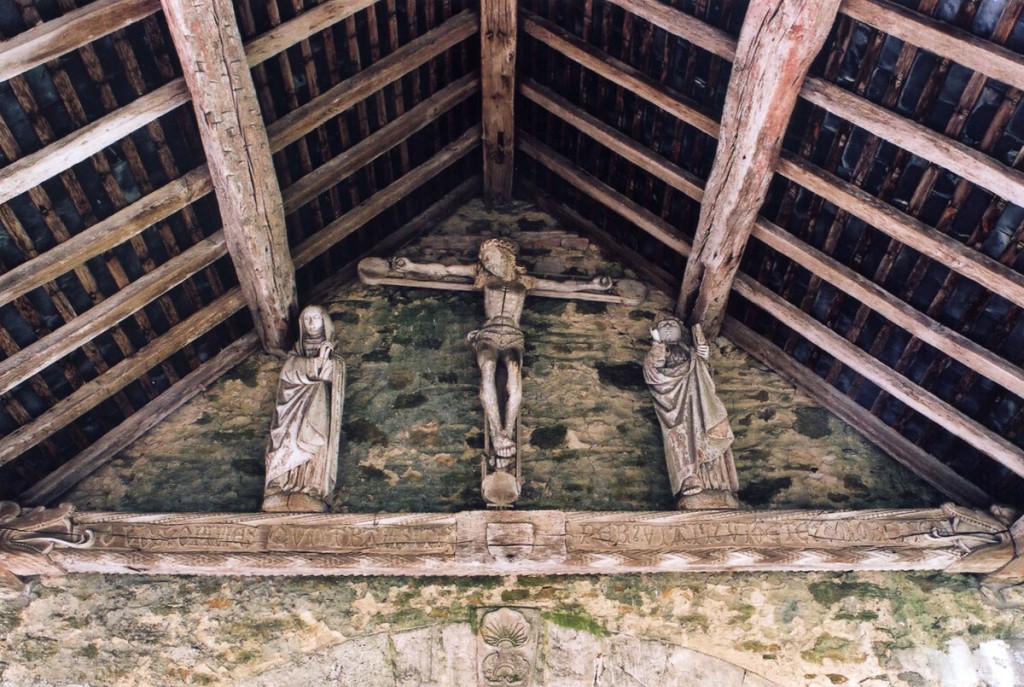 A l’intérieur, s’il n’y a guère à dire de la nef, qu’une arcade brisée assez basse met en communication avec le choeur, on admirera la belle charpente de ce dernier. Egalement du 16ème siècle, elle comporte deux entraits avec engoulants. Sous le petit porche sans date qui précède la nef ont été remontés les éléments de l’ancienne poutre de gloire et, à l’intérieur, on remarquera un Saint-Martin de la fin du 15ème siècle et un très beau lutrin de la seconde moitié du 18ème siècle (2007).