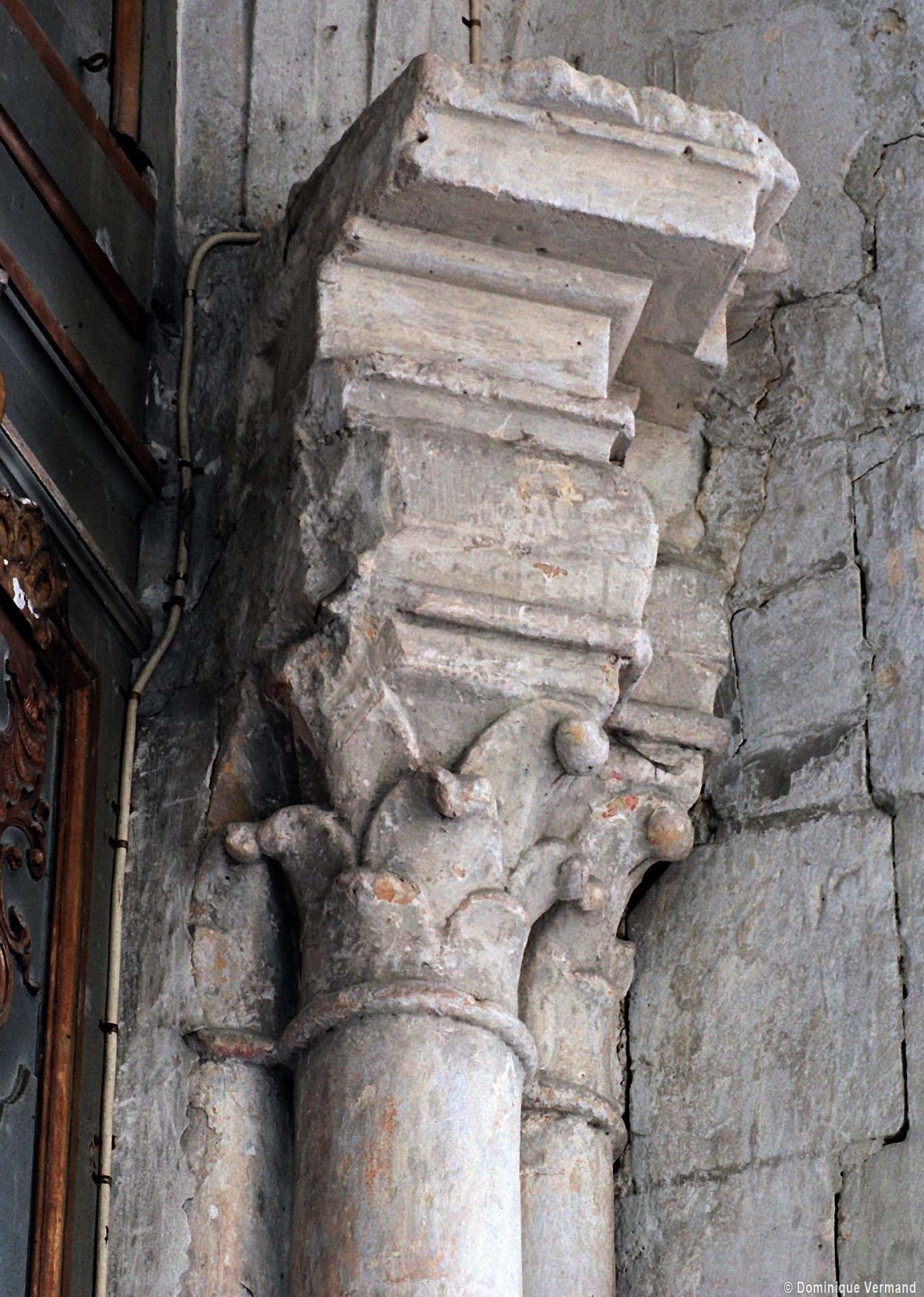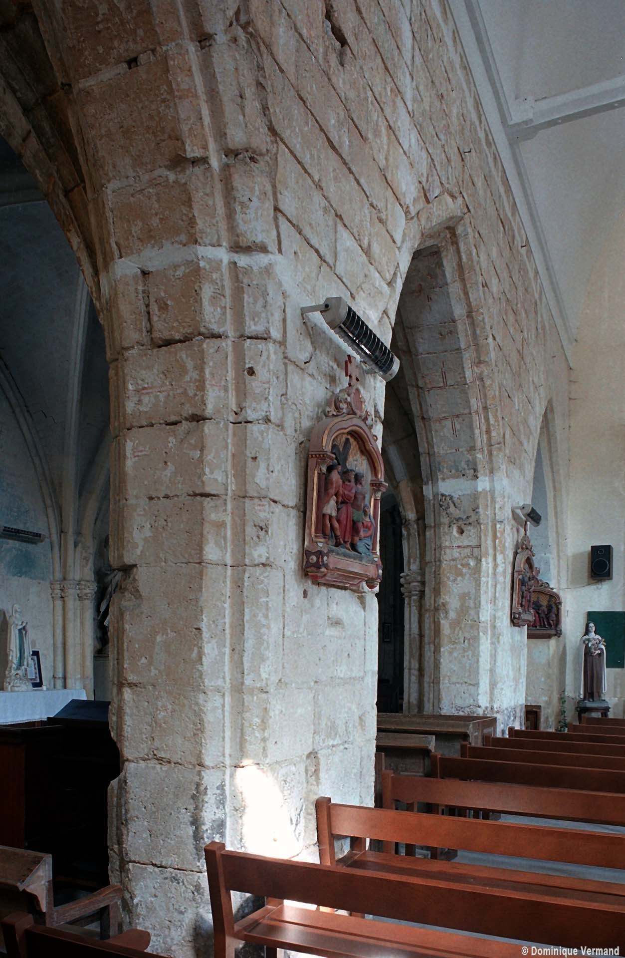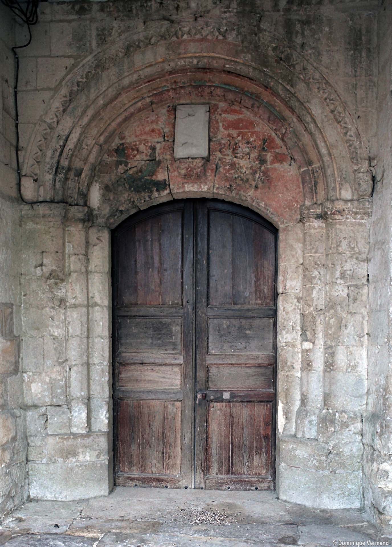 C’est un édifice extrêmement compliqué où presque toutes les époques se retrouvent. Comme souvent, la petite nef unique est la partie la plus ancienne, sans doute du 11ème siècle comme le montrent la maçonnerie et un contrefort plat de son mur sud. La pente du toit primitif, beaucoup plus faible que l’actuelle, se lit encore dans le pignon de la façade. Avec son archivolte en plein cintre décorée d’étoiles, le portail résulte d’une première modification au siècle suivant.