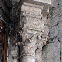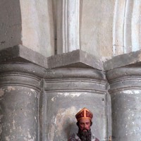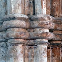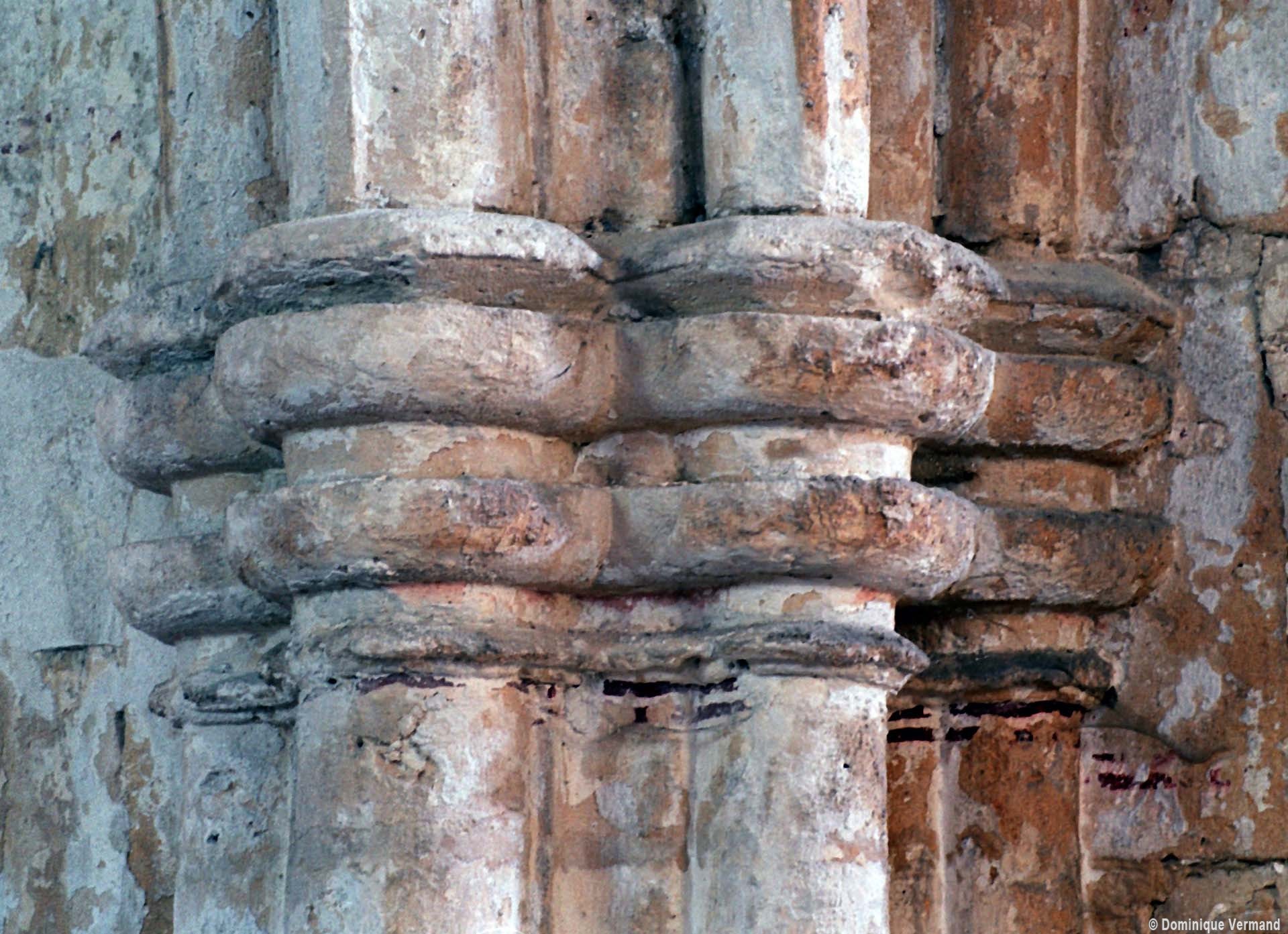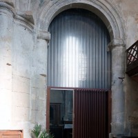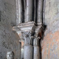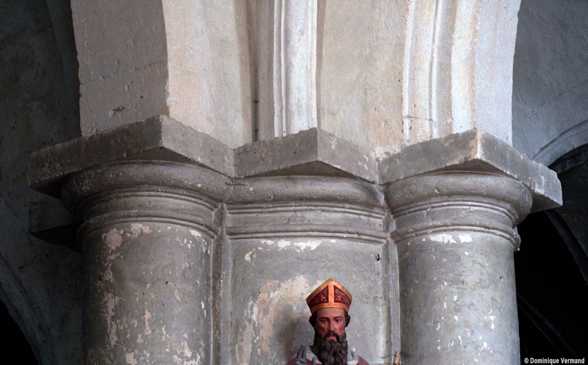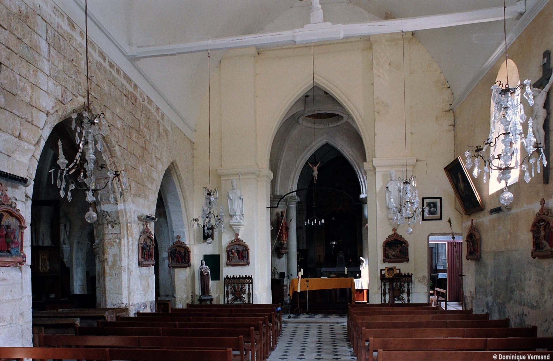 C’est un édifice extrêmement compliqué où presque toutes les époques se retrouvent. Comme souvent, la petite nef unique est la partie la plus ancienne, sans doute du 11ème siècle comme le montrent la maçonnerie et un contrefort plat de son mur sud. La pente du toit primitif, beaucoup plus faible que l’actuelle, se lit encore dans le pignon de la façade. Avec son archivolte en plein cintre décorée d’étoiles, le portail résulte d’une première modification au siècle suivant.