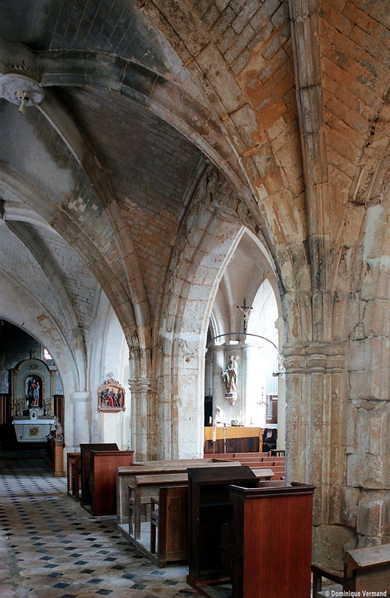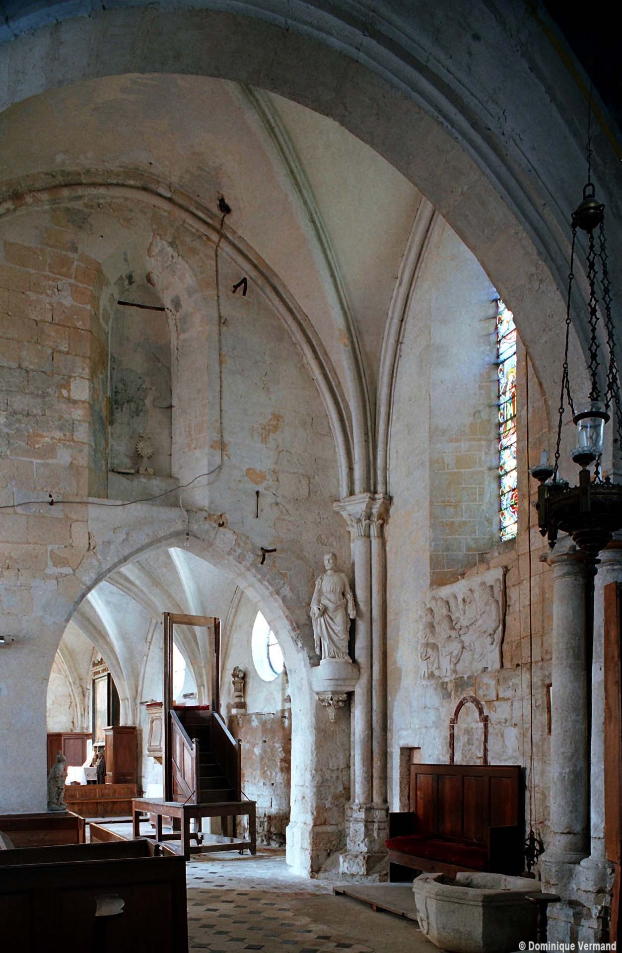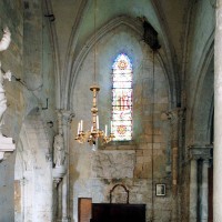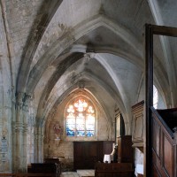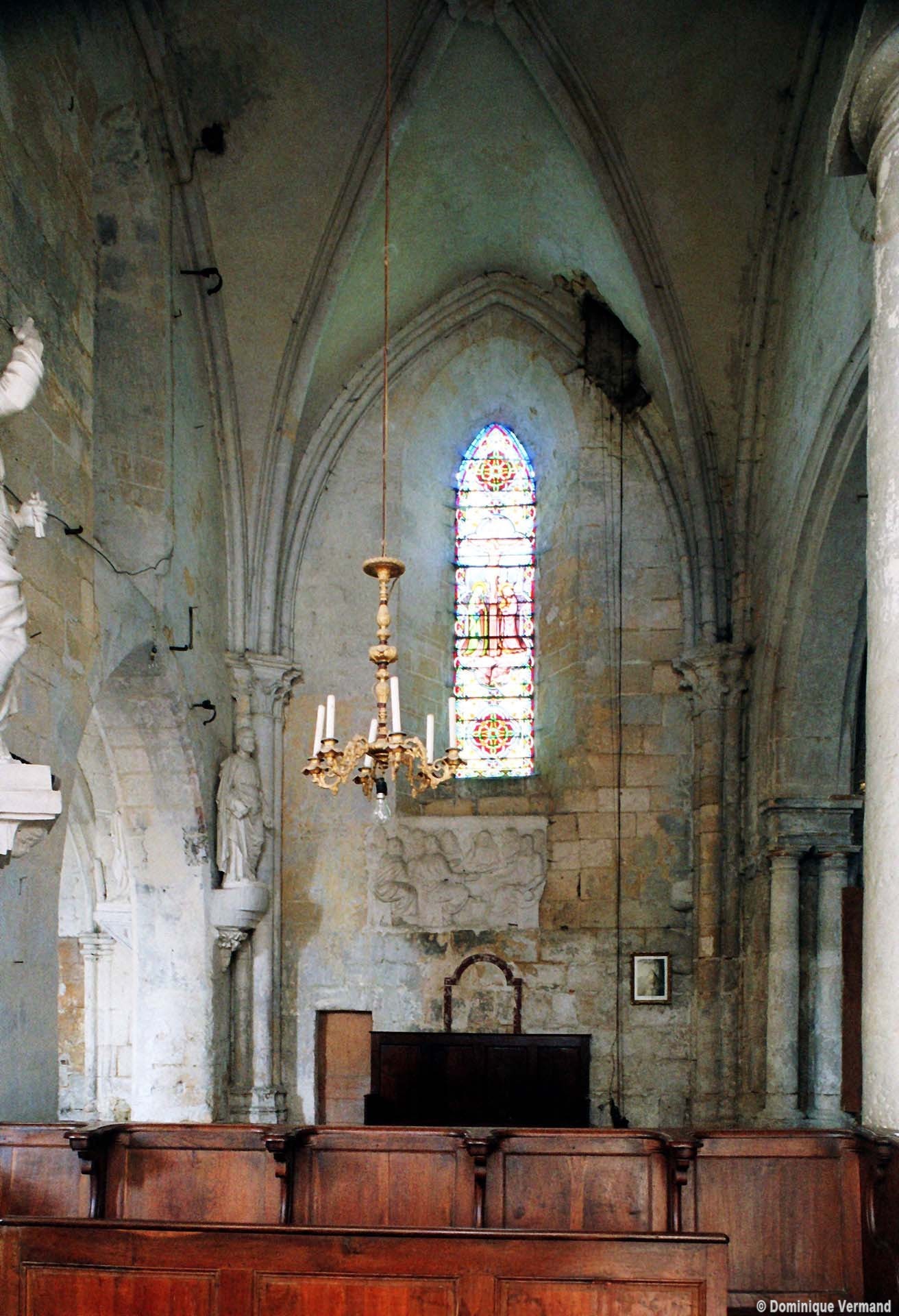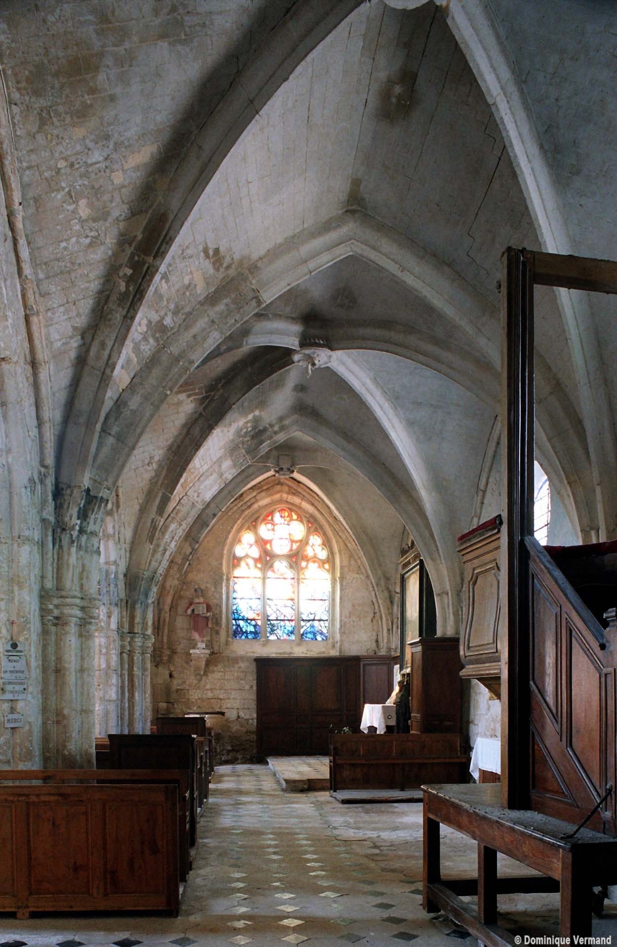 Mais c’est vers 1200 que l’église connaît sa première transformation importante avec la reconstruction des parties orientales, désormais constituées d’un transept saillant et d’un chœur à chevet plat. Le bras nord est la seule partie bien conservée de cet ensemble, largement modifié par la suite. Les ogives et formerets de la voûte retombent sur des faisceaux de colonnettes par l’intermédiaire de chapiteaux à crochets et les fenêtres sont de simples lancettes, dont une, traitée avec raffinement, est également visible au croisillon sud.