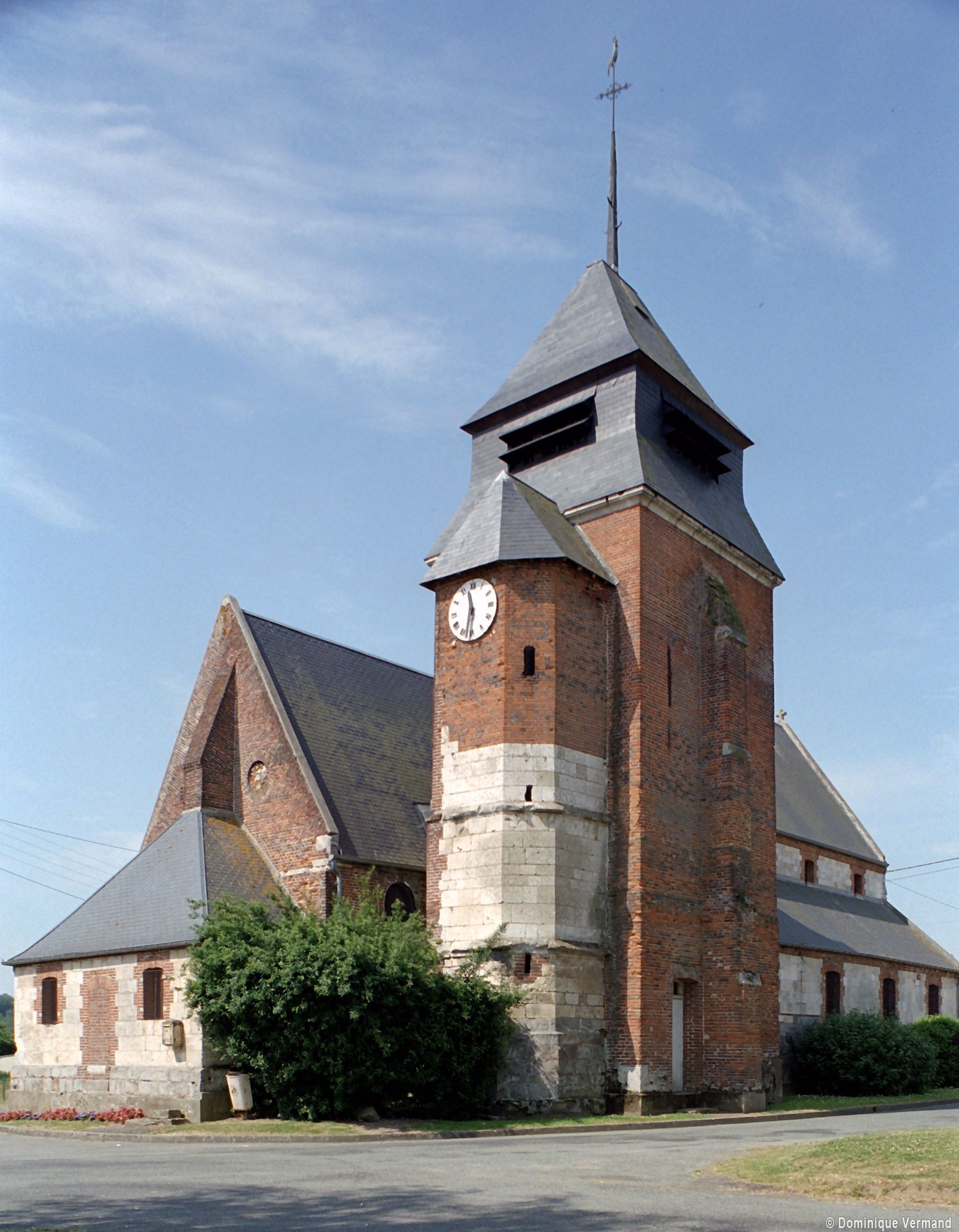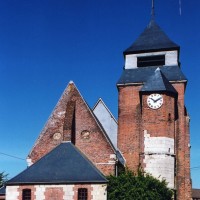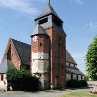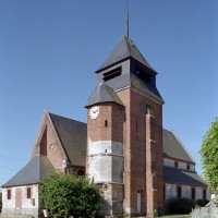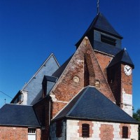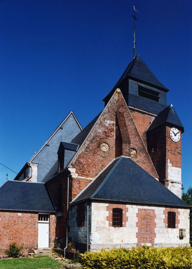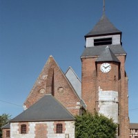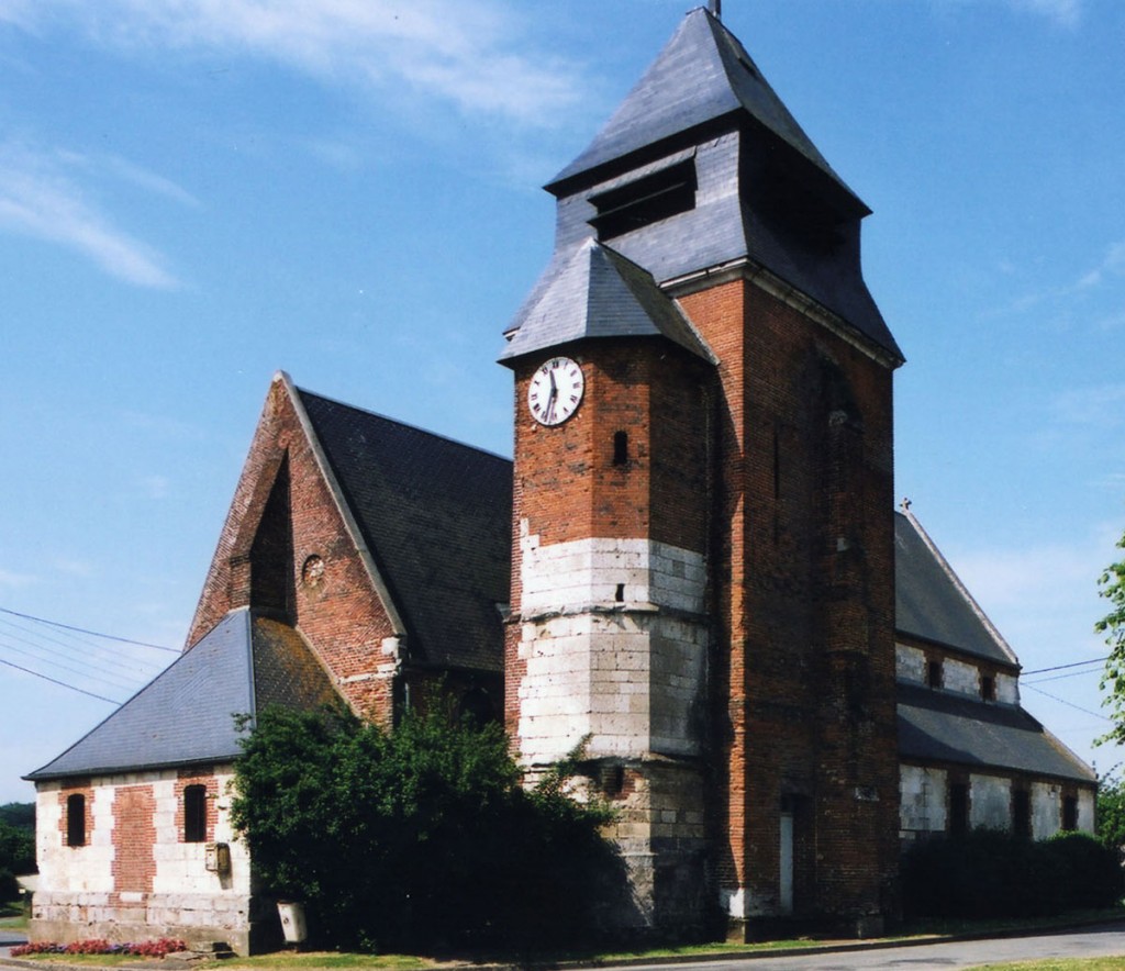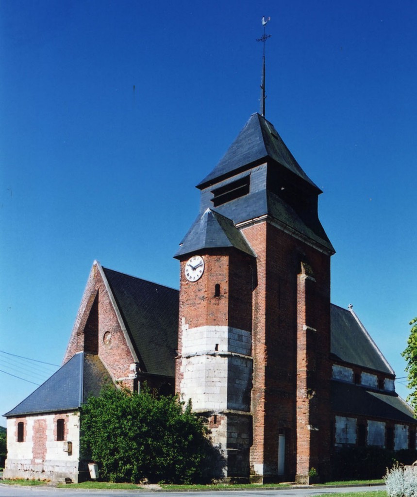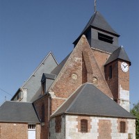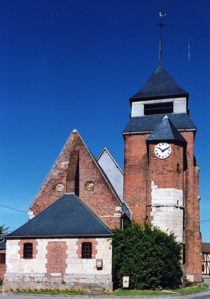 Dominé par la puissante masse de son clocher en briques que termine un étage de beffroi en charpente et ardoises, Saint-Jean-Baptiste est un édifice assez vaste, à l’histoire monumentale complexe. L’élément le plus ancien, en pierre crayeuse, est constitué par une partie de la tourelle d’escalier de l’actuel clocher, qui est du 16ème siècle. Tout ce secteur, qui comprend également le nord du choeur, montre de nombreuses traces de collages et de réparations.