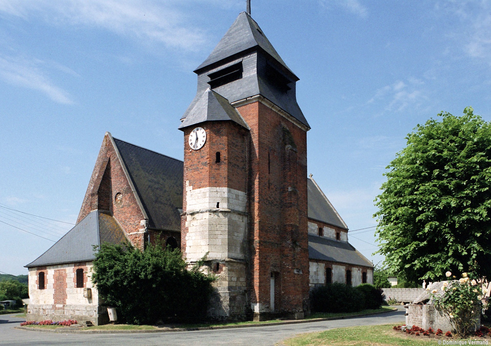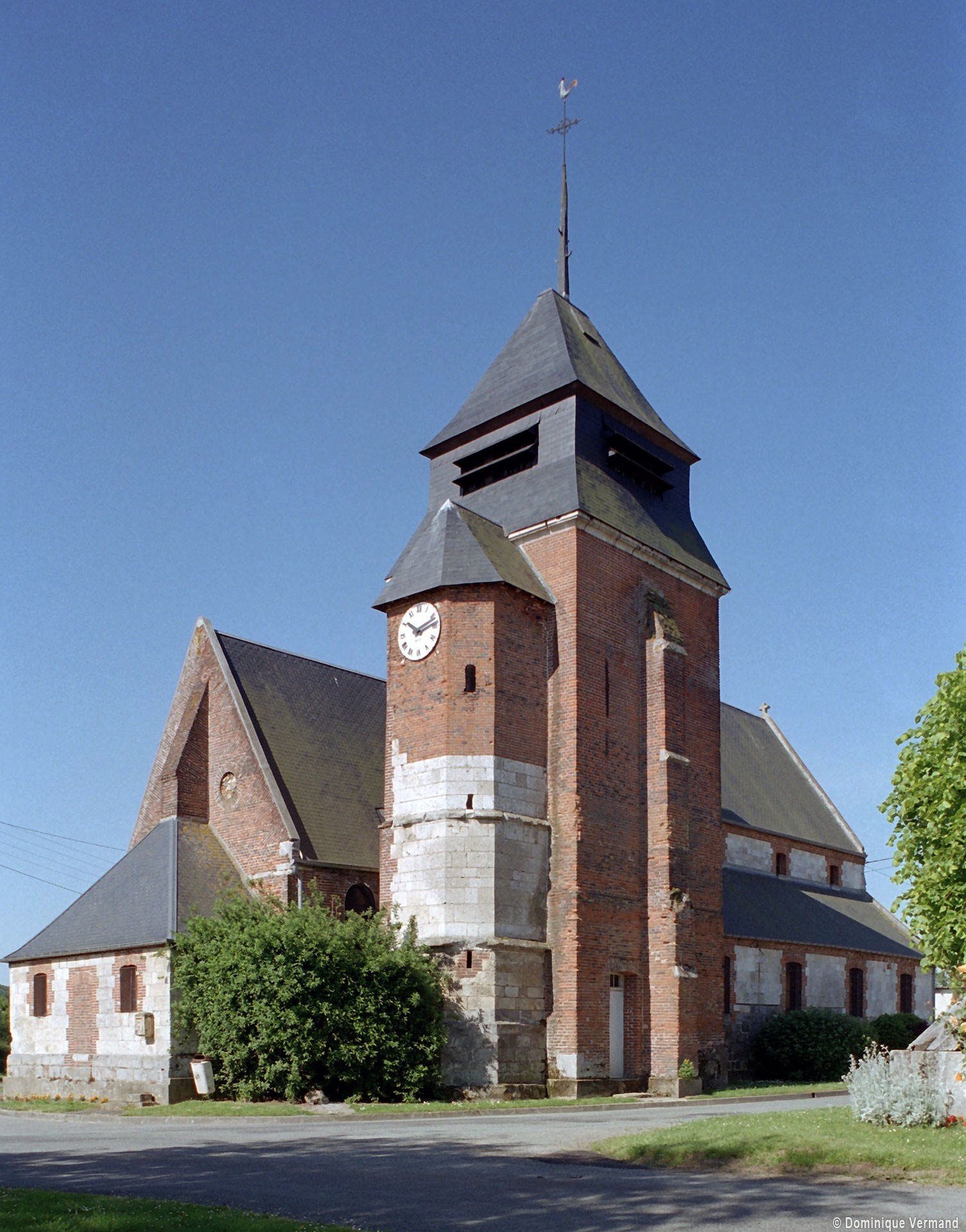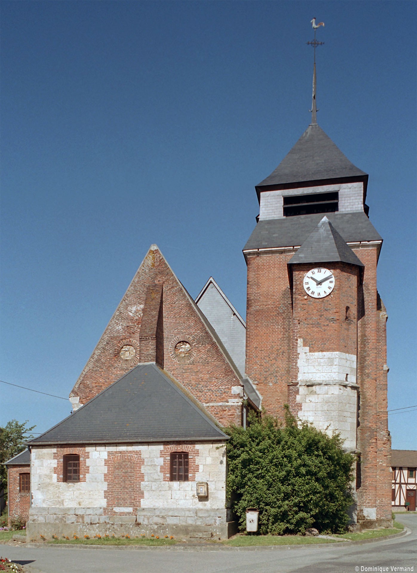 Dominé par la puissante masse de son clocher en briques que termine un étage de beffroi en charpente et ardoises, Saint-Jean-Baptiste est un édifice assez vaste, à l’histoire monumentale complexe. L’élément le plus ancien, en pierre crayeuse, est constitué par une partie de la tourelle d’escalier de l’actuel clocher, qui est du 16ème siècle. Tout ce secteur, qui comprend également le nord du choeur, montre de nombreuses traces de collages et de réparations.