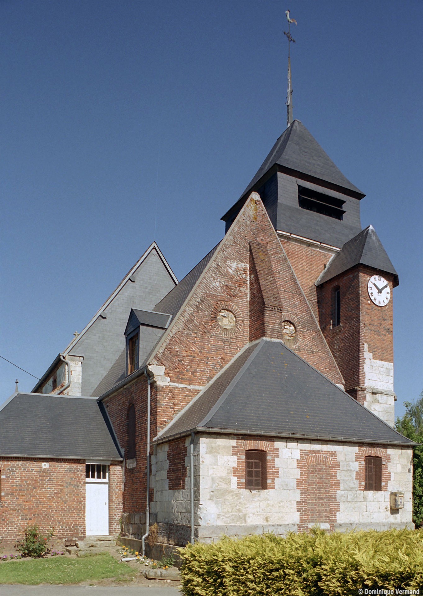 Pour le reste, le clocher et le choeur à chevet plat forment un ensemble plus ou moins homogène, bâti en briques, pour lequel la date de 1662, signalée par Graves, peut convenir. La base du clocher est couverte d’une voûte d’ogives, avec clef sculptée, dont les nervures sont reçues sur des culs-de-lampe. Le choeur doit se contenter d’un simple lambris en berceau brisé.