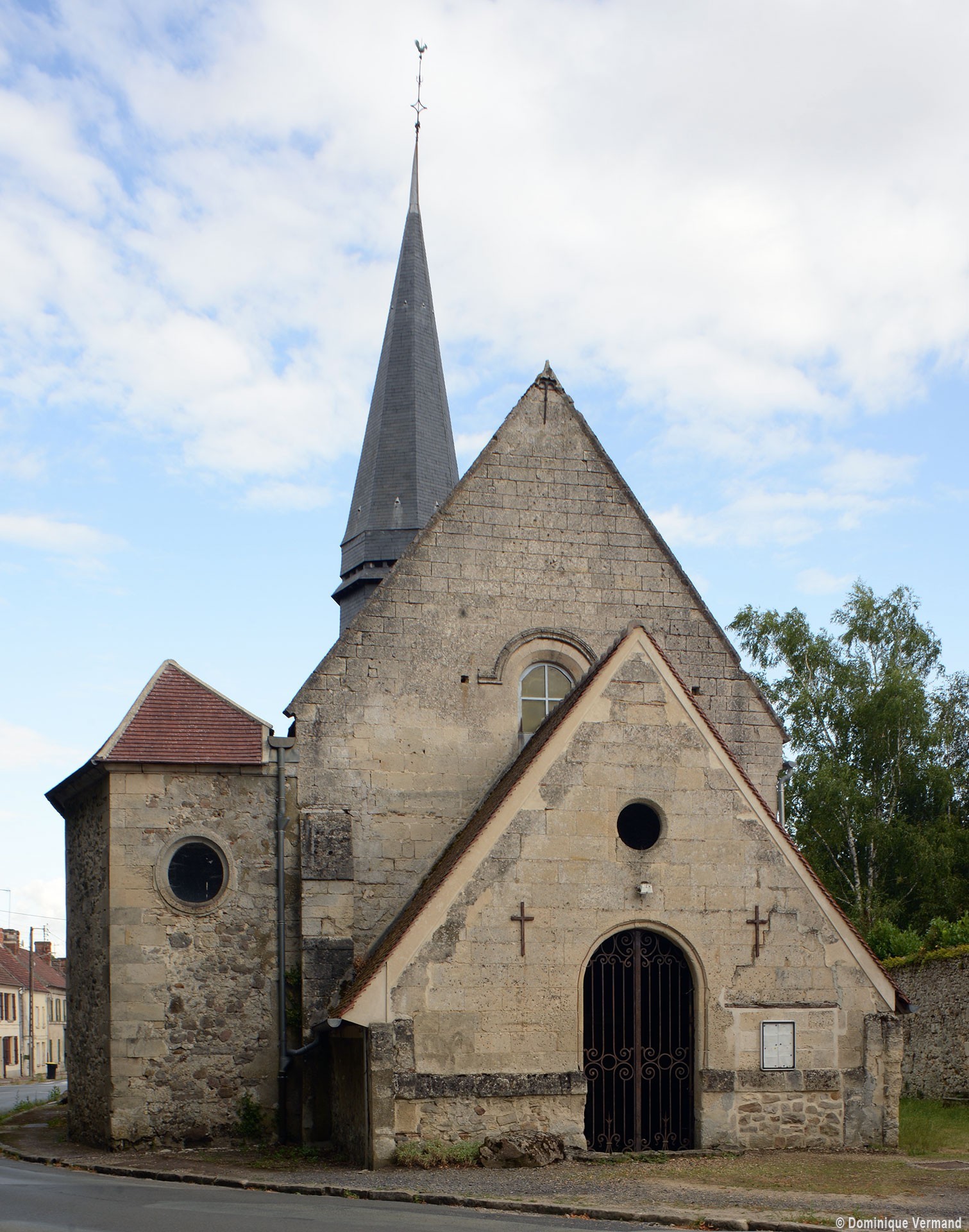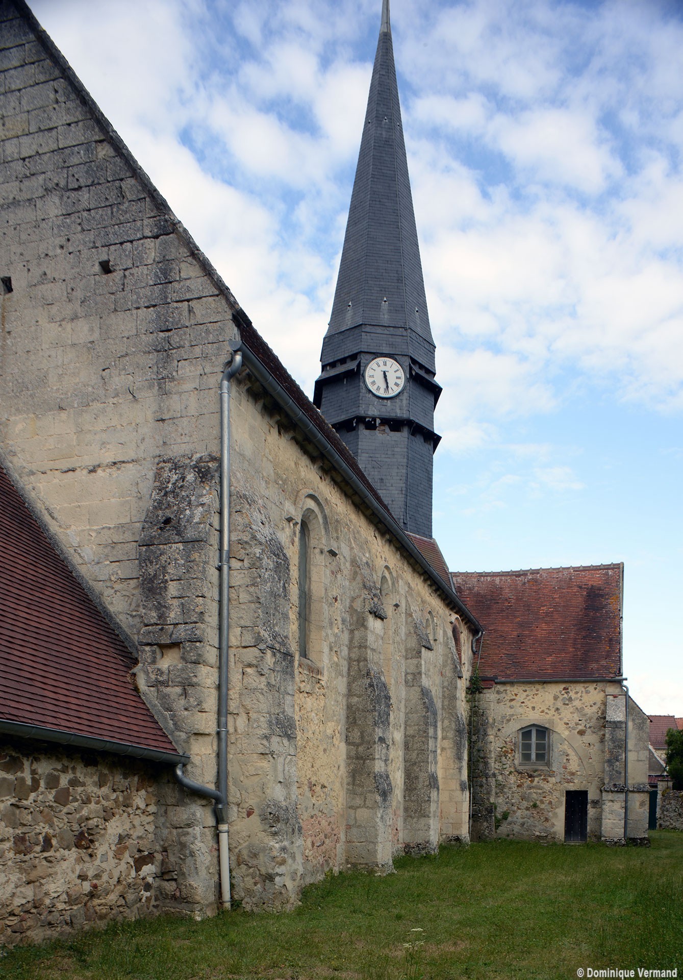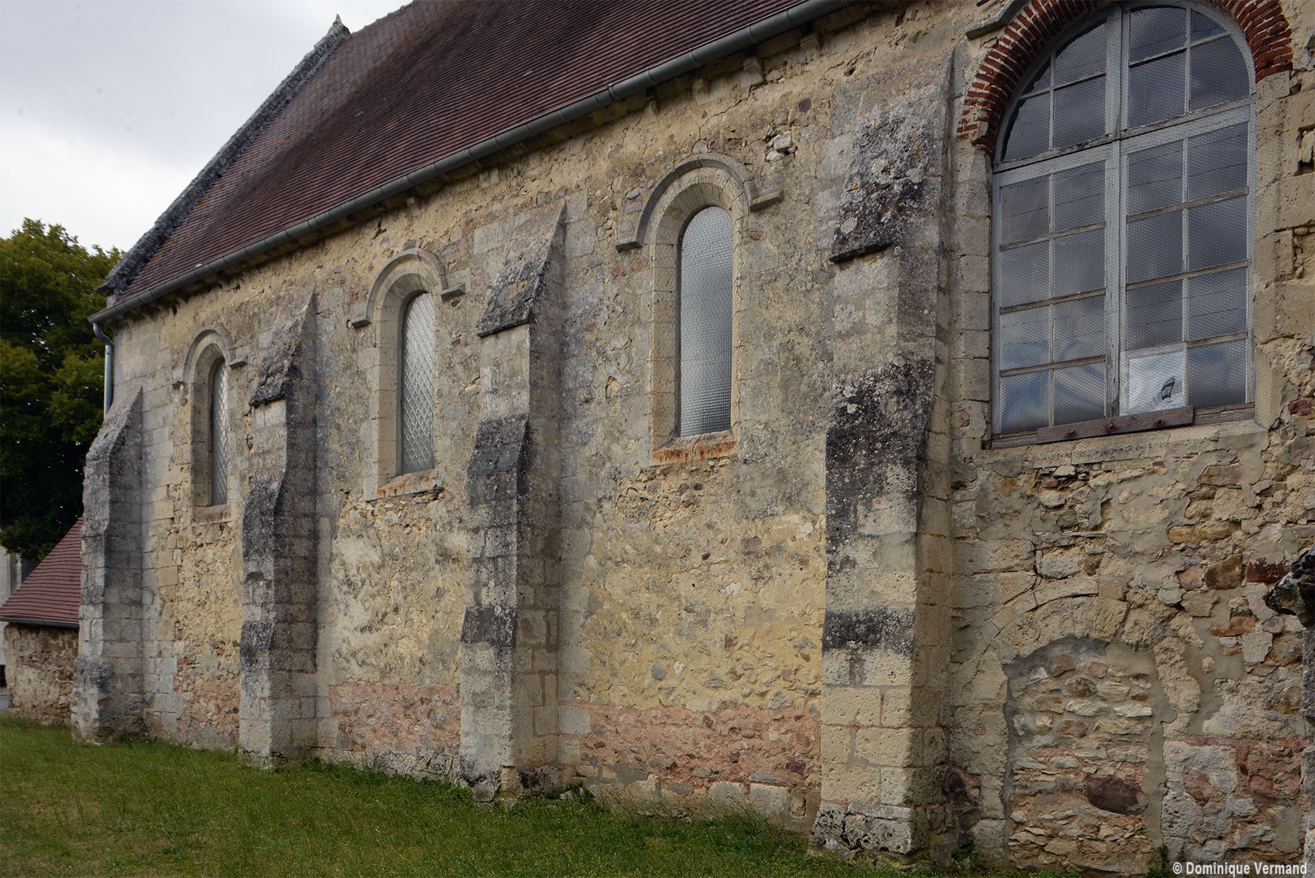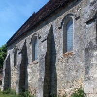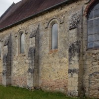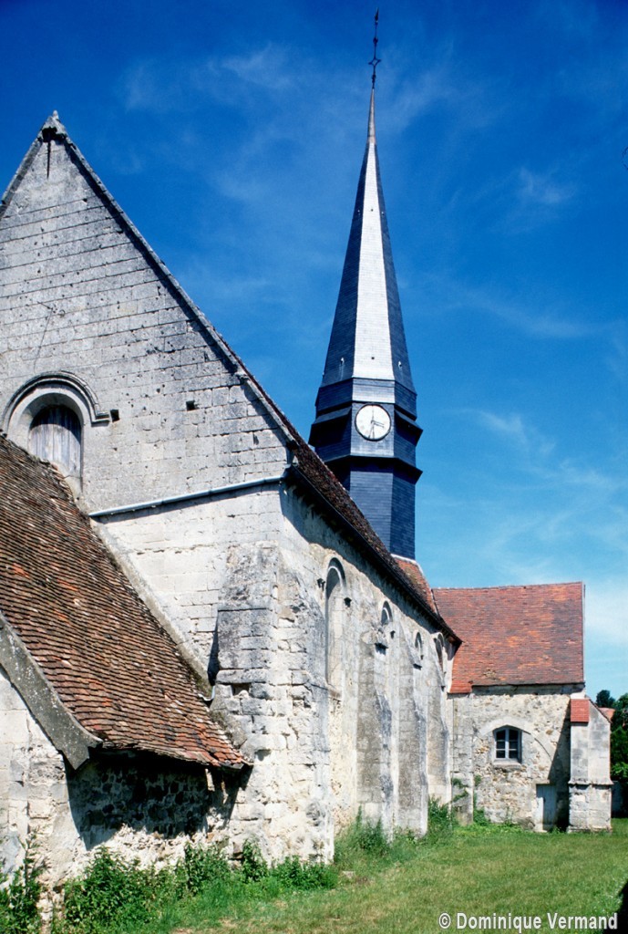 Malgré les habituelles transformations ultérieures, l’église laisse aisément deviner le plan adopté – et alors fort répandu – lors de sa construction vers le milieu du 12ème siècle : une nef unique suivie d’un chœur de deux travées à chevet plat, avec clocher sur la première travée. La façade, dissimulée par un porche depuis le 19ème siècle, et le mur sud de la nef se sont conservés sans altérations majeures. Des fenêtres en plein cintre dont l’archivolte est soulignée par une moulure biseautée alternent avec des contreforts à ressauts et animent le mur selon une composition qui reste d’esprit roman.