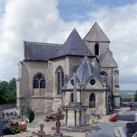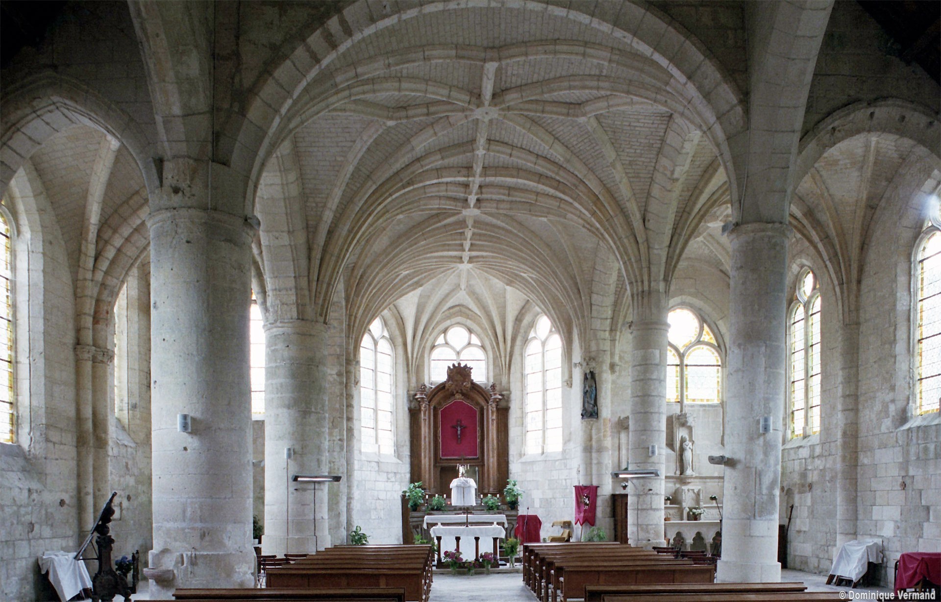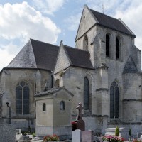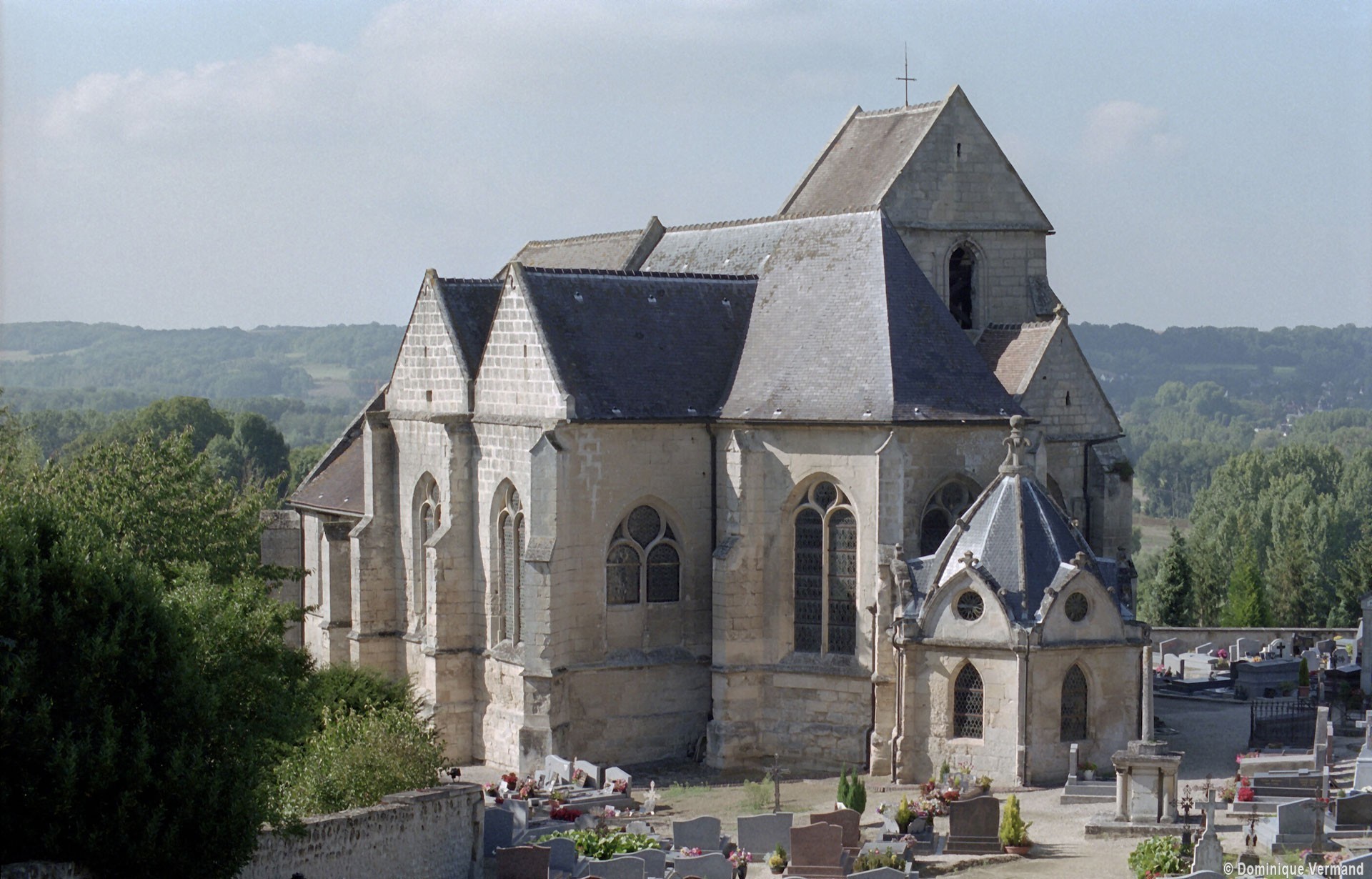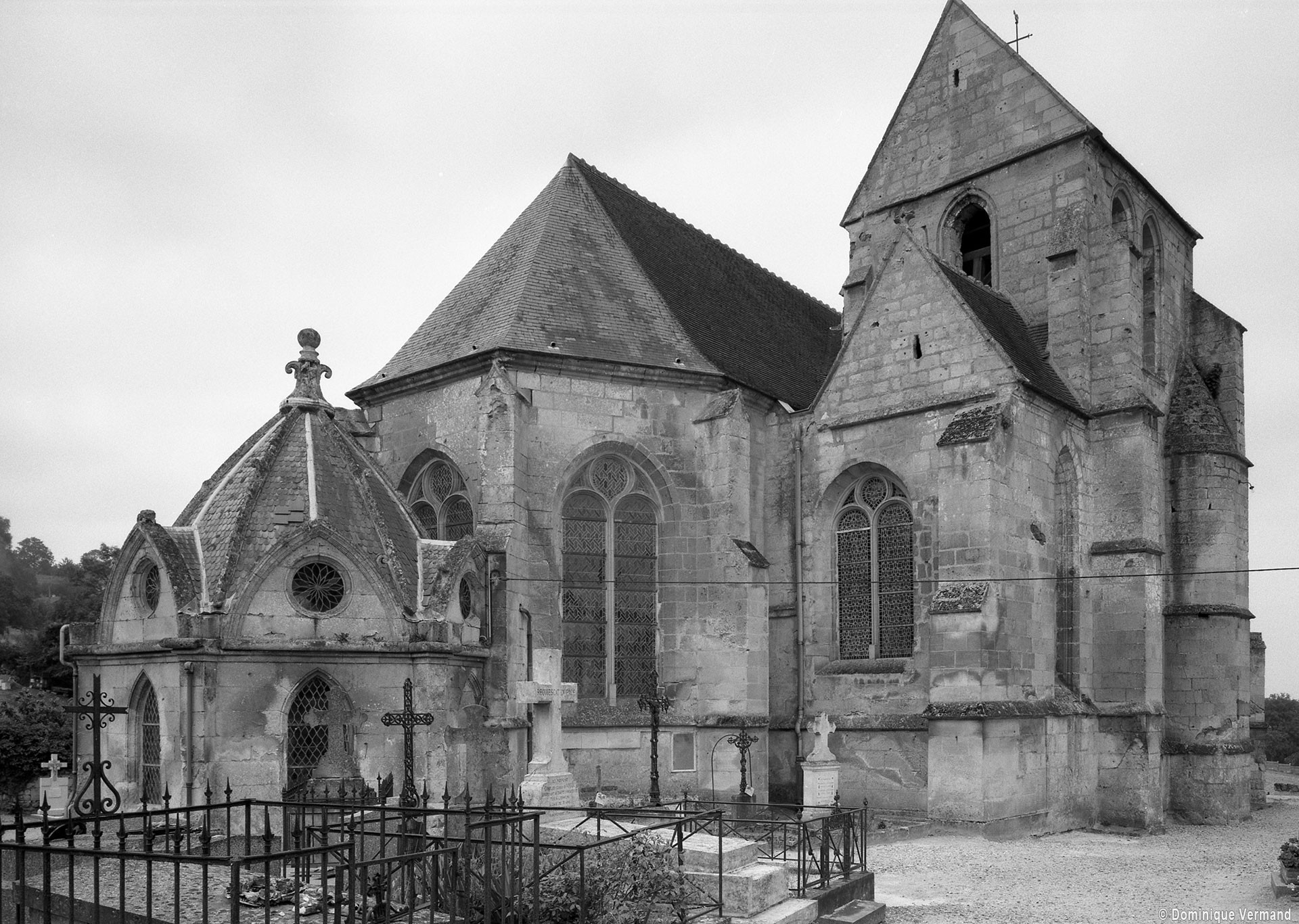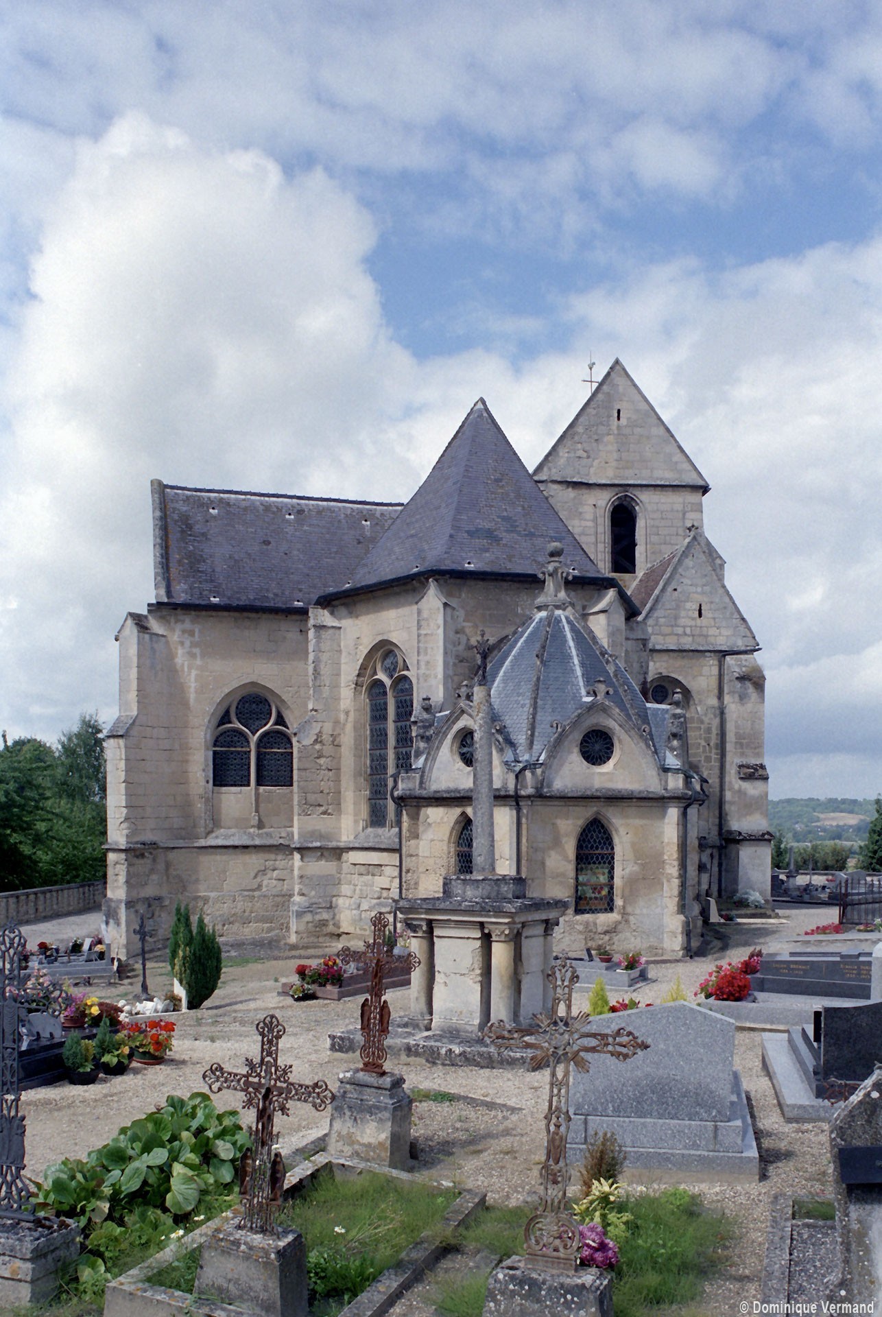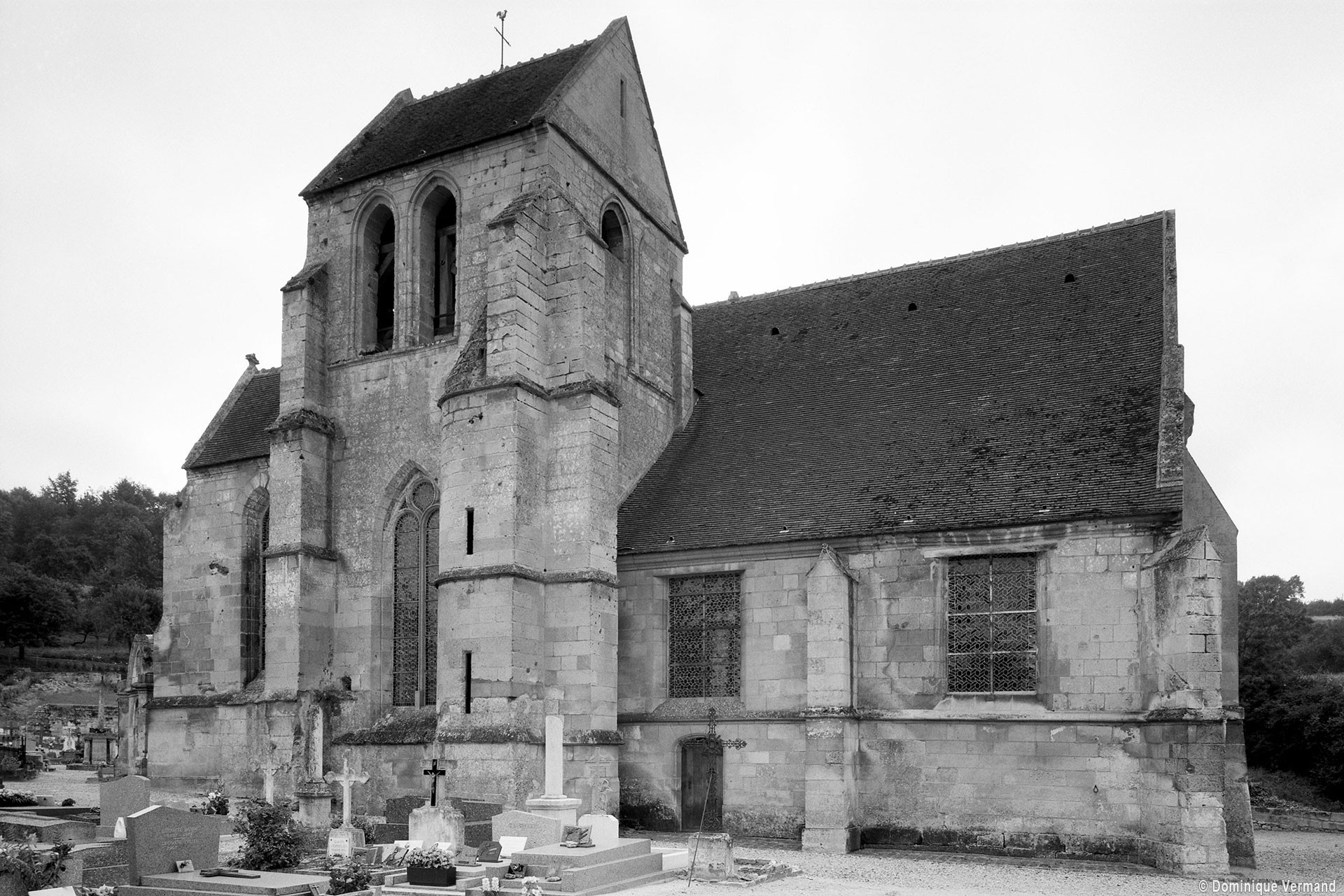 L’église Saint-Martin est magnifiquement située, en position dominante, sur le versant méridional de la vallée de l’Aisne. Ses volumes complexes composent une silhouette trapue d’où émerge avec peine le clocher. Son plan est constitué par une courte nef de deux travées, avec bas-côtés, suivie d’un vaste transept double prolongé par une abside de plan pentagonal. Une chapelle octogonale servant aujourd’hui de sacristie a été greffée au 19ème siècle sur l’abside. Assis sur la première travée, le clocher est une œuvre assez austère, peu ajouré – ses faces ouest et est ne comportent qu’une seule baie étroite – et coiffé d’un toit en bâtière. En façade, dans le pignon, une petite bretèche accompagnée d’une archère surmonte le portail et en protège l’accès, nouvel exemple d’un dispositif de défense appliqué à une église de la région.