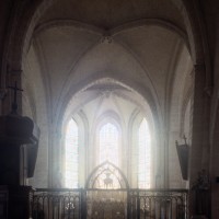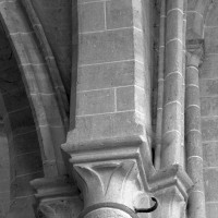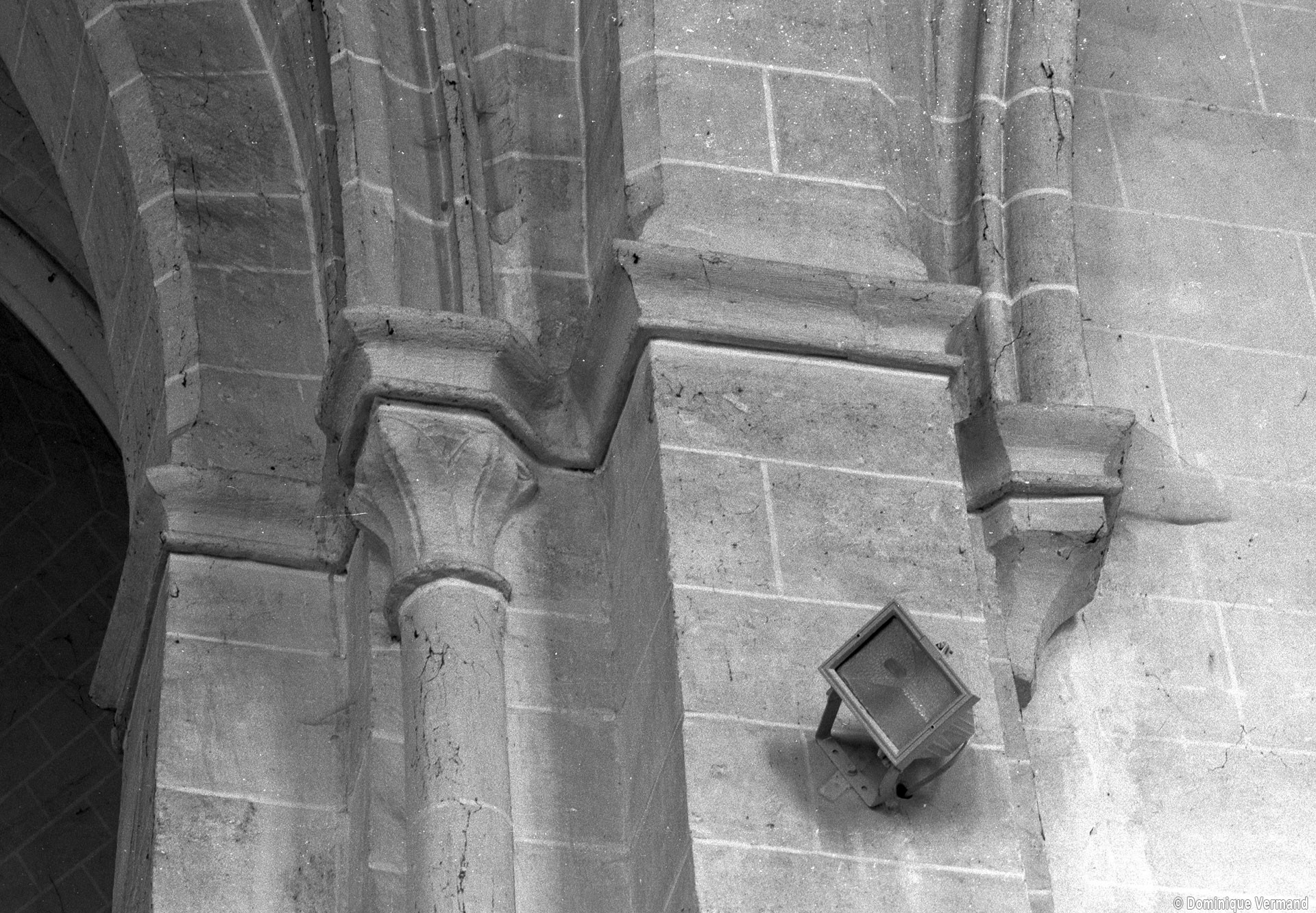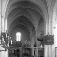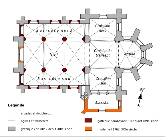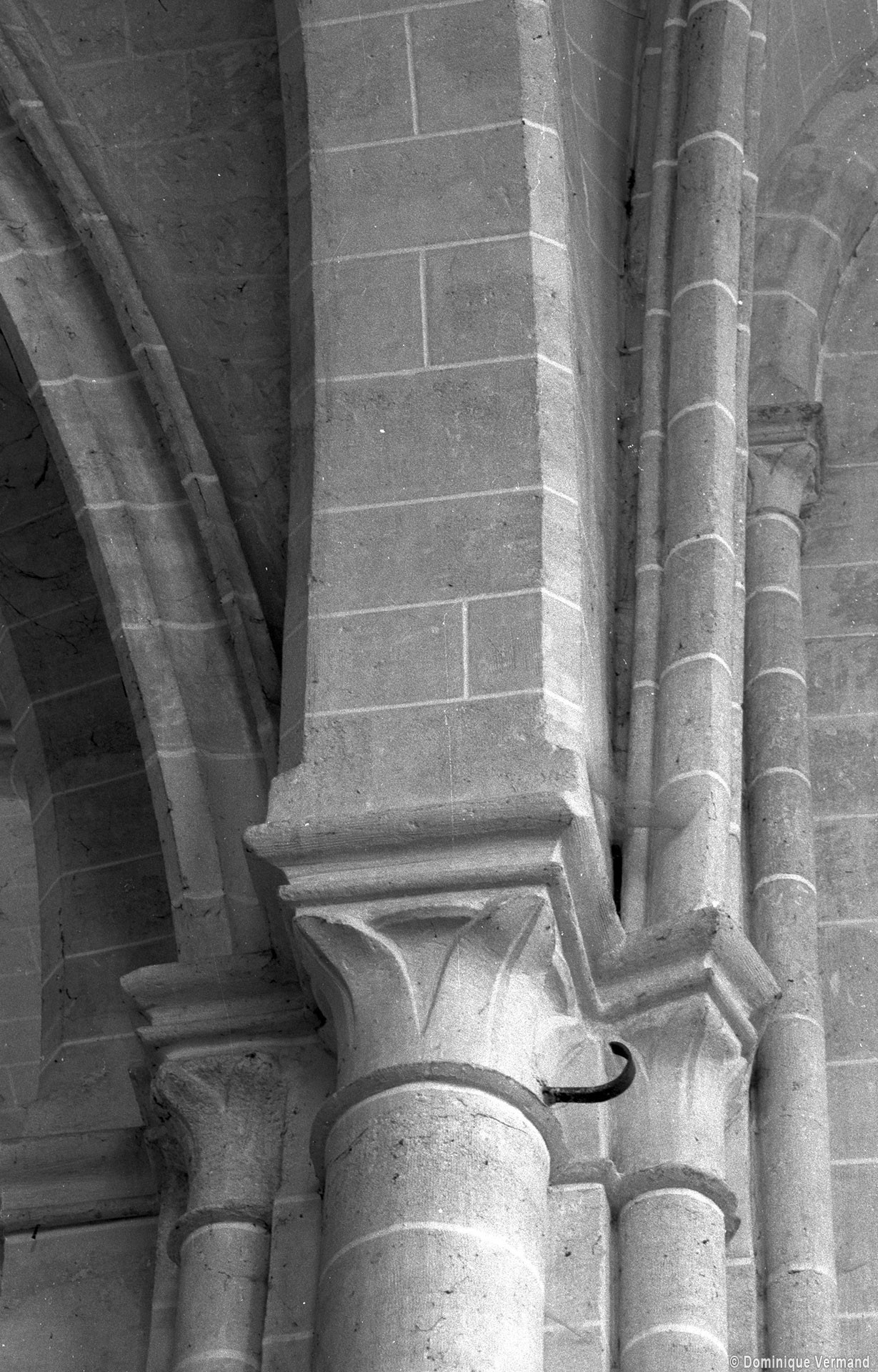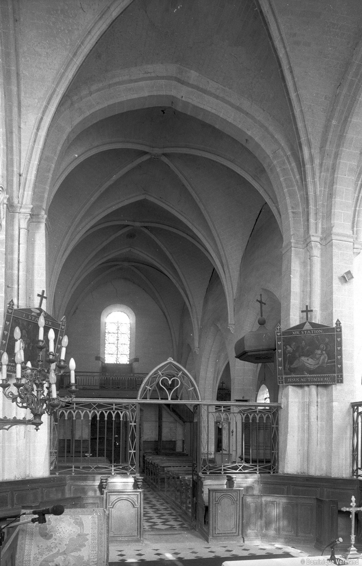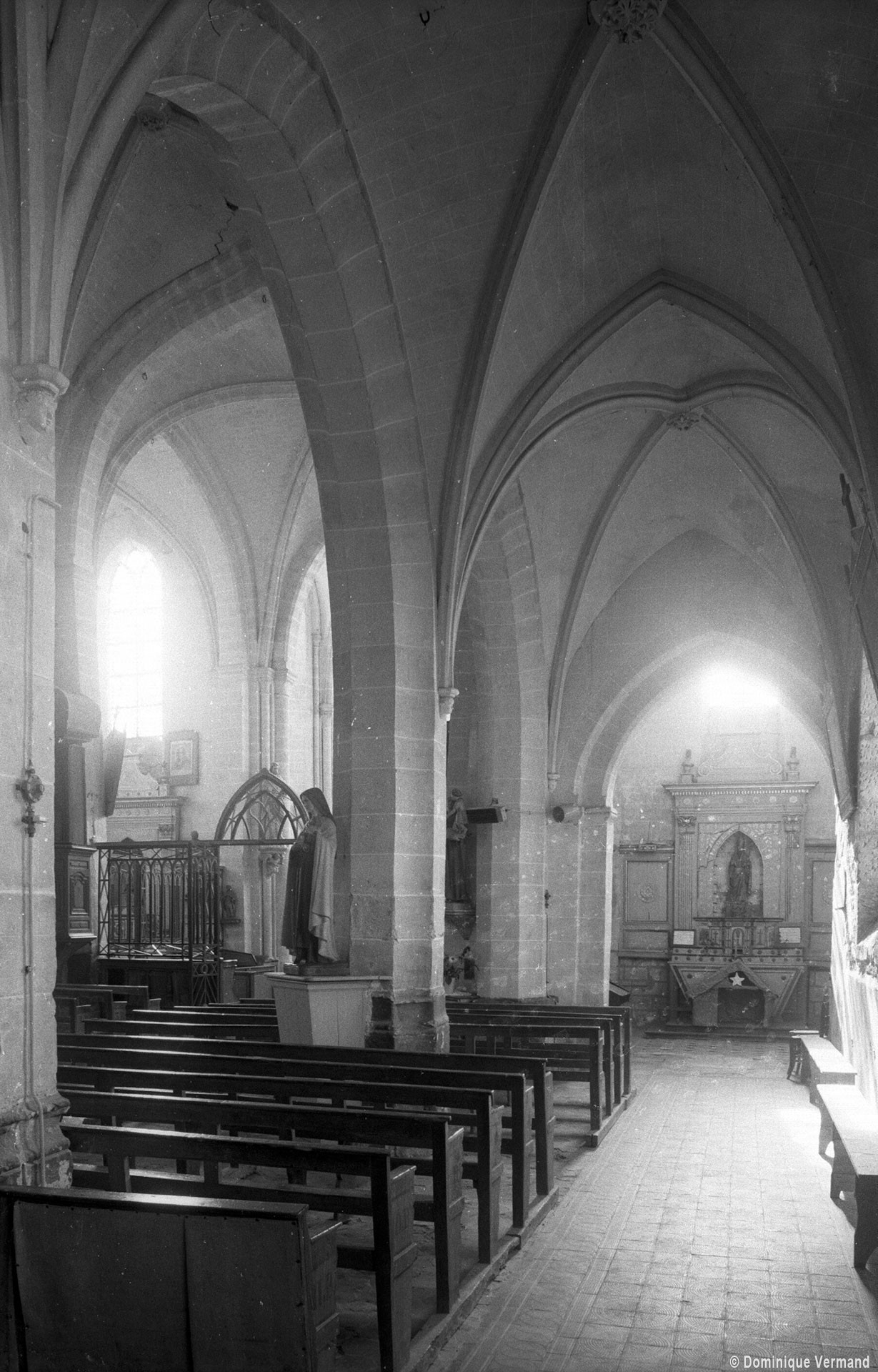 Le plan de l’église comprend une nef de trois travées avec bas-côtés, un transept légèrement saillant et un choeur pentagonal. Choeur et transept sont voûtés d’ogives profilées en amande qui retombent sur des colonnettes par l’intermédiaire de chapiteaux à la corbeille sobrement décorée de feuilles plates. A l’extrémité des croisillons, les chapiteaux sont remplacés par de simples culs-de-lampe et il n’y a donc pas de colonnettes. Toujours dans un souci de simplicité, les arcades qui mettent en communication la croisée avec la nef et les bras du transept sont reçues sur un simple pilastre par l’intermédiaire d’un bandeau mouluré, prolongement du tailloir des chapiteaux associés aux ogives. Seule l’arcade d’entrée du choeur – arc triomphal – a droit à un dispositif complet, avec chapiteau et demi-colonne, sans doute pour mettre l’accent sur la partie sacrée de l’édifice.