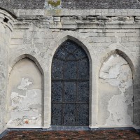 L’extérieur de cet ensemble choeur-transept est remarquable par le bel équilibre des volumes, scandés par des contreforts saillants et aux larmiers bien marqués. Les fenêtres sont de simples lancettes et celles du croisillon sud sont regroupées en triplet. Une tourelle d’escalier contemporaine marque l’angle sud-ouest de ce croisillon, indice probable de l’existence d’un clocher en pierre à l’origine.