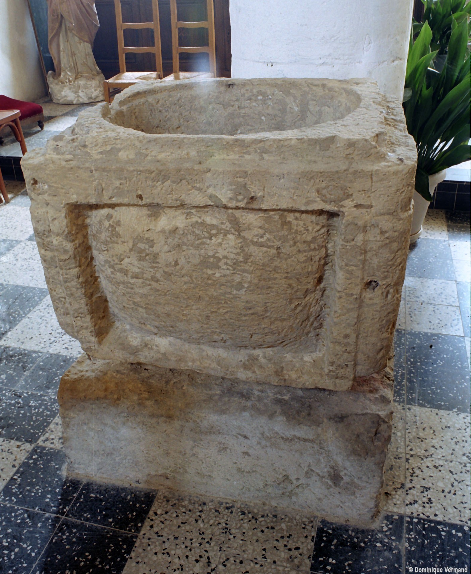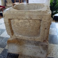 On notera la présence d’une cuve baptismale en pierre d’exécution très grossière et à la date incertaine (2005).