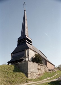 En façade, une travée courte formant porche supporte le mince clocher en charpente et ardoises. Sa façade ouest est construite en colombage associant la pierre et le bois.
