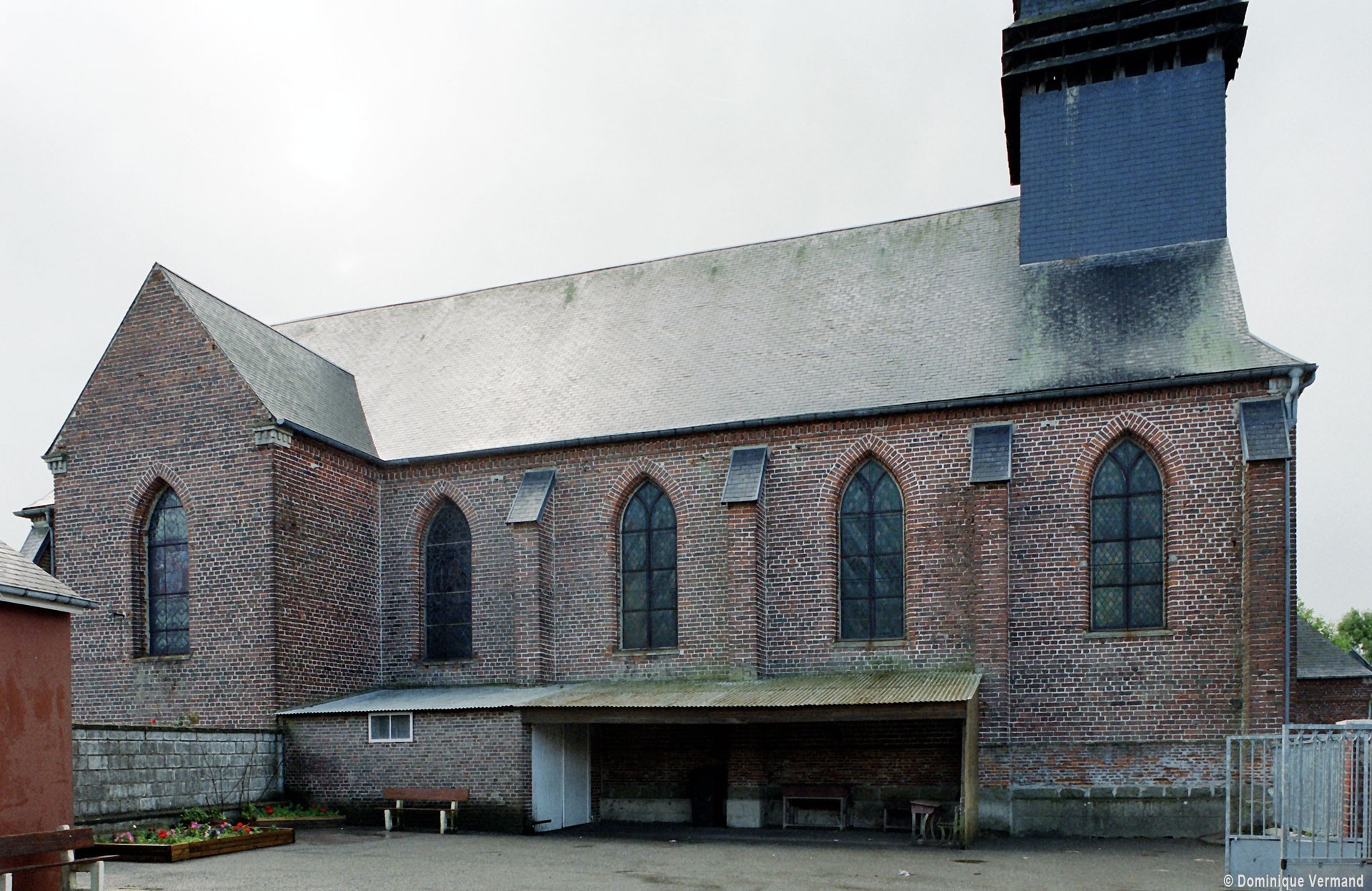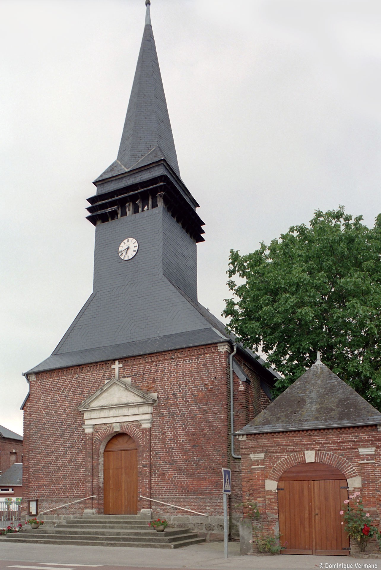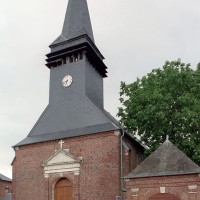 Dominée par un haut clocher en charpente et ardoises, c’est un édifice entièrement en briques, sans grande originalité, reconstruit en 1869. Son plan est formé d’un long vaisseau rectangulaire de six travées (y compris le choeur) sur lequel se greffent deux petits croisillons au niveau de la travée précédant le choeur. De fausses voûtes d’arêtes en lambris le couvrent tout entier. On y remarque six vitraux de la Vie de Jésus, par Lévèque, de Beauvais, et quelques éléments du mobilier de l’ancienne église (autels, boiseries, statues). L’église forme avec le presbytère, la remise de la pompe à incendie et l’école un intéressant ensemble homogène, bien représentatif de la construction en milieu rural à la fin du Second Empire (2007).