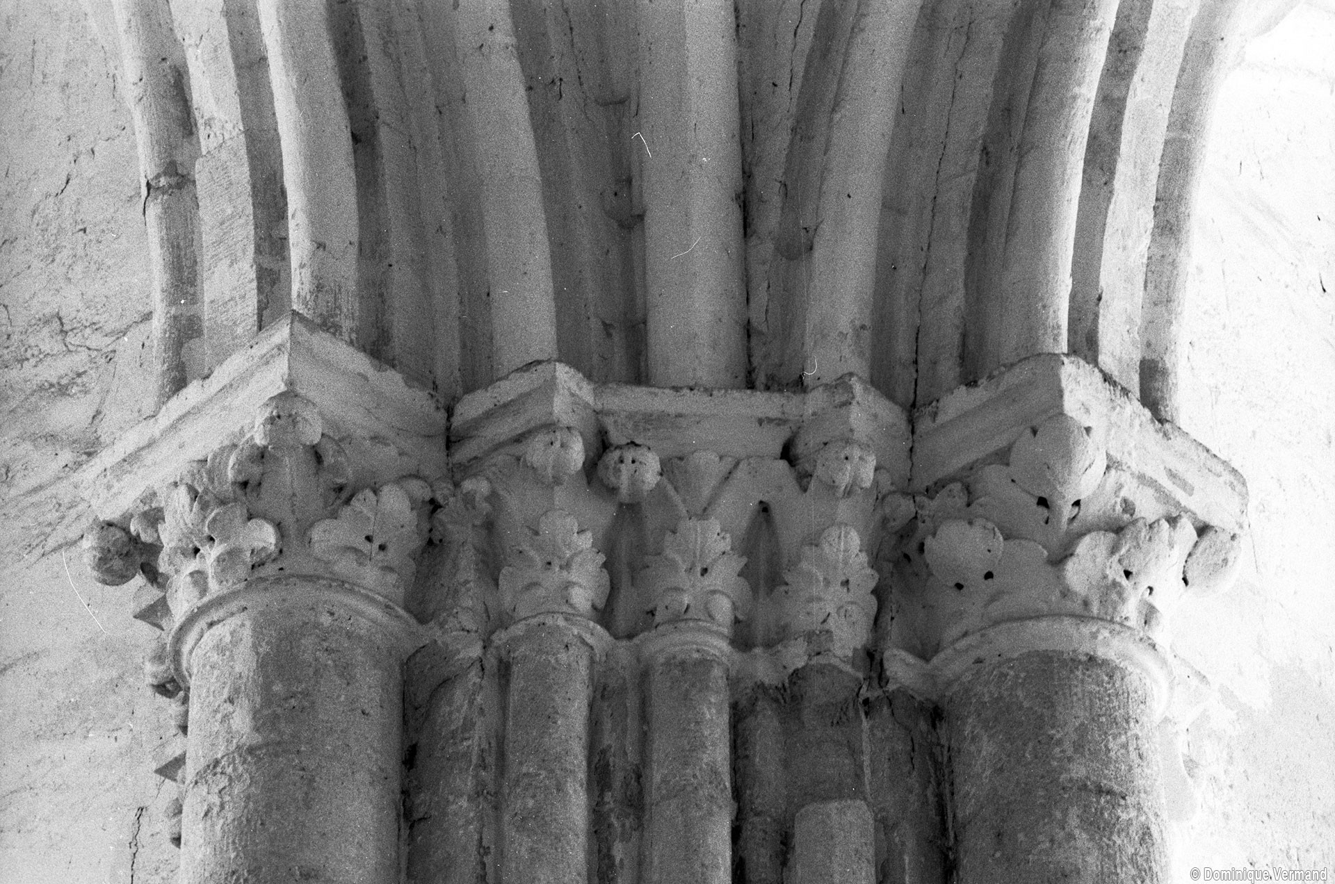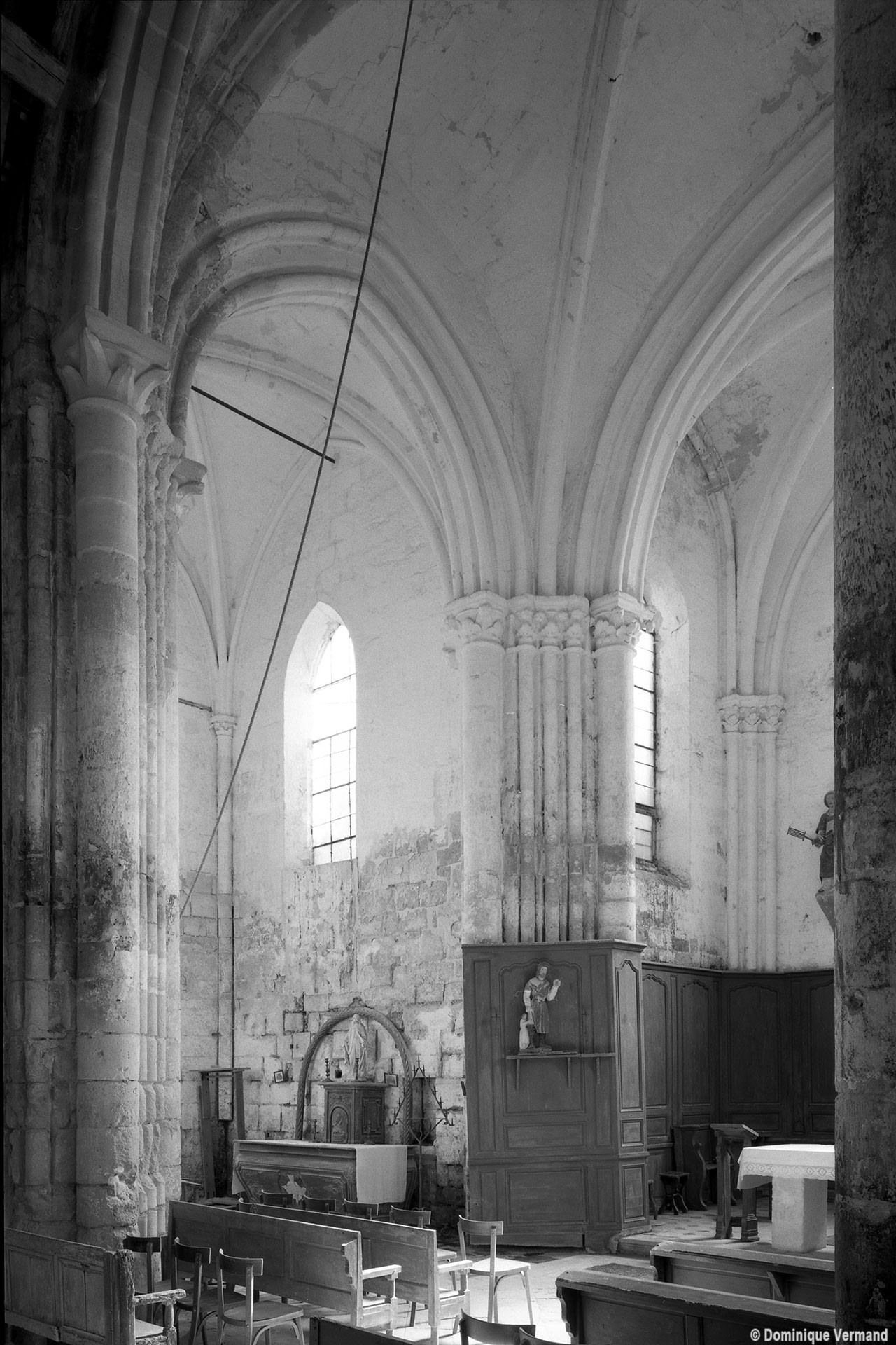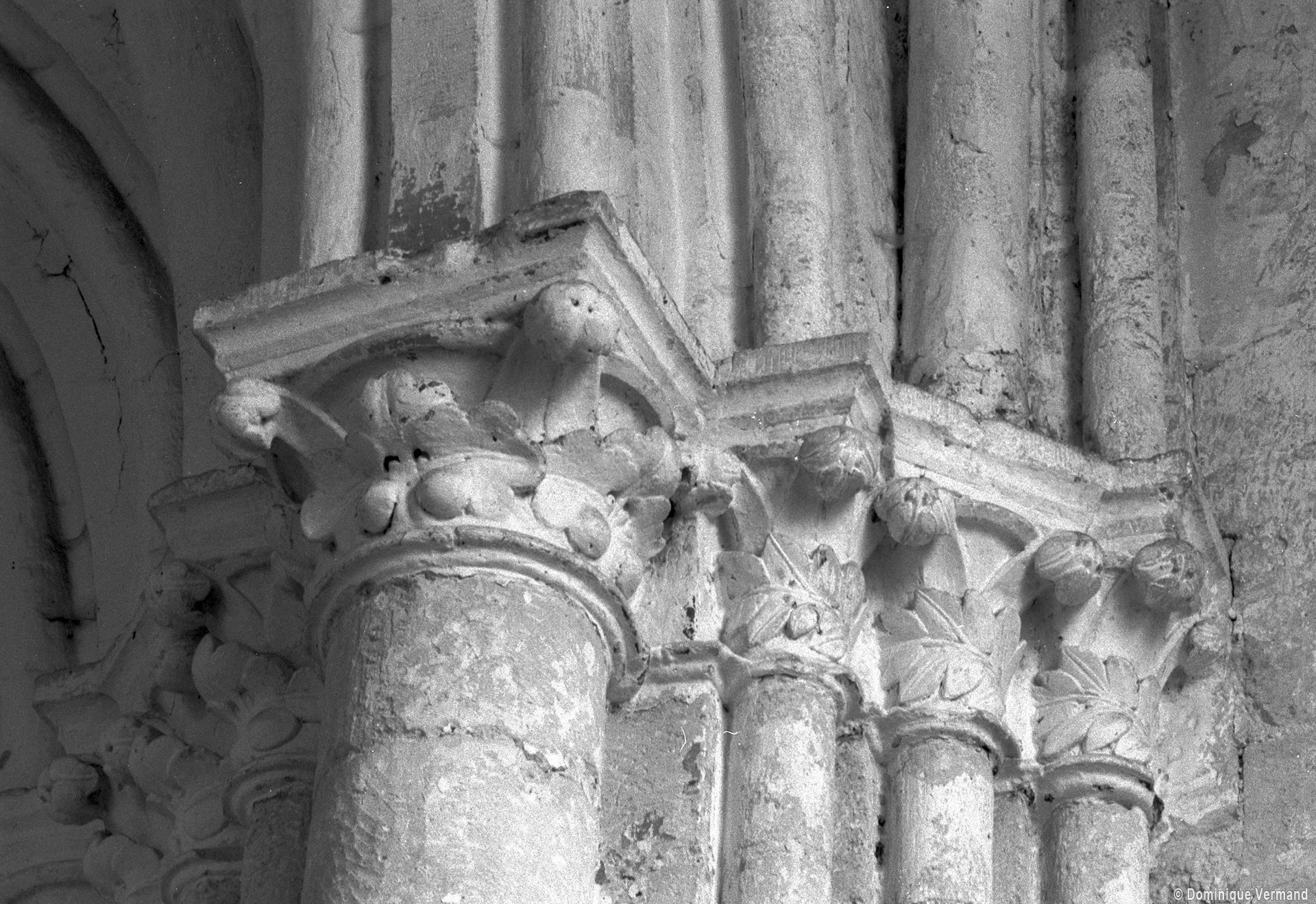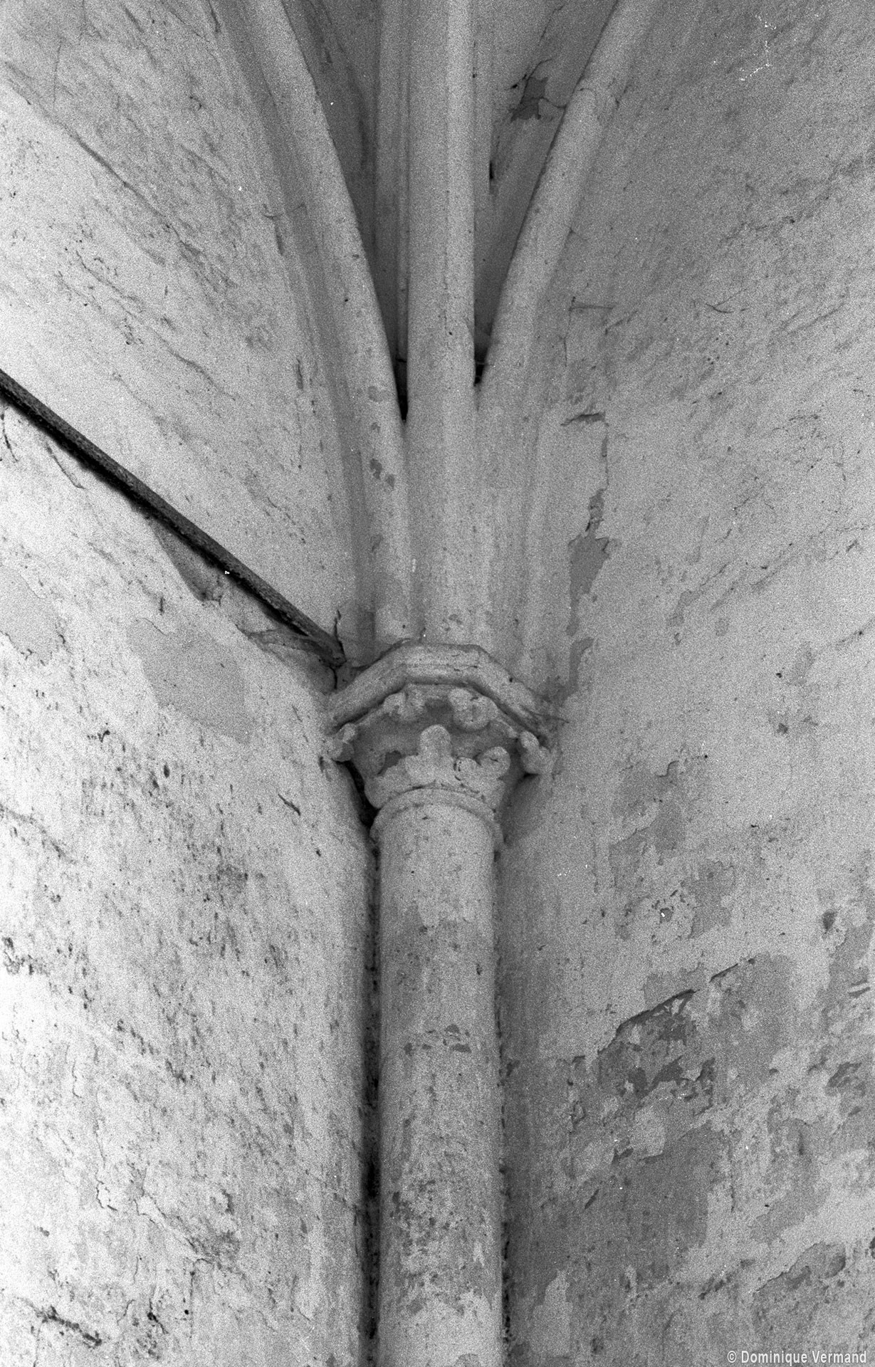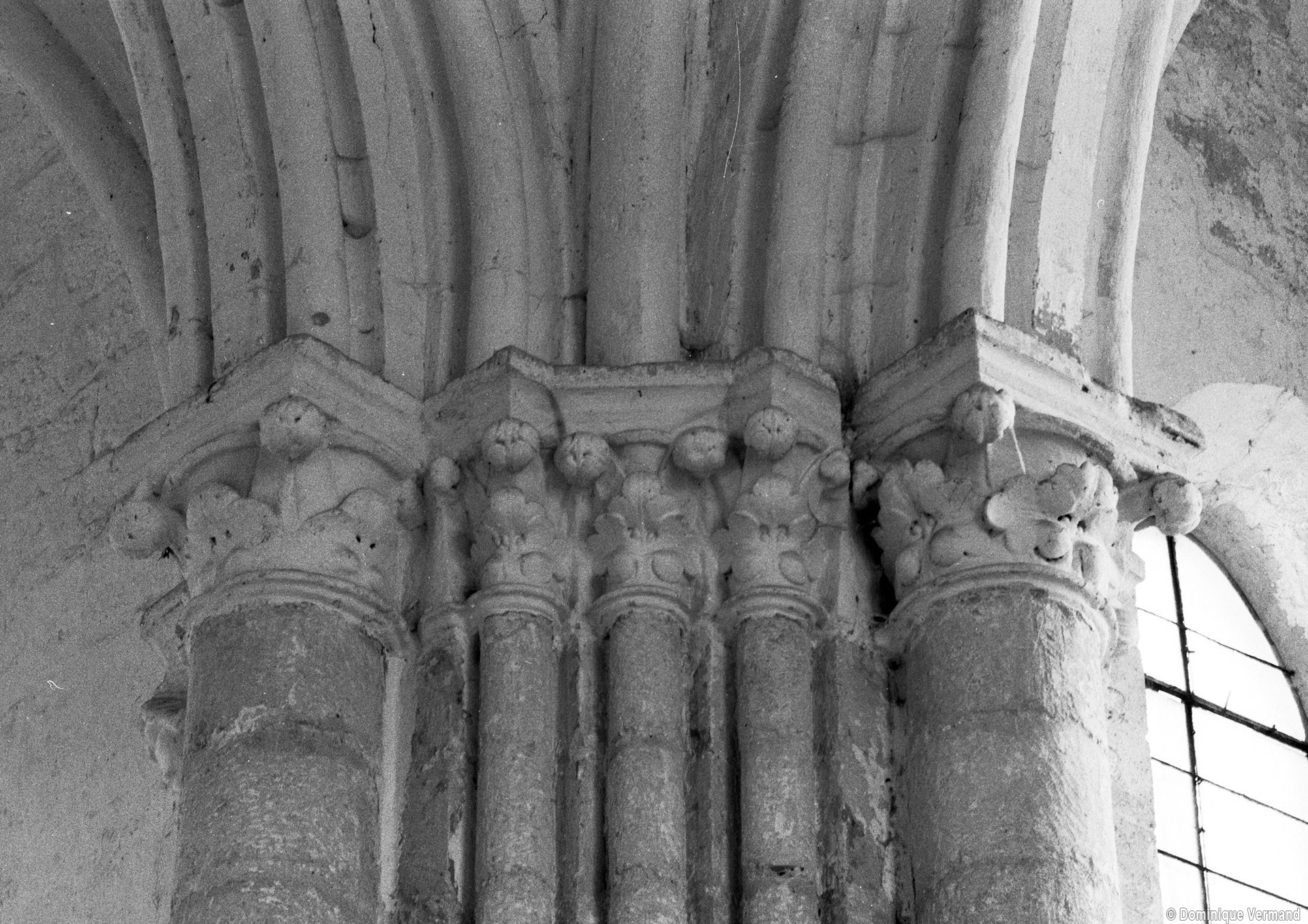 Une nef unique dont il reste une travée et deux fenêtres existait au 12ème siècle. Elle sera dotée de bas-côtés lors de la reconstruction des parties orientales. Celles-ci, qui comportent un transept et un chœur à chevet plat, seront bâties en deux campagnes rapprochées durant la première moitié du 13ème siècle. A la première campagne appartiennent la croisée et le chœur. Les ogives profilées en amande, doubleaux et formerets retombent sur des faisceaux de colonnettes par l’intermédiaire de très beaux chapiteaux gothiques, associant crochets et feuilles variées empruntées à la flore locale.