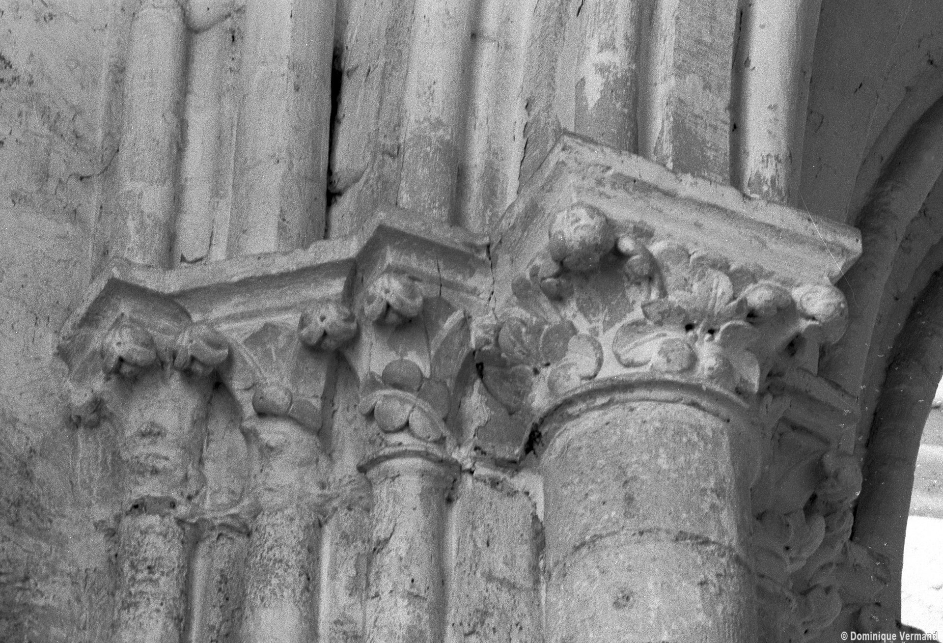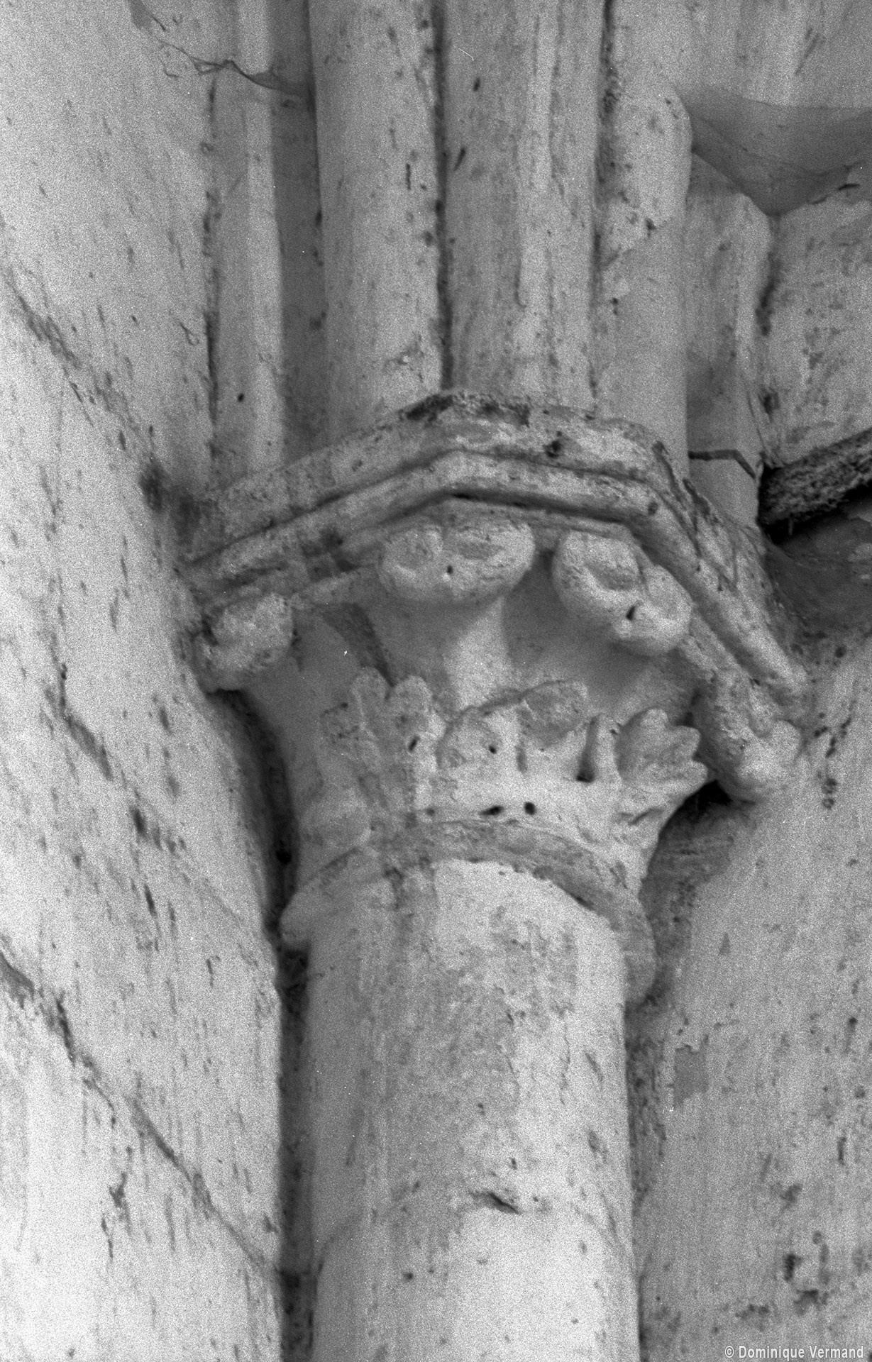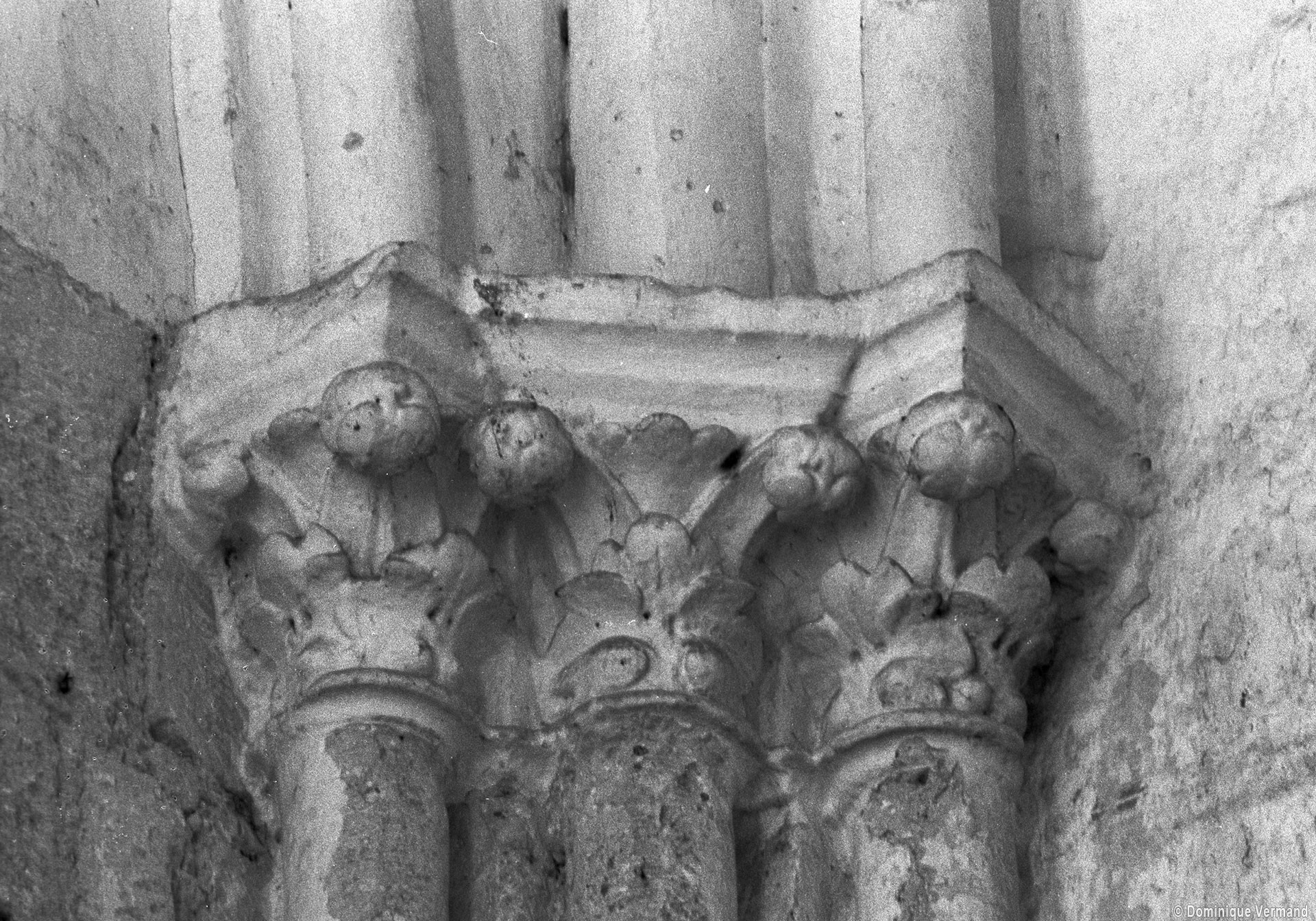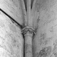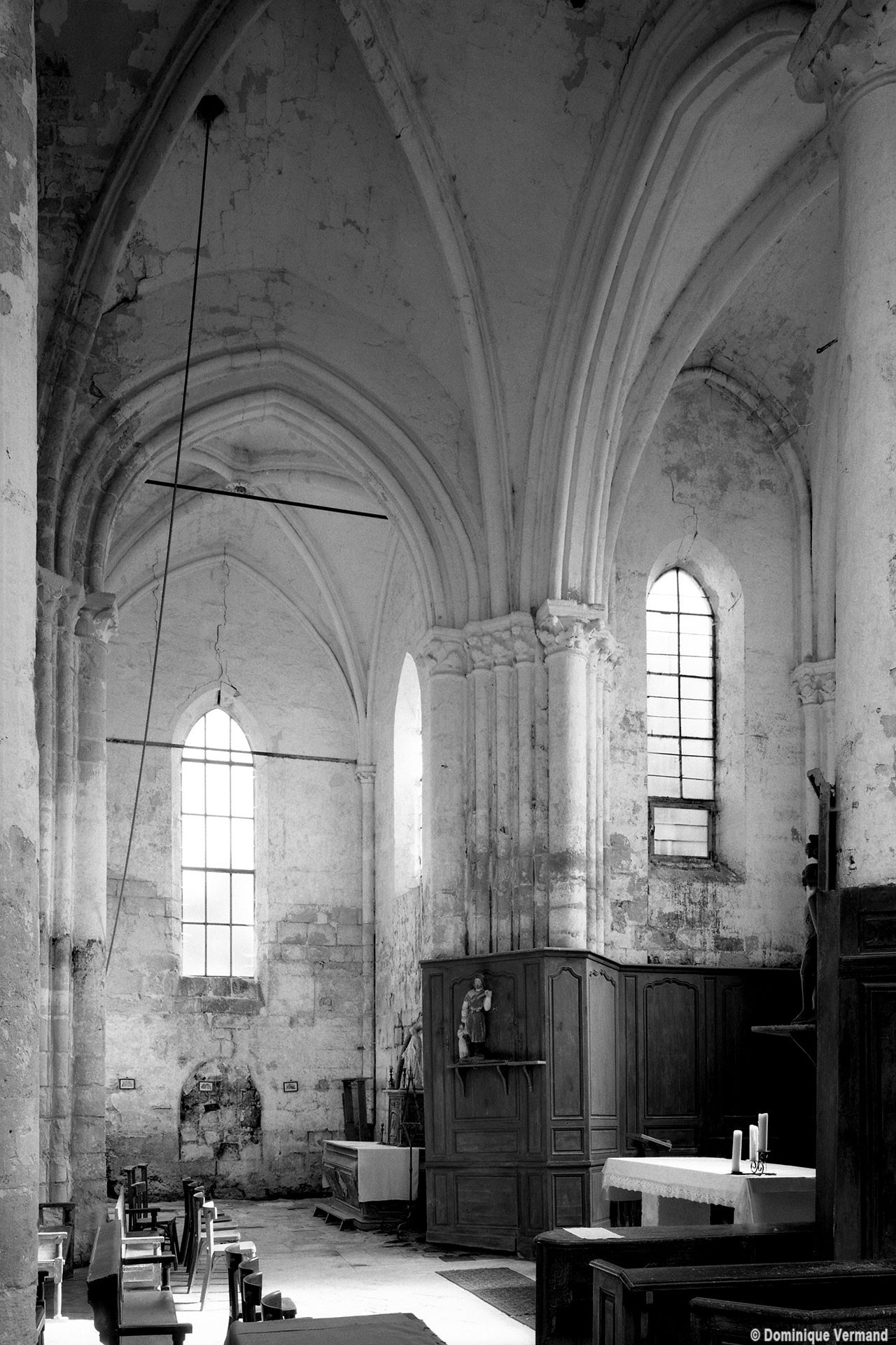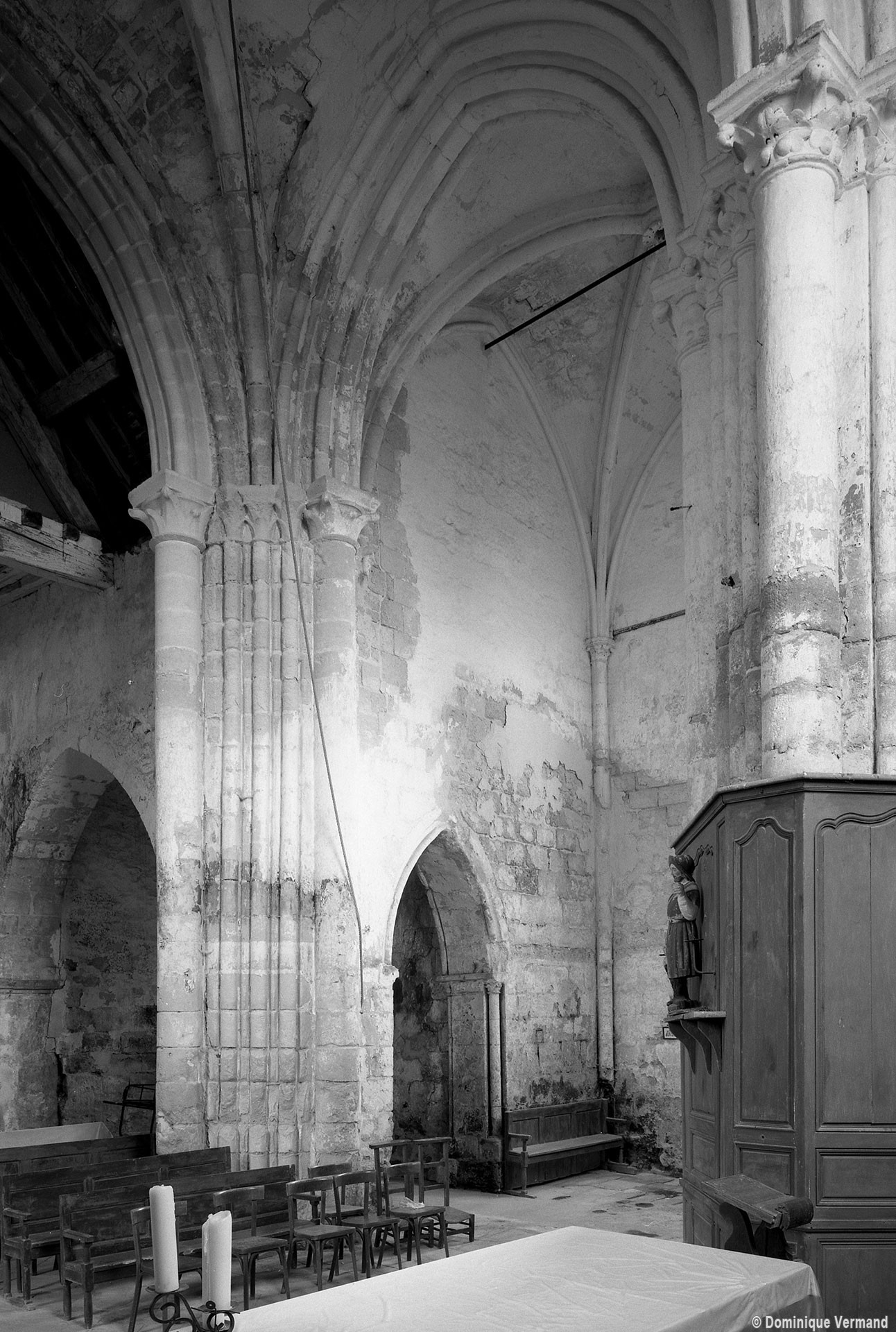 Une nef unique dont il reste une travée et deux fenêtres existait au 12ème siècle. Elle sera dotée de bas-côtés lors de la reconstruction des parties orientales. Celles-ci, qui comportent un transept et un chœur à chevet plat, seront bâties en deux campagnes rapprochées durant la première moitié du 13ème siècle. A la première campagne appartiennent la croisée et le chœur. Les ogives profilées en amande, doubleaux et formerets retombent sur des faisceaux de colonnettes par l’intermédiaire de très beaux chapiteaux gothiques, associant crochets et feuilles variées empruntées à la flore locale.
