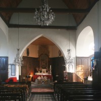 La nef, bâtie en rognon de silex, est sans doute d’origine ancienne. Elle a été fortement remaniée par la suite : contreforts et fenêtres du 16ème siècle, façade et porte sud de 1742. Elle vaut pour la belle charpente en carène (16ème siècle) qui la recouvre et qui comporte, à l’image d’autres églises de la région, des entraits à engoulants et un décor de pampre.
