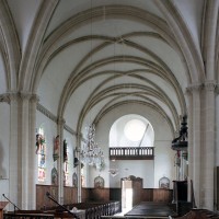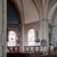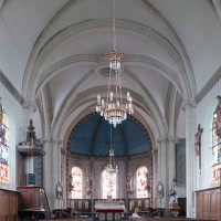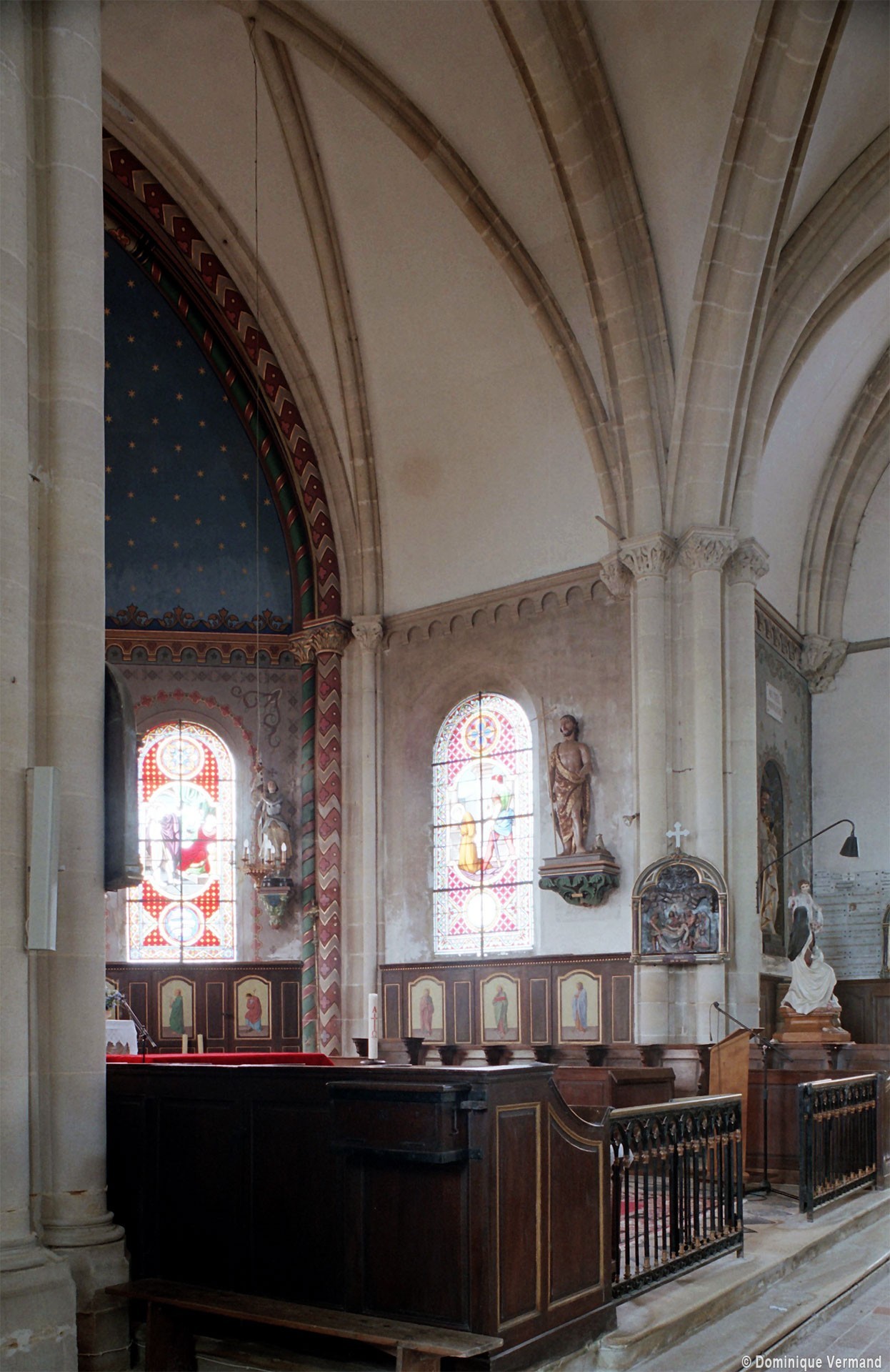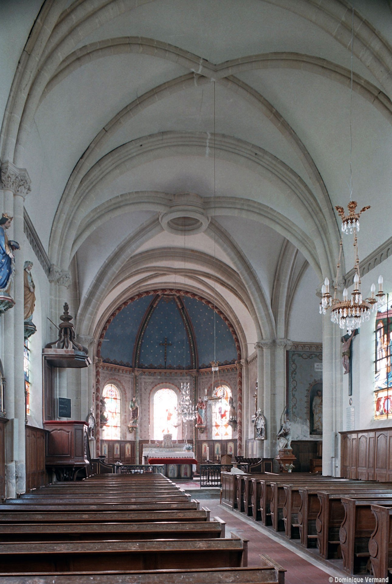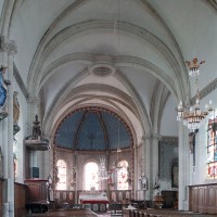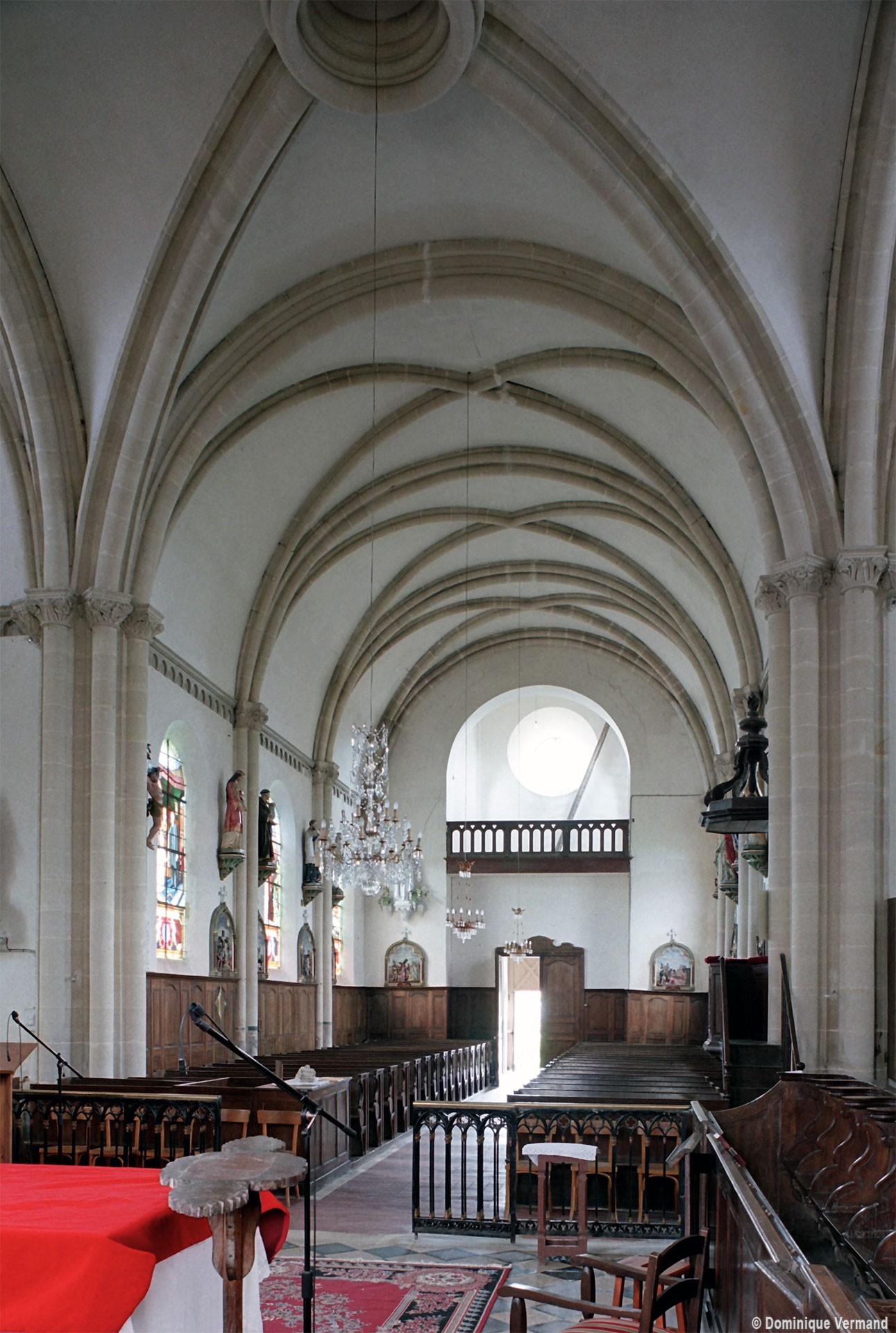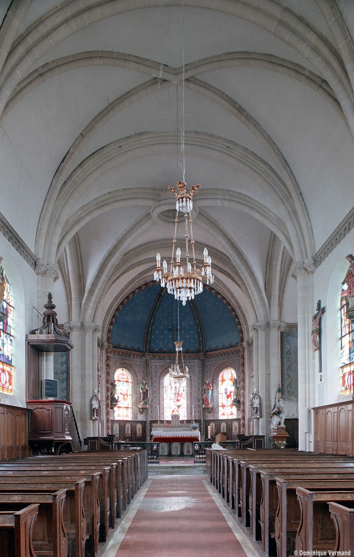 Son plan comprend une nef de trois travées, un transept saillant et un choeur pentagonal. L’ensemble, construit avec soin, est voûté sur croisées d’ogives reçues sur des chapiteaux à décor végétal et colonnettes engagées dans les murs. Le choeur a conservé un bon exemple de décor peint dans le goût du 19ème siècle.