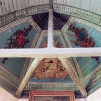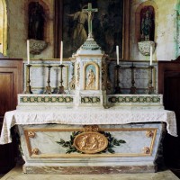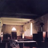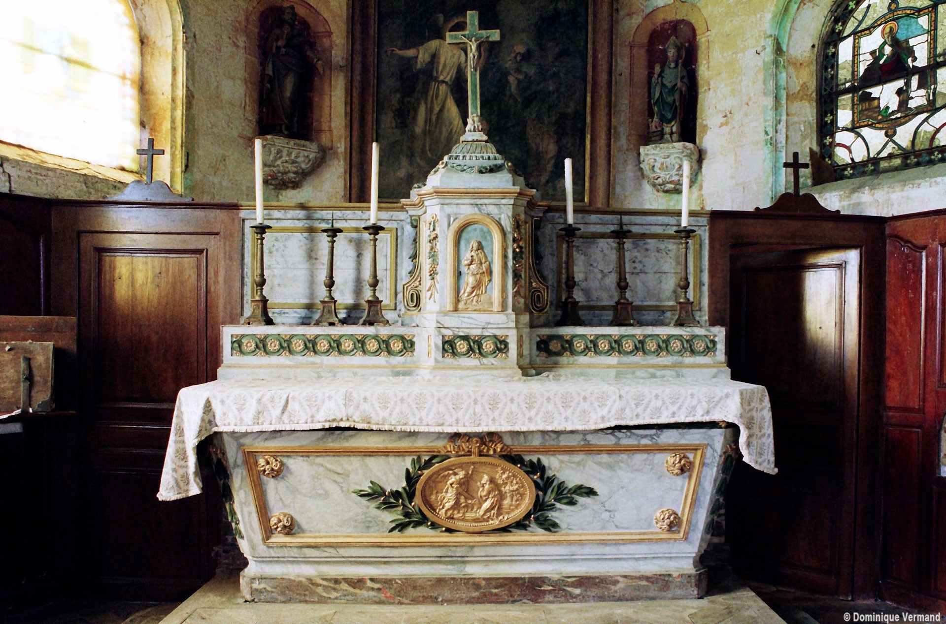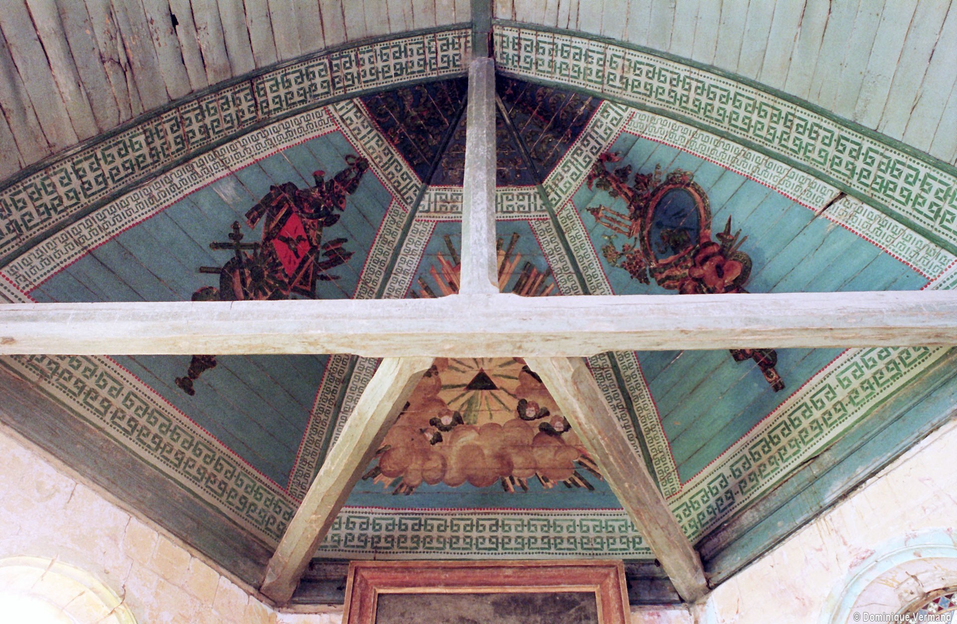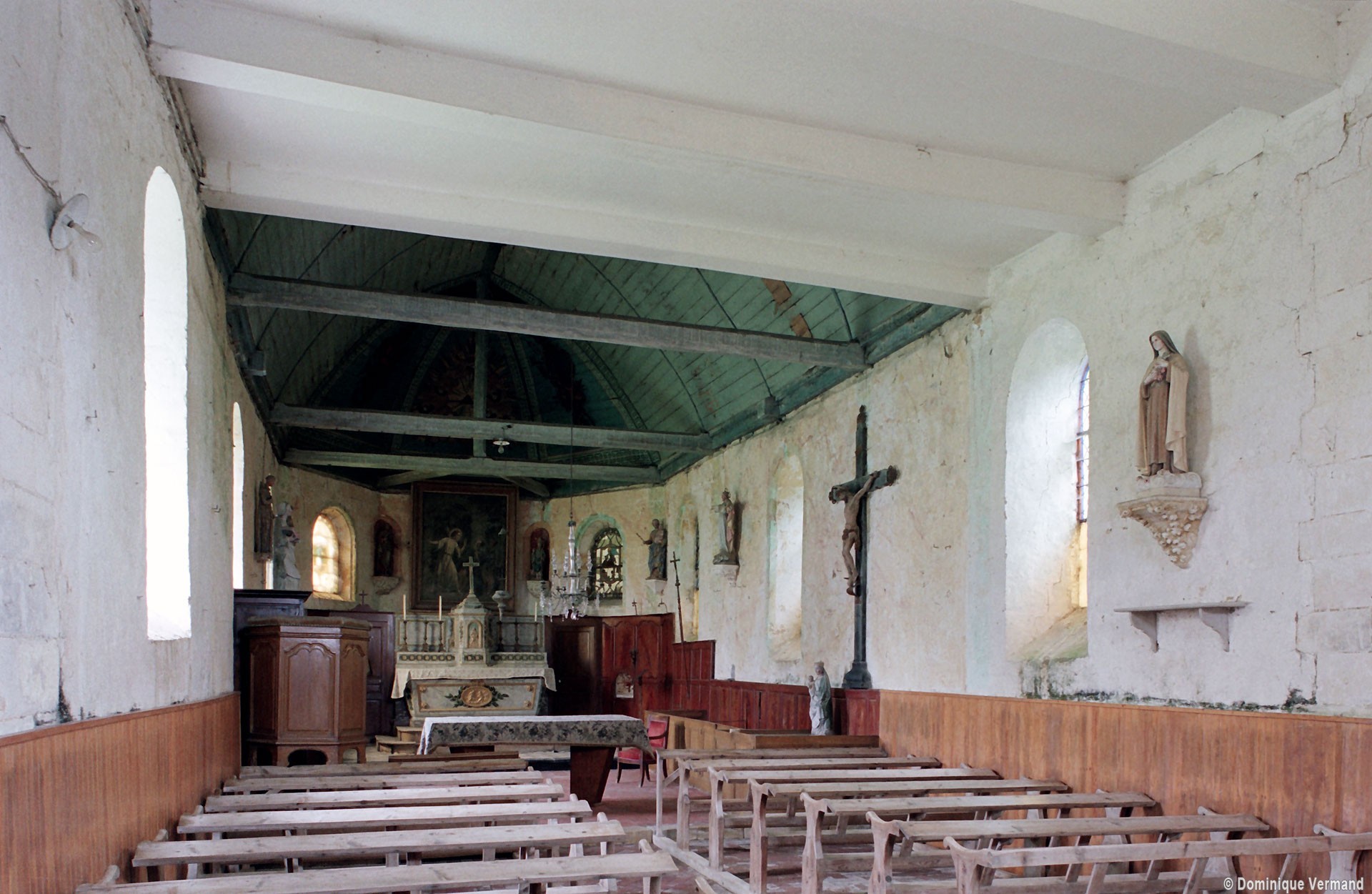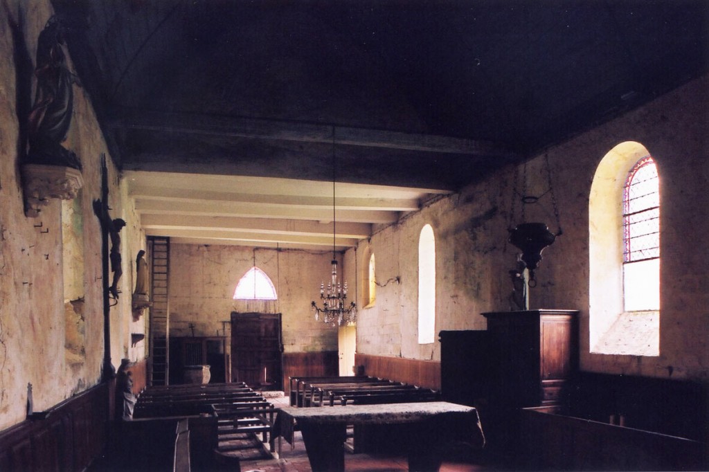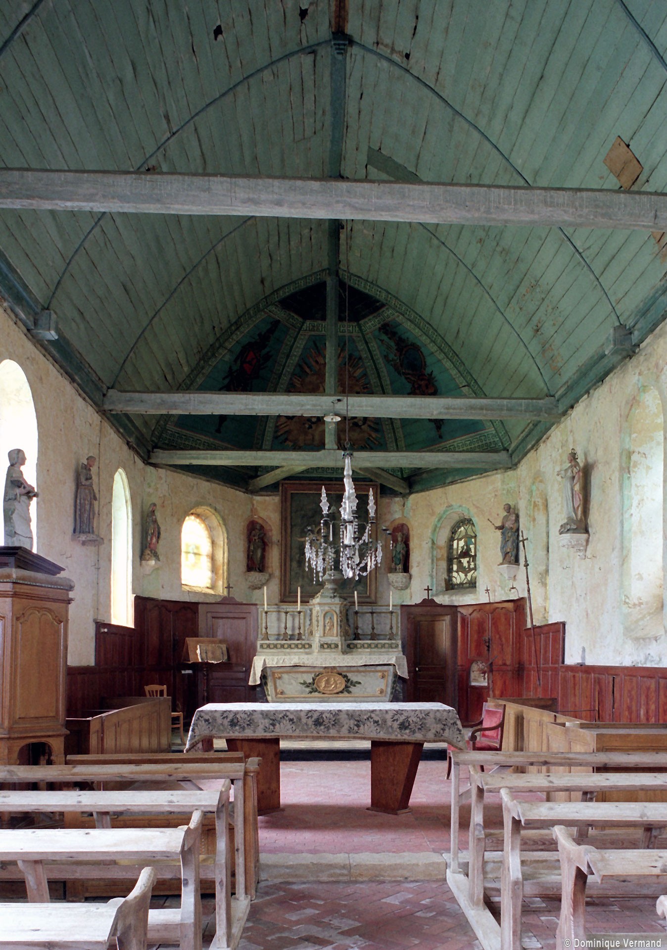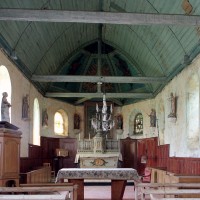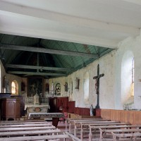 Le choeur, enfin, est une construction homogène que Graves date de 1775. Construit en pierres de taille, il est dépourvu de contreforts. Le pan central n’a pas de fenêtres et les deux pans latéraux comportent chacun une niche avec console et statue et une fenêtre plus courte que celles de la travée droite. Cette disposition est cohérente avec l’autel qui, avec ses boiseries, délimite un petit espace servant de sacristie. De la même époque, la charpente montre un beau décor d’armoiries peintes encadrant une gloire. Quelques statues d’art populaire et une cuve baptismale du 16ème siècle méritent l’attention (2007).
