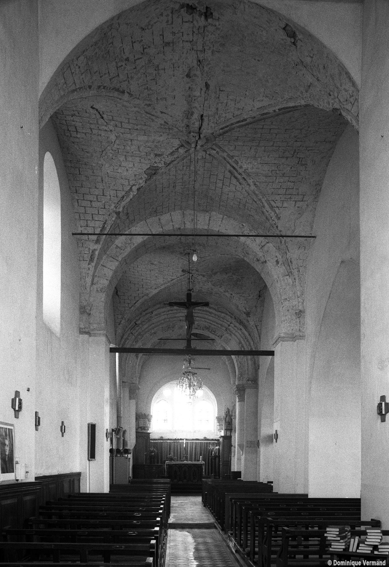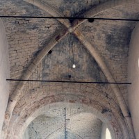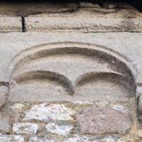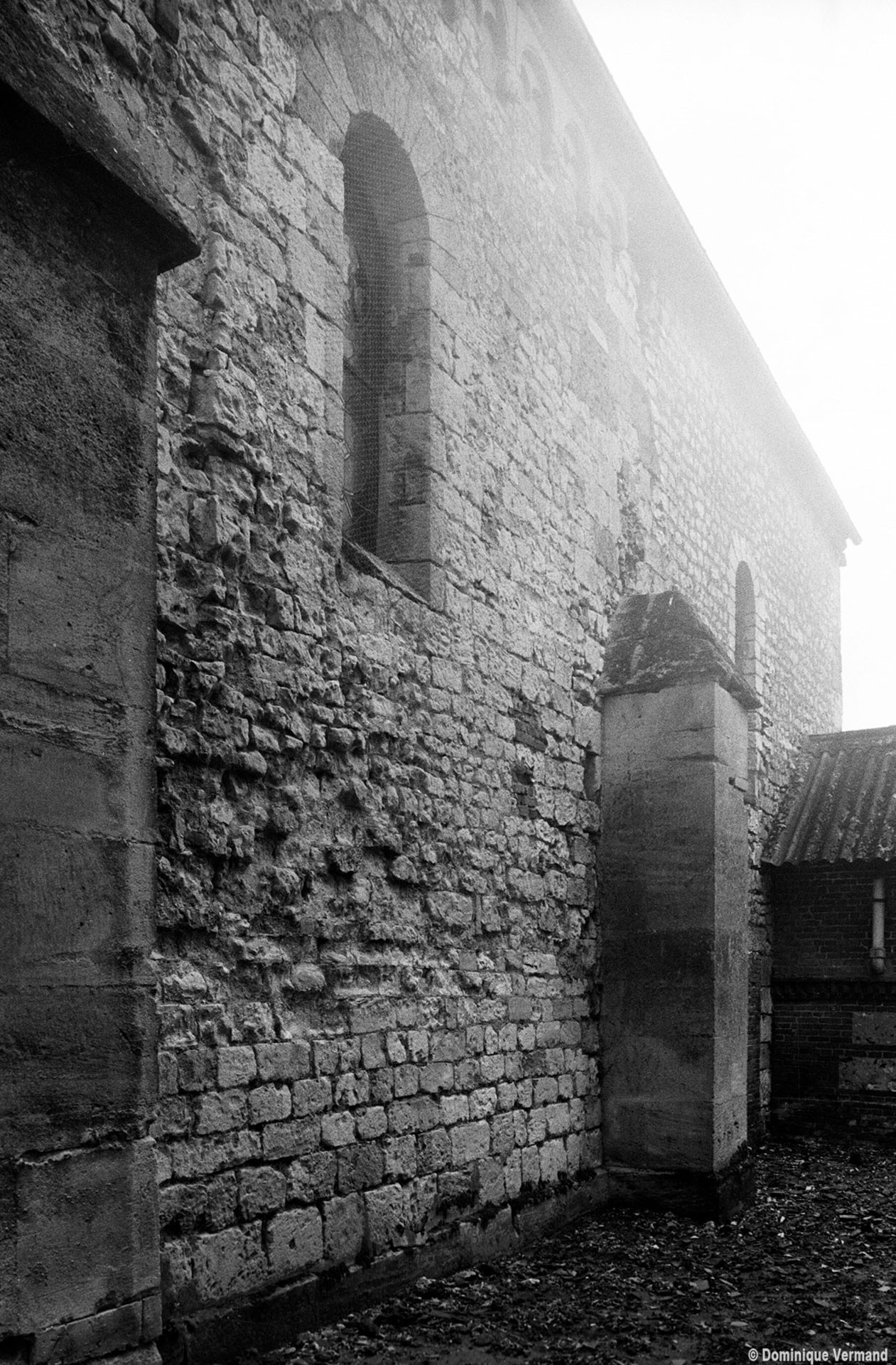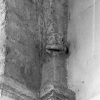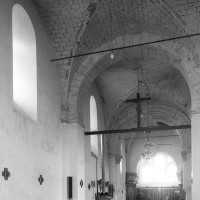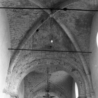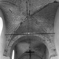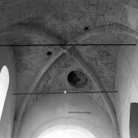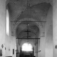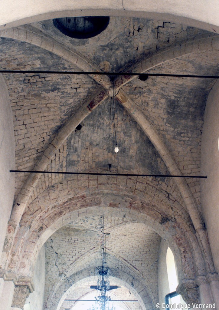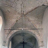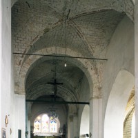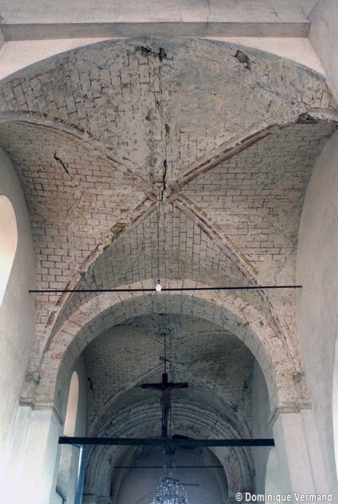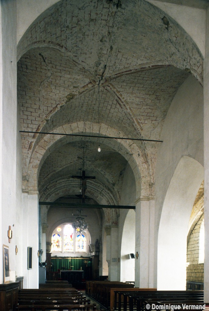 Dans les dispositions de cette époque, l’église comportait donc une nef étroite de quatre travées couvertes de voûtes d’arêtes (elles subsistent sur les travées deux et trois). Dans l’Oise, qui a connu très tôt la voûte d’ogives , elles constituent une véritable rareté dans leur association avec une nef. Lui faisait suite le petit chœur carré actuel, sans doute couvert également d’une voûte d’arêtes. La première travée, non voûtée, a été bâtie en 1736 aux dires de Graves. Elle pose de nombreux problèmes qu’il serait trop long d’exposer ici (comment interpréter, par exemple, le petit appareil du mur nord et sa fenêtre sans ébrasement extérieur ?) mais devait déjà exister – dans son principe – au 12ème siècle puisqu’elle correspond à la travée du bas-côté qui comporte un intéressant portail de cette époque.