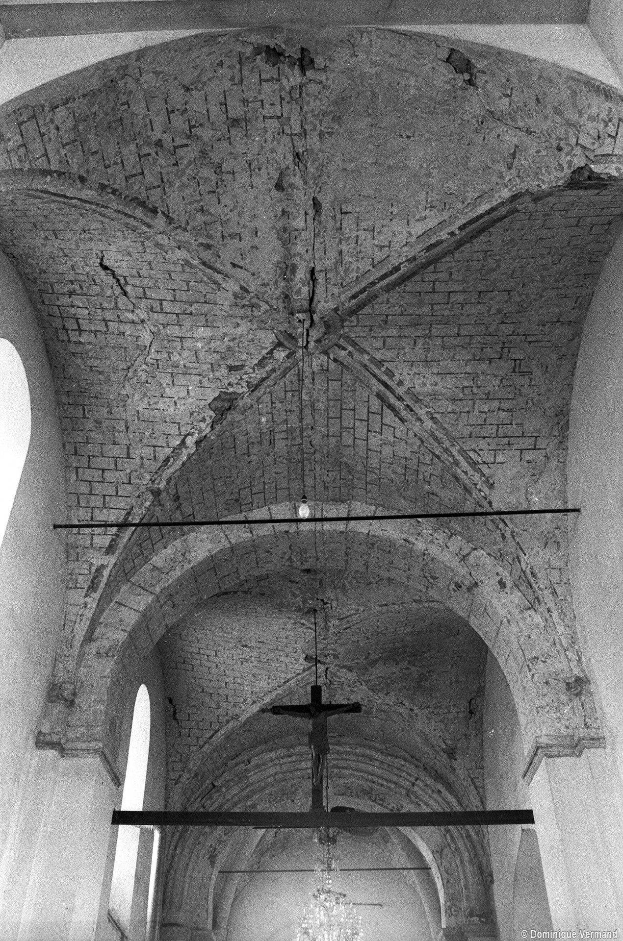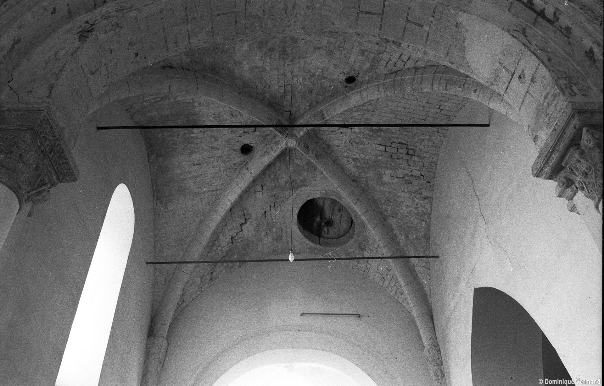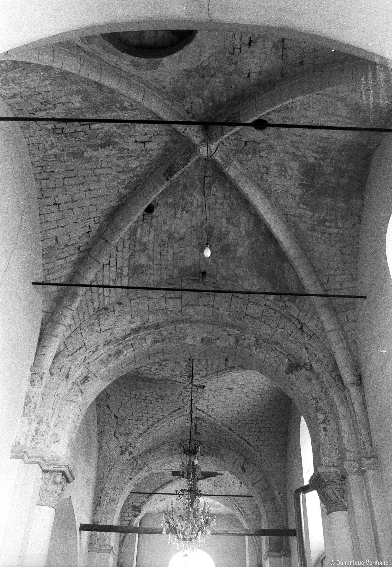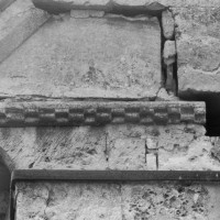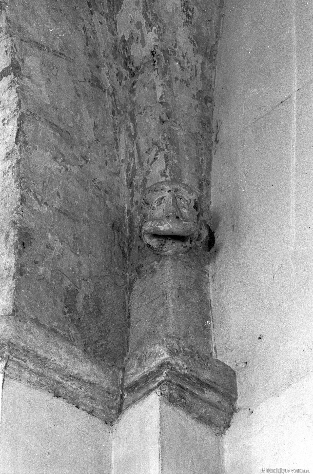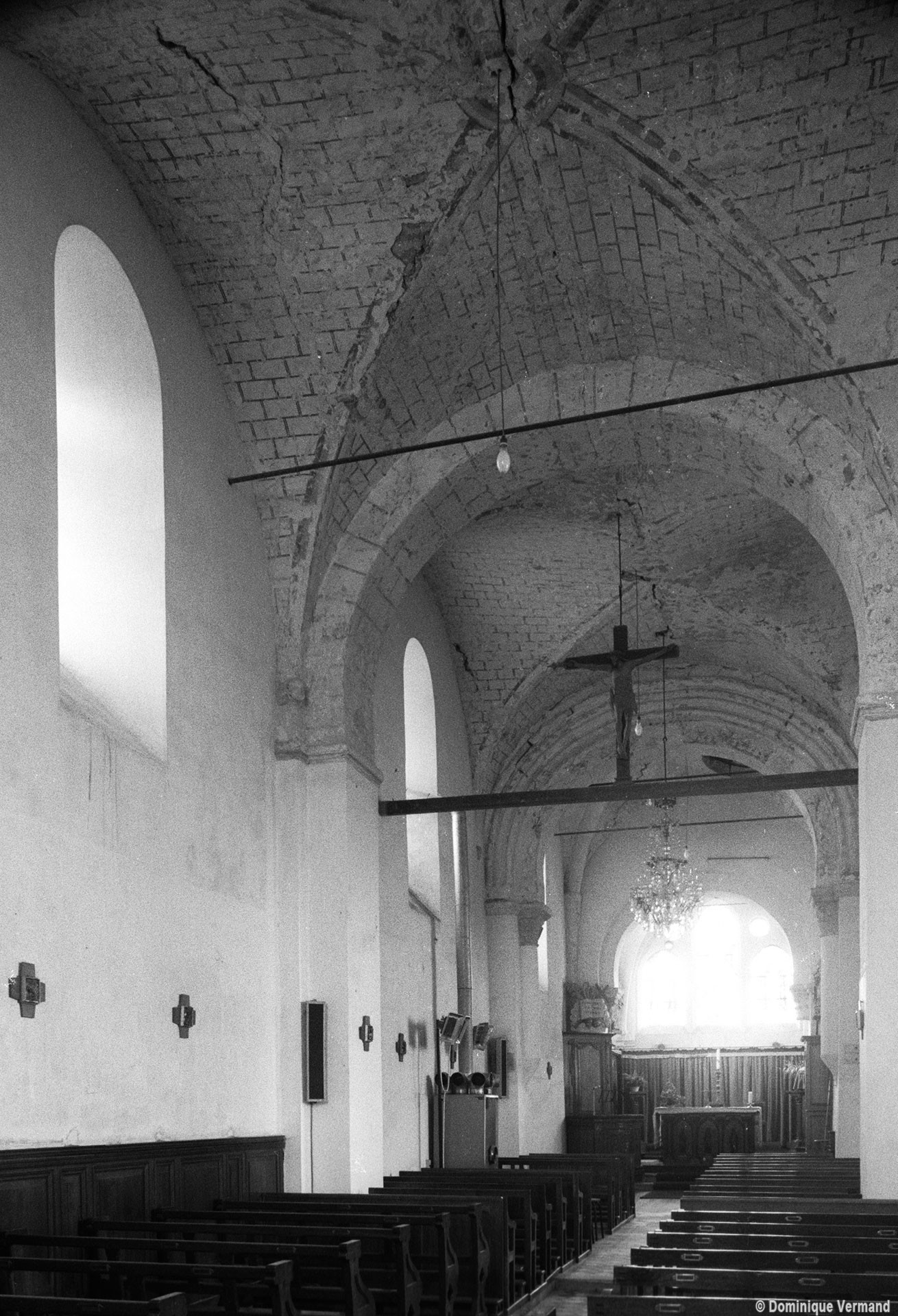 Dans les dispositions de cette époque, l’église comportait donc une nef étroite de quatre travées couvertes de voûtes d’arêtes (elles subsistent sur les travées deux et trois). Dans l’Oise, qui a connu très tôt la voûte d’ogives , elles constituent une véritable rareté dans leur association avec une nef. Lui faisait suite le petit chœur carré actuel, sans doute couvert également d’une voûte d’arêtes. La première travée, non voûtée, a été bâtie en 1736 aux dires de Graves. Elle pose de nombreux problèmes qu’il serait trop long d’exposer ici (comment interpréter, par exemple, le petit appareil du mur nord et sa fenêtre sans ébrasement extérieur ?) mais devait déjà exister – dans son principe – au 12ème siècle puisqu’elle correspond à la travée du bas-côté qui comporte un intéressant portail de cette époque.