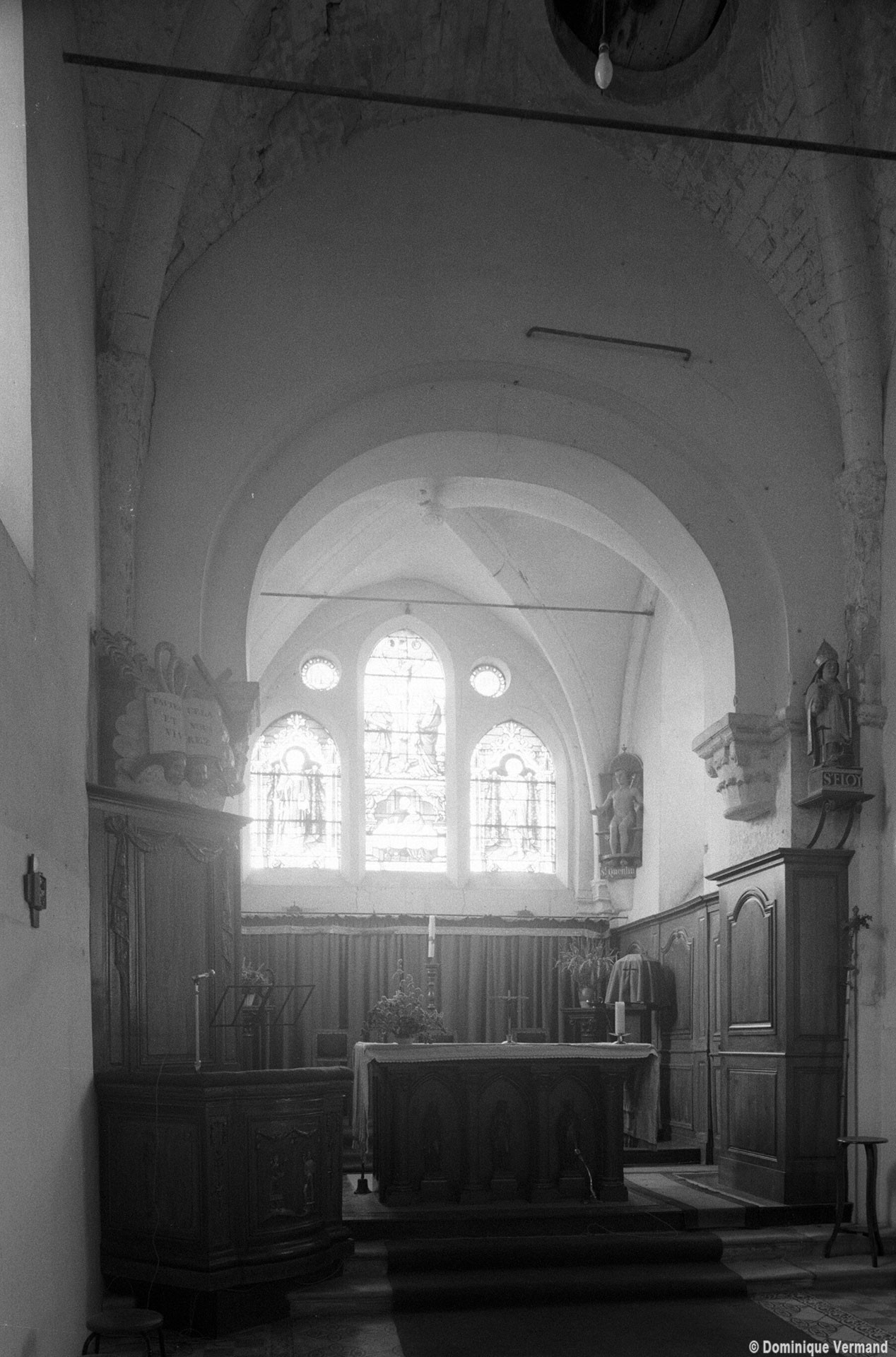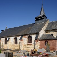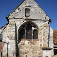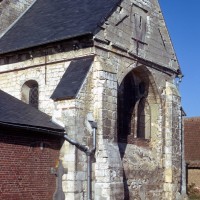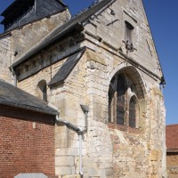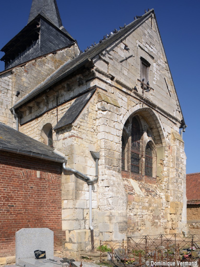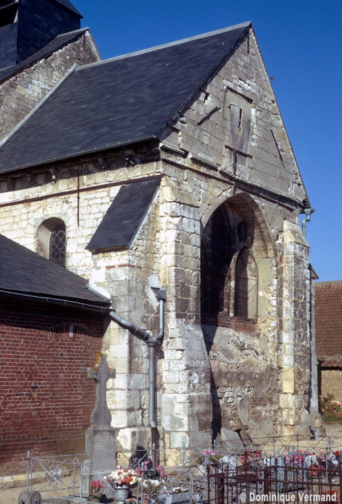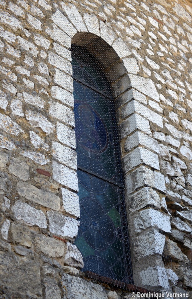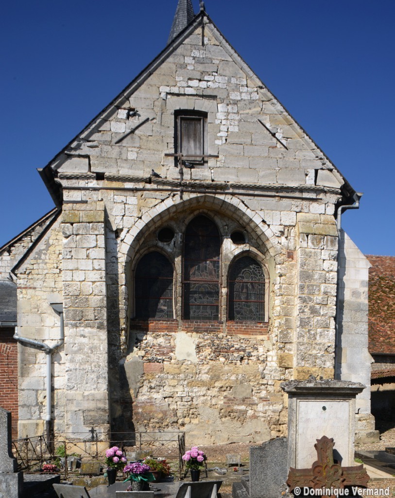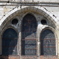 Parmi les travaux suivants, et outre le bas-côté qui n’a guère d’autre intérêt que son portail roman, on remarquera la fenêtre percée au début du 13ème siècle dans le mur est du chœur, en remplacement du ou des ouvertures romanes primitives. Constituée de trois lancettes dont celle du centre, plus haute, s’encadre de deux oculi, elle constitue une copie simplifiée de celle qui s’ouvre au chevet de l’église de Bury (2020).