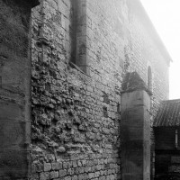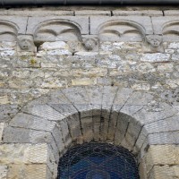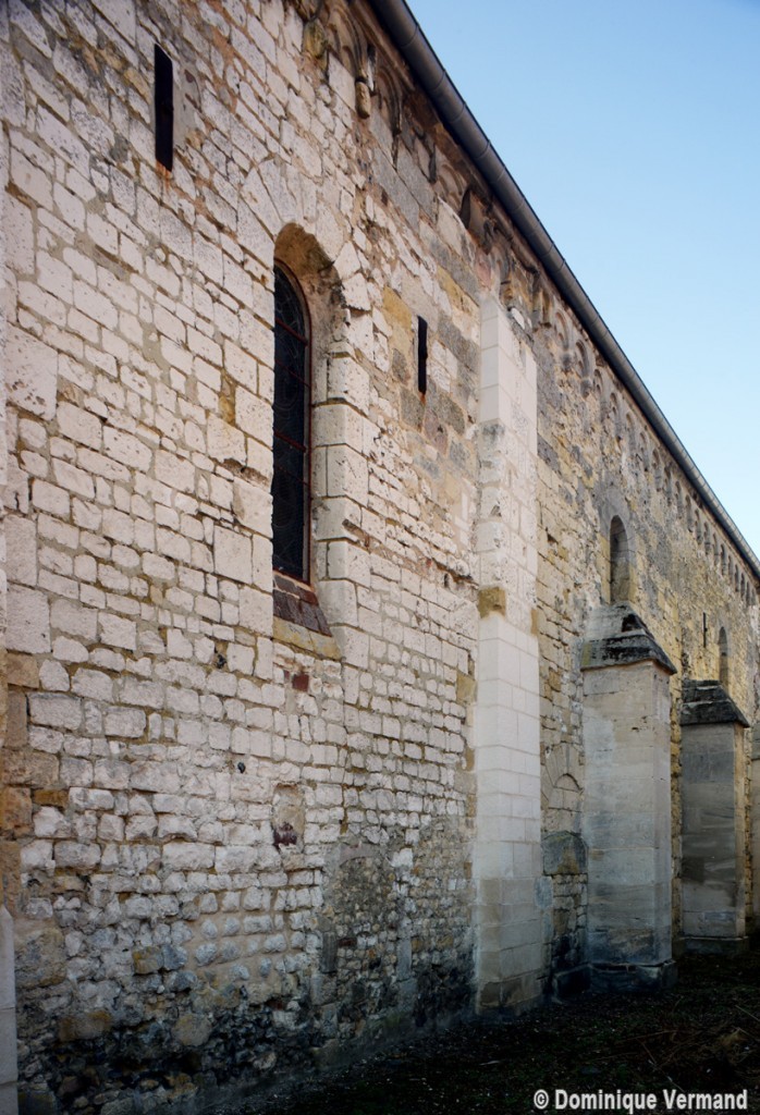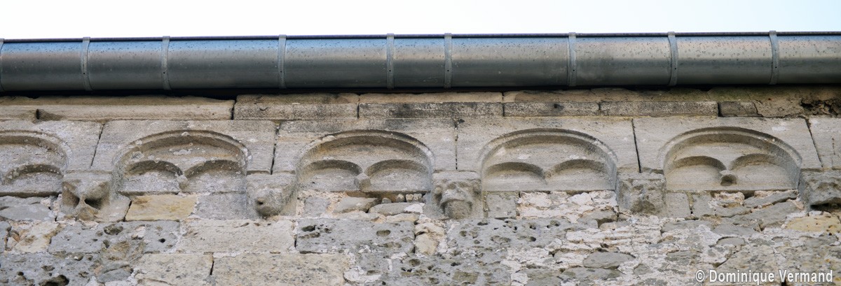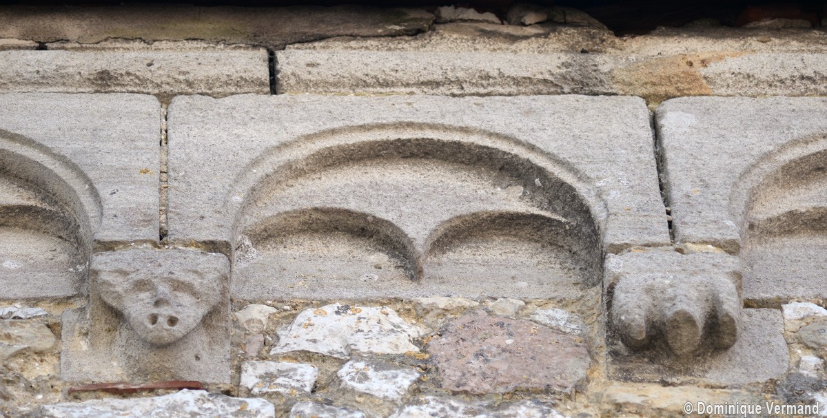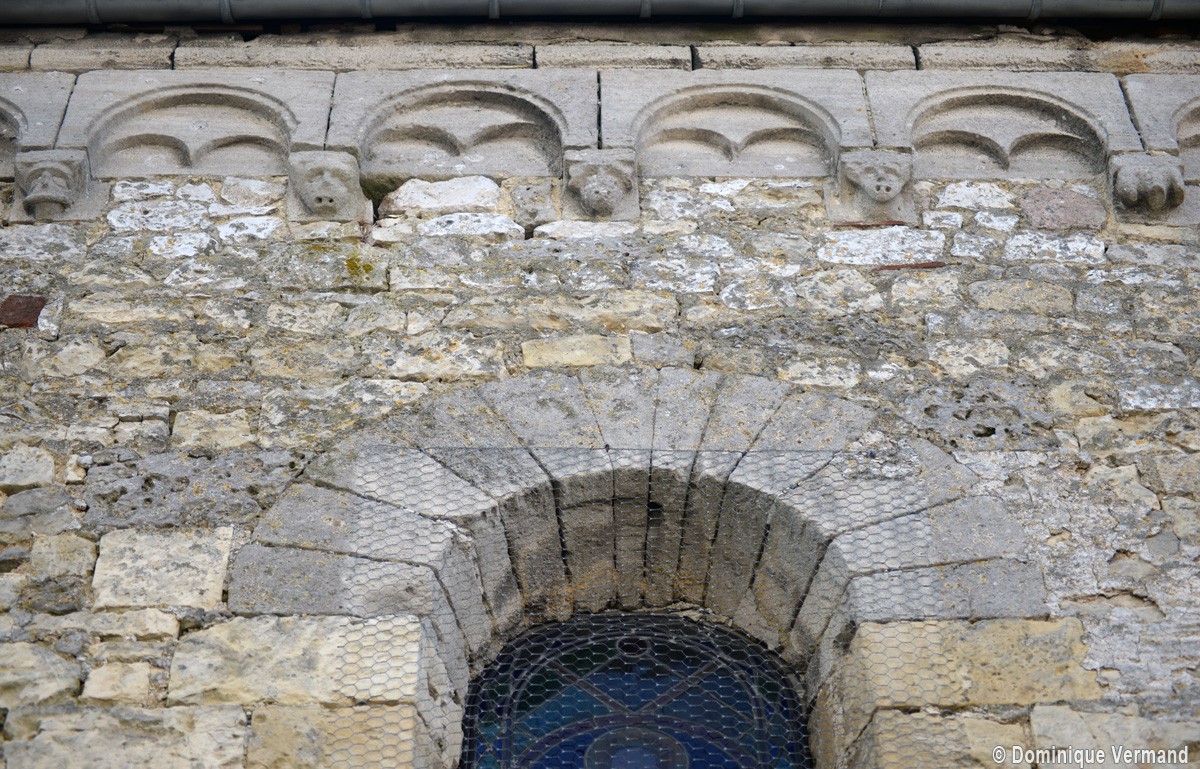 Ce dernier ensemble se remarque, en outre, par les deux voûtes d’ogives qui le recouvre. Montées dans le second quart du 12ème siècle, elles rappellent celles, contemporaines, de la cathédrale de Senlis et remplacent les voûtes d’arêtes d’origine, qui s’étaient écroulées comme le montrent les reprises visibles à la dernière travée, un événement qui aurait pu également concerner la première travée de la nef. C’est sans doute à ces travaux de reconstruction partielle qu’il faut attribuer les parties hautes du mur nord avec sa corniche beauvaisine (elle existe également au sud, dissimulée par les combles du bas-côté). Son faible relief ne saurait en effet la placer à la même date que la pittoresque corniche du chœur qui, avec sa tablette sculptée de billettes et ses modillons décorés d’animaux fantastiques, est sans doute d’un demi-siècle plus ancienne.
