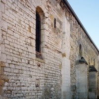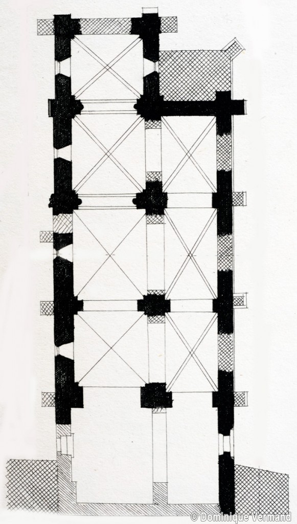 Son plan est constitué d’une nef de quatre travées que termine un petit chœur carré. Un bas-côté flanque la nef au sud. Mais cette apparente simplicité du plan cache en réalité une histoire architecturale infiniment plus difficile à appréhender. L’analyse des maçonneries et du décor montre que l’essentiel des parties les plus anciennes remonte au début du 12ème siècle et que, malgré les modifications ultérieures, le plan de l’édifice était identique à celui que l’on observe aujourd’hui.