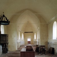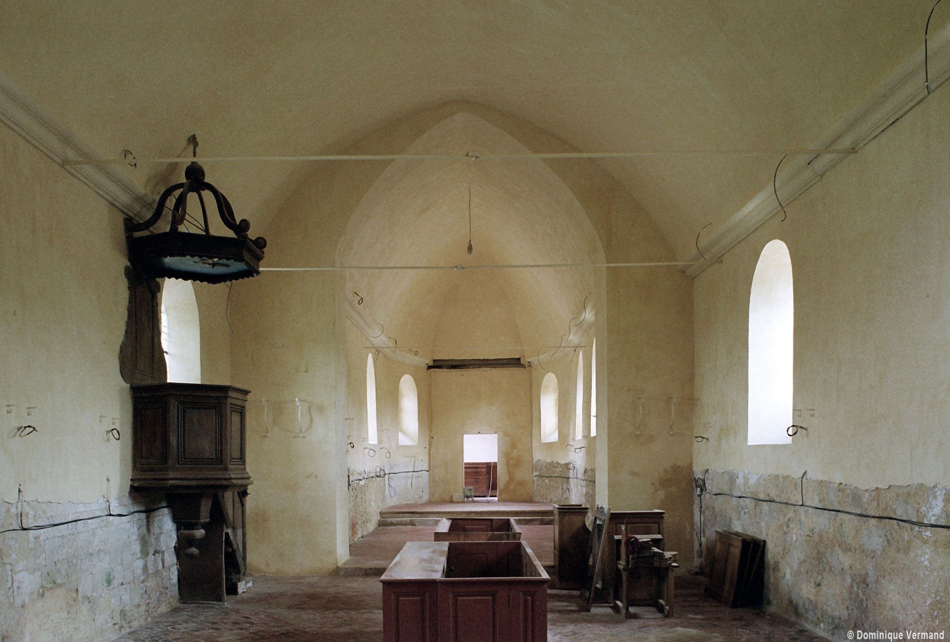 Saint-Jacques est un édifice à la silhouette très allongée dont le plan comprend une nef unique (sans bas-côtés) et un chœur beaucoup plus étroit terminé par une abside à trois côtés. C’est un édifice relativement homogène qui doit remonter, pour l’essentiel, au 17ème siècle. Un simple lambris, à la pente marquée dans le chœur et, au contraire, surbaissé dans la nef, le couvre. Au revers de la façade, un ouvrage en charpente indépendant des murs supporte le petit clocher couvert d’ardoises.