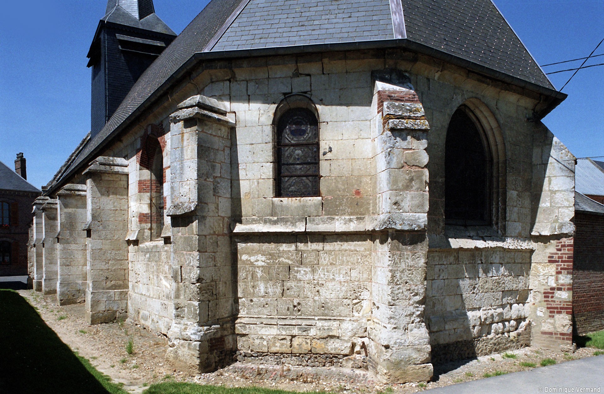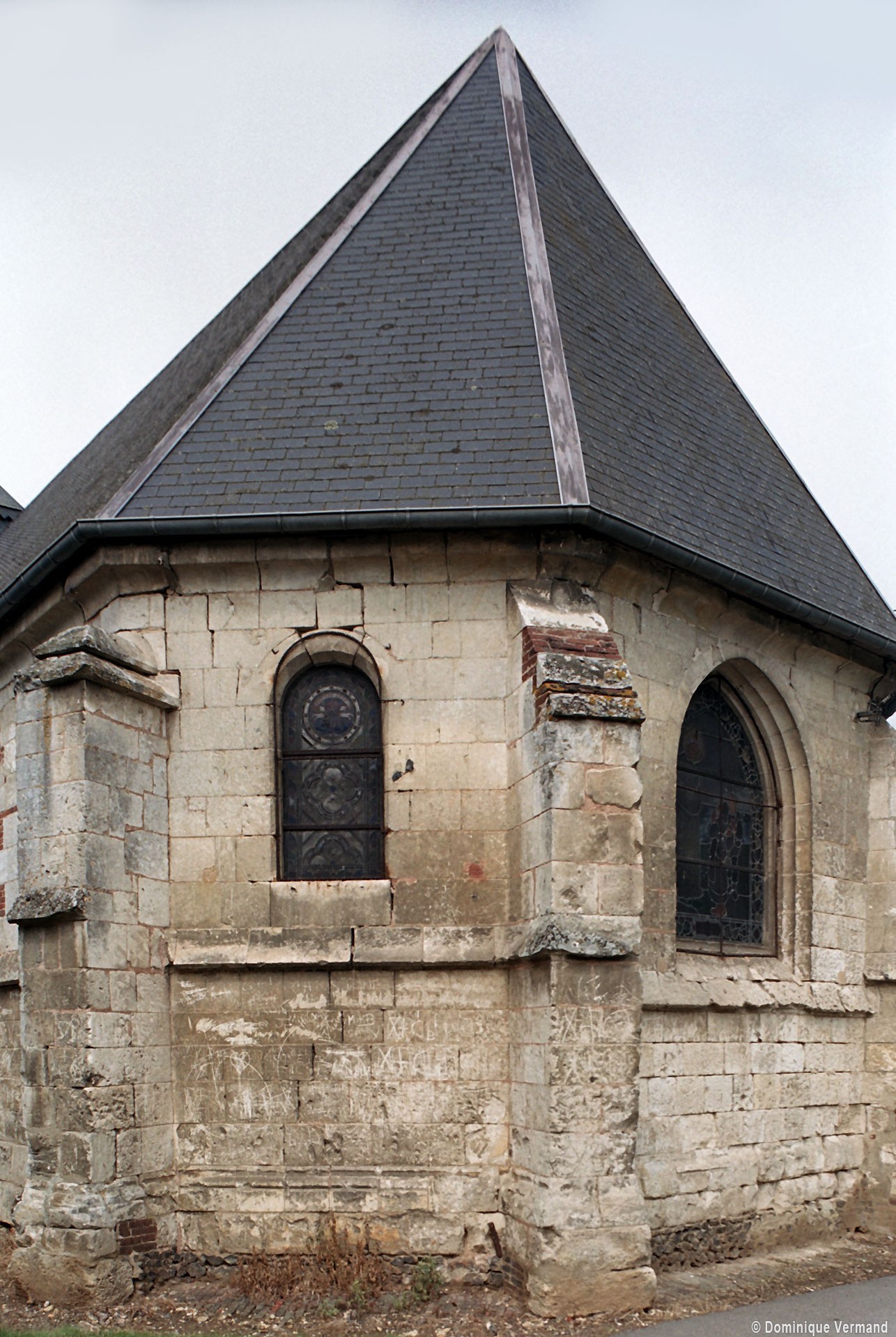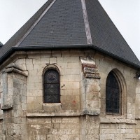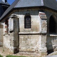 Un larmier continu se développe au niveau de l’appui des fenêtres et contourne les contreforts. Les fenêtres qui n’ont pas été refaites sont petites et en plein cintre mais, comme souvent, l’accent a été mis sur celle qui s’ouvre au centre du chevet, en forme de lancette et beaucoup plus grande.