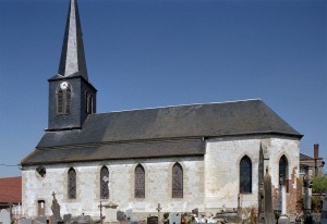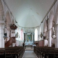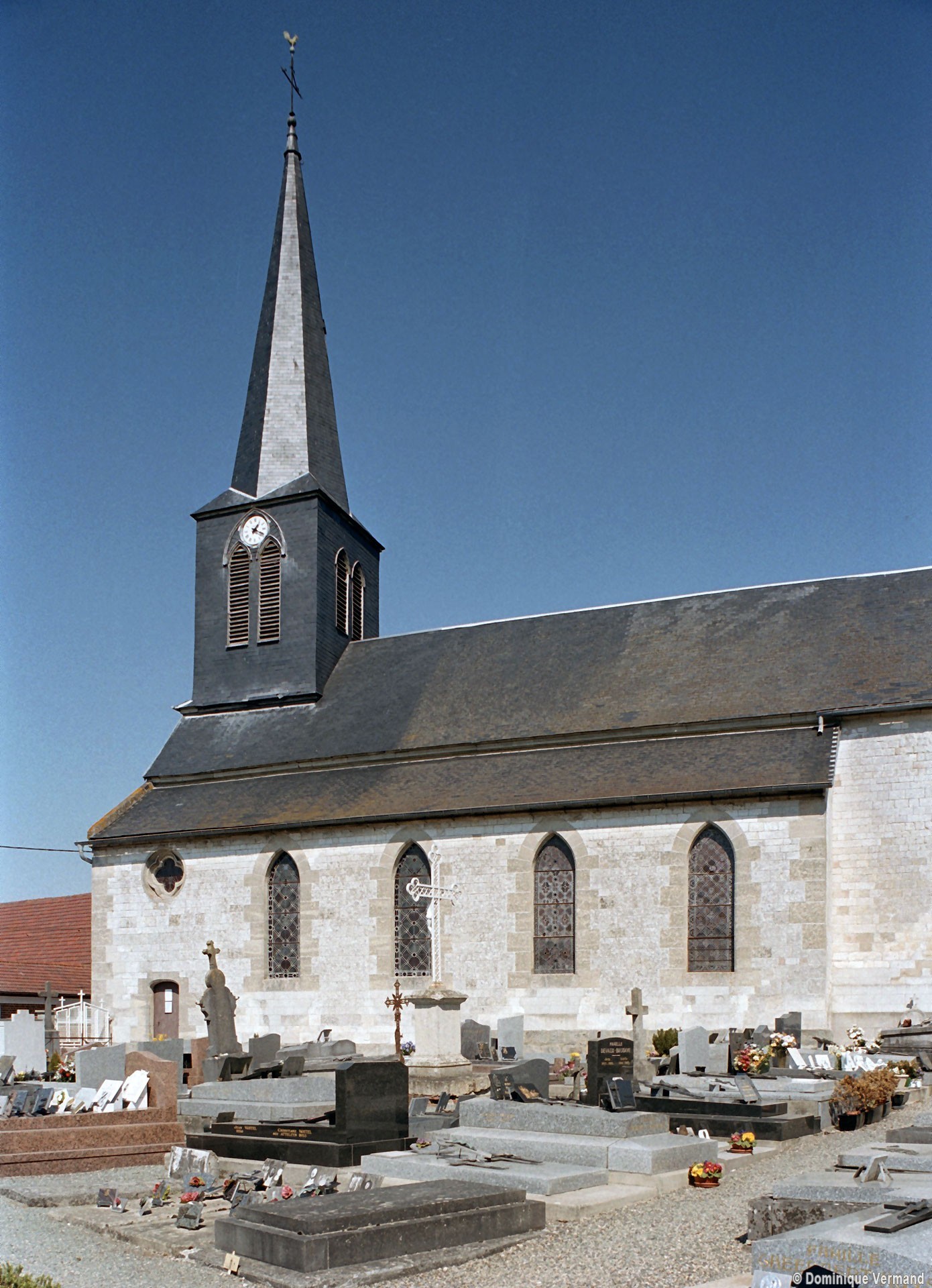 La nef communique avec les bas-côtés, très étroits, par cinq arcades retombant sur des piles circulaires par l’intermédiaire de chapiteaux décorés de crochets dans le style du 13ème siècle. Les fenêtres sont partout de simples lancettes et l’on note la présence, en façade et en retour de celle-ci, de trois petits oculi quadrilobés. Tout l’édifice est couvert d’un simple lambris. Le chevet porte les traces de réparations effectuées en brique, la commune s’étant trouvée un moment sur la ligne des combats pendant la Guerre 1914-1918.