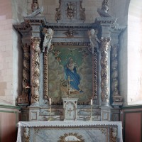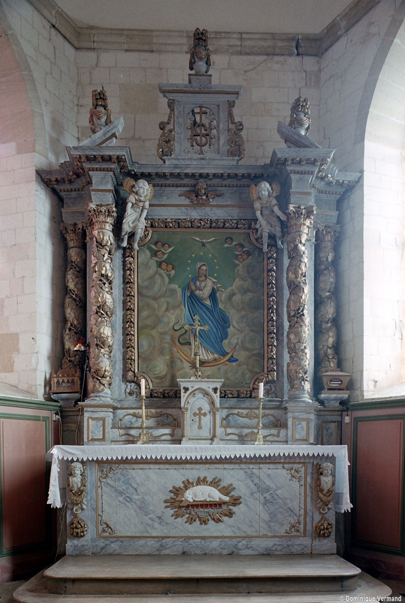 Le chœur abrite un spectaculaire retable de style baroque aux colonnes torsadées richement décorées de feuilles de vigne et de raisins, encadrant une Vierge en Gloire. Assez curieusement, l’église ne possède pas de vitraux des ateliers Bazin qui, installés au Mesnil-Saint-Firmin, ont produit de très nombreux vitraux – pour l’essentiel dans la seconde moitié du 19ème siècle – pour les édifices de la région (2005).