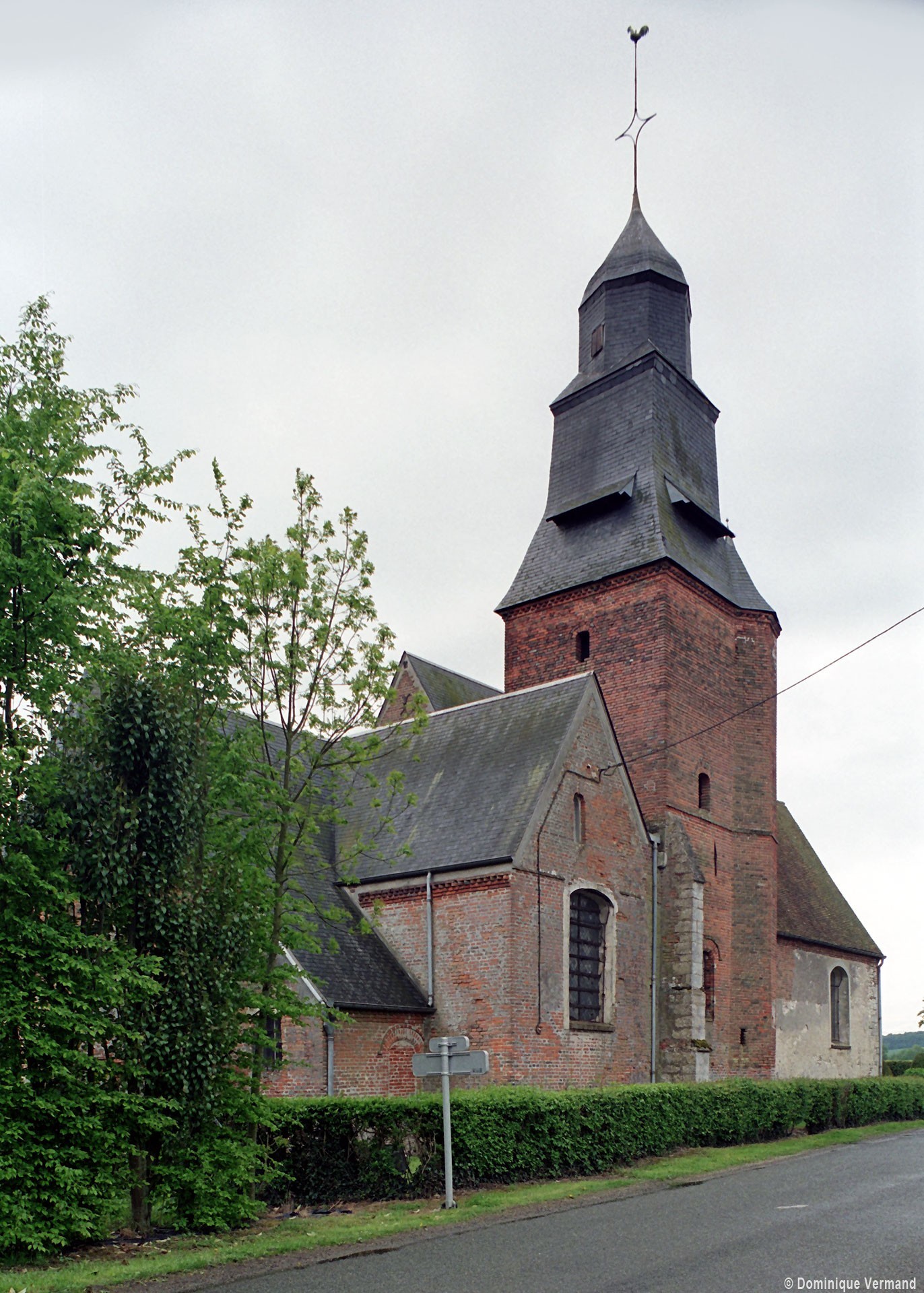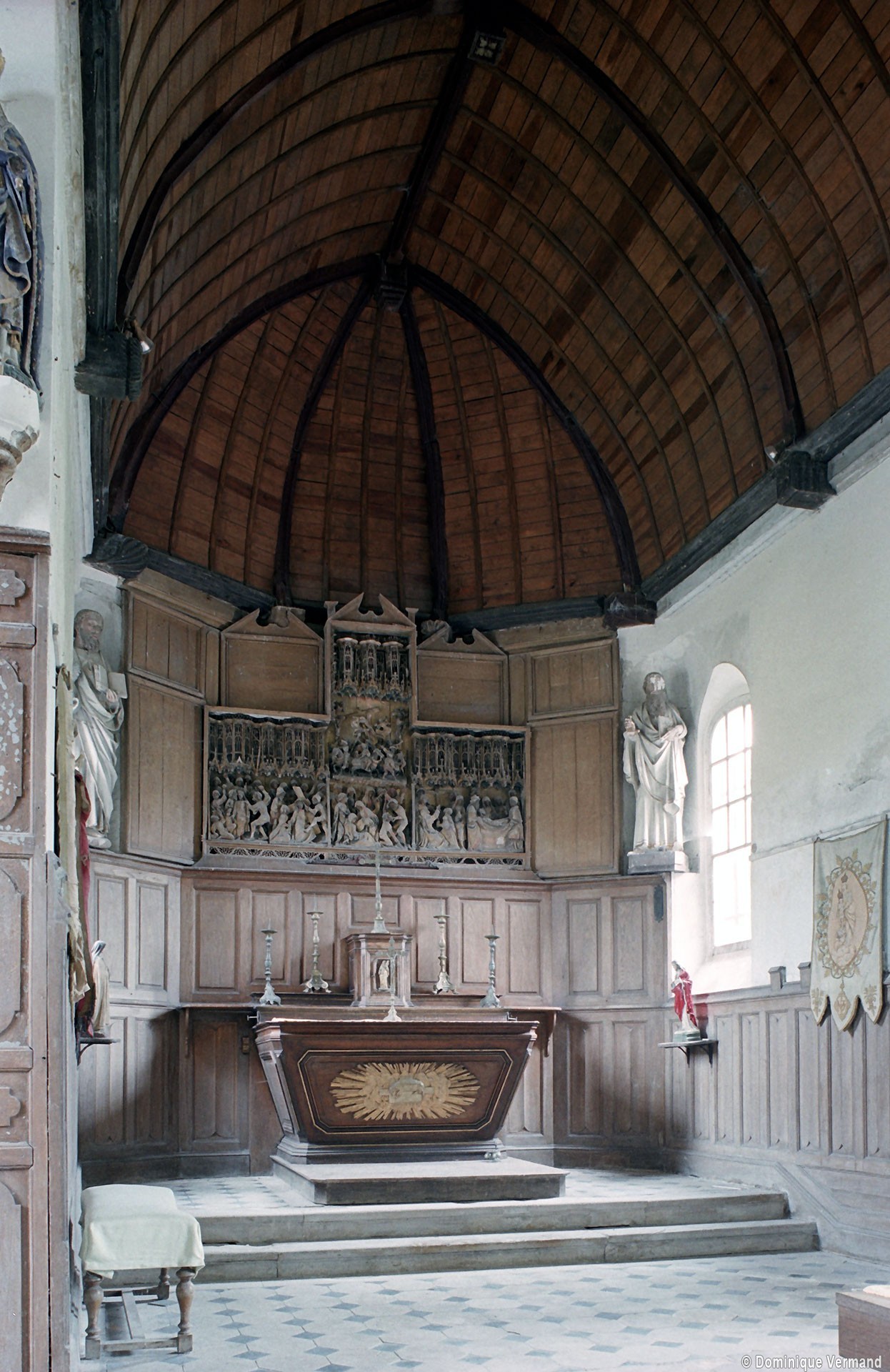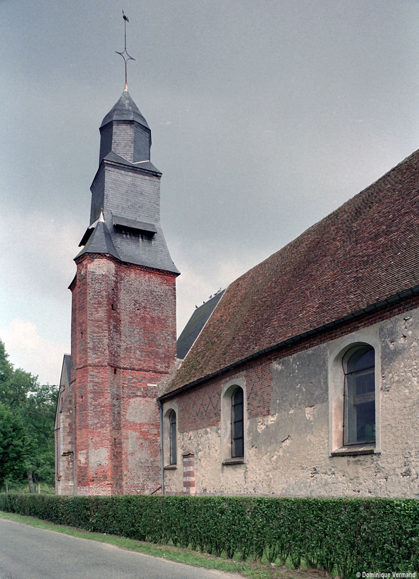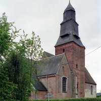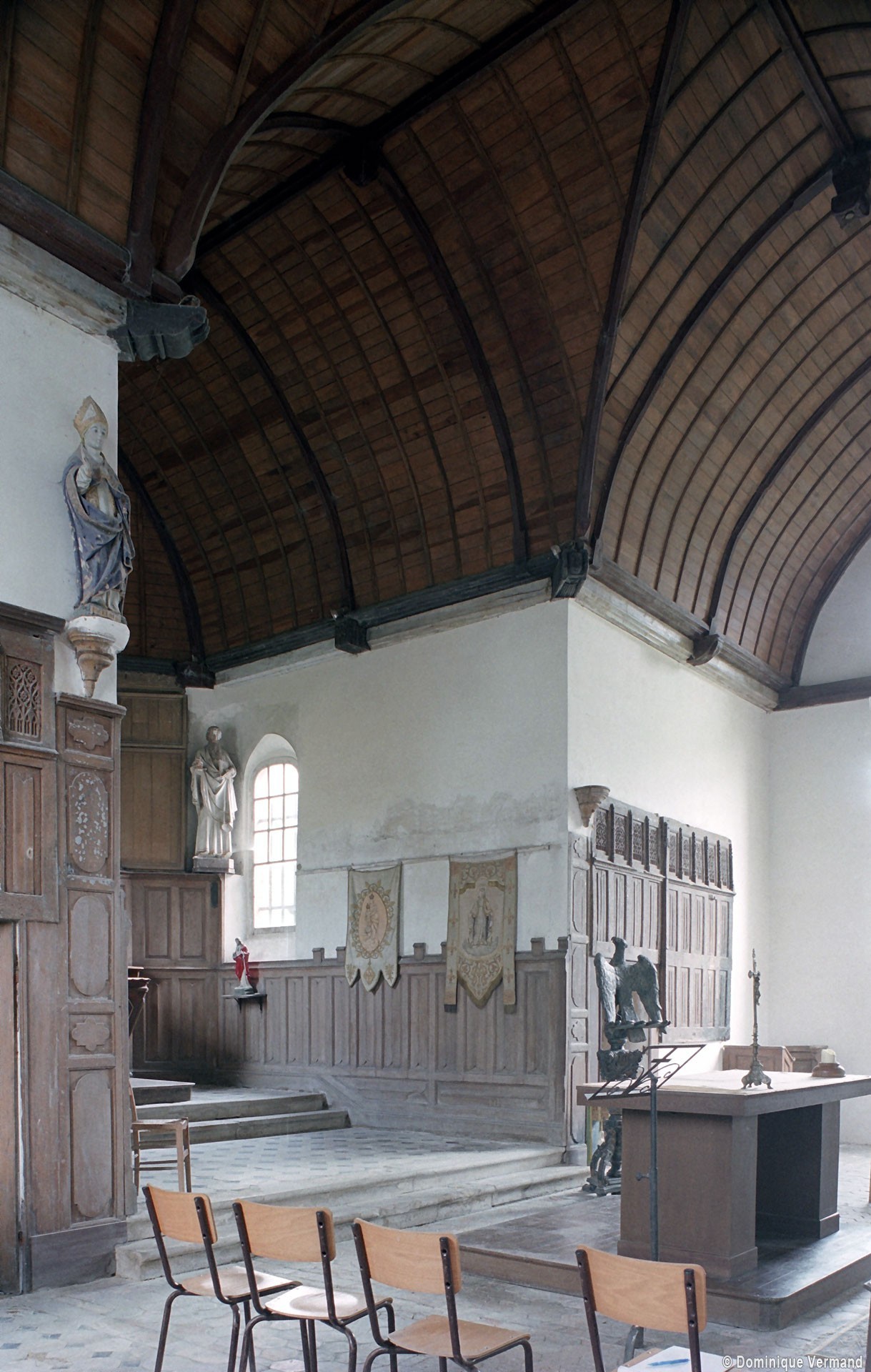 Construites en briques au 16ème siècle, les parties orientales comprennent un transept saillant et un choeur pentagonal, complétés au nord-ouest d’un clocher et au sud-ouest d’une chapelle autrefois à usage seigneurial. Les quelques fenêtres qui n’ont pas été refaites sont en cintre surbaissé souligné d’une simple moulure en brique. De belles charpentes en carène, également du 16ème siècle, couvrent les différentes parties de l’église. Celles du choeur et du transept ont cependant été refaites à l’identique après un incendie survenu en 1970.