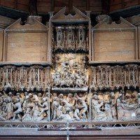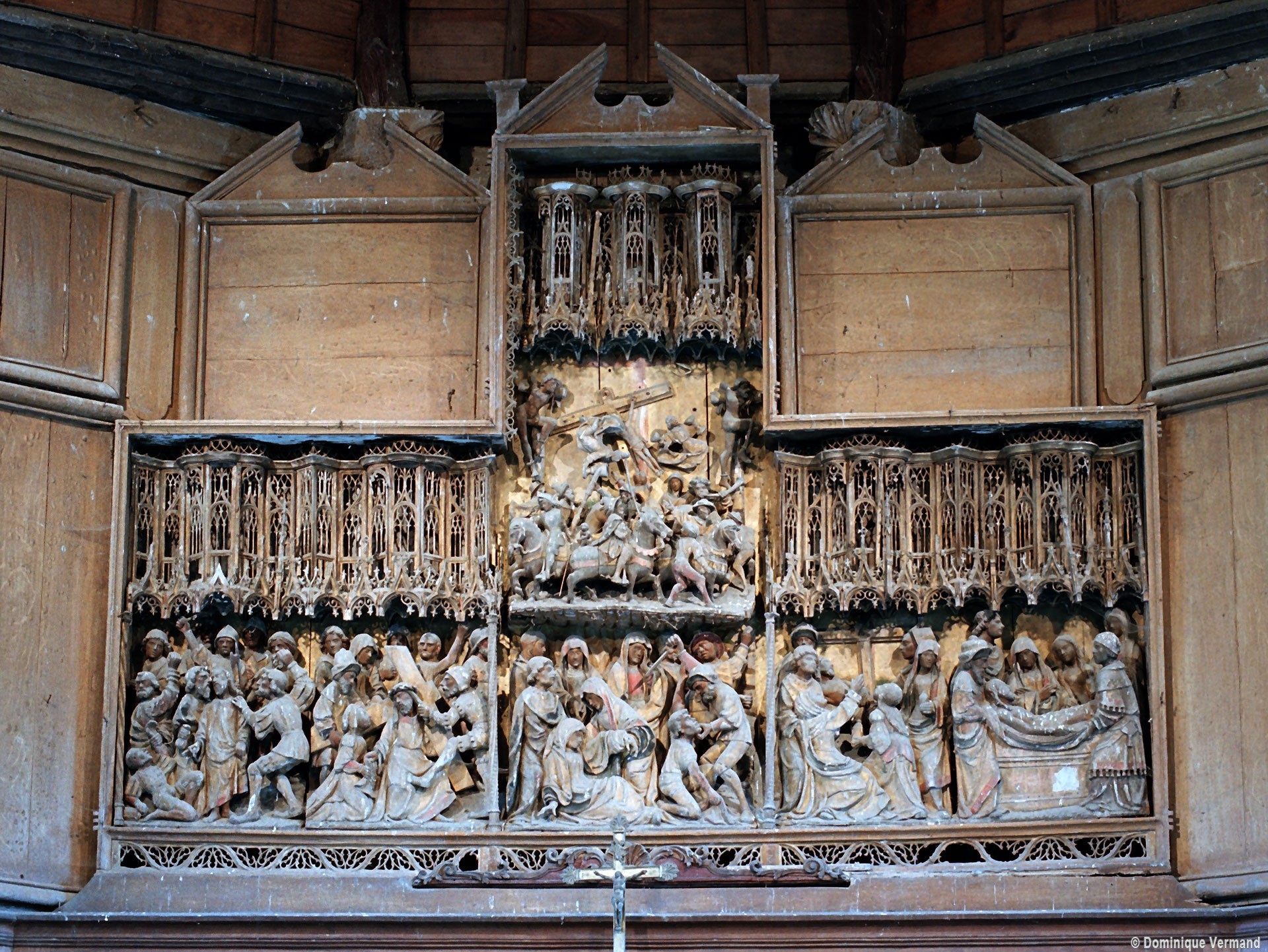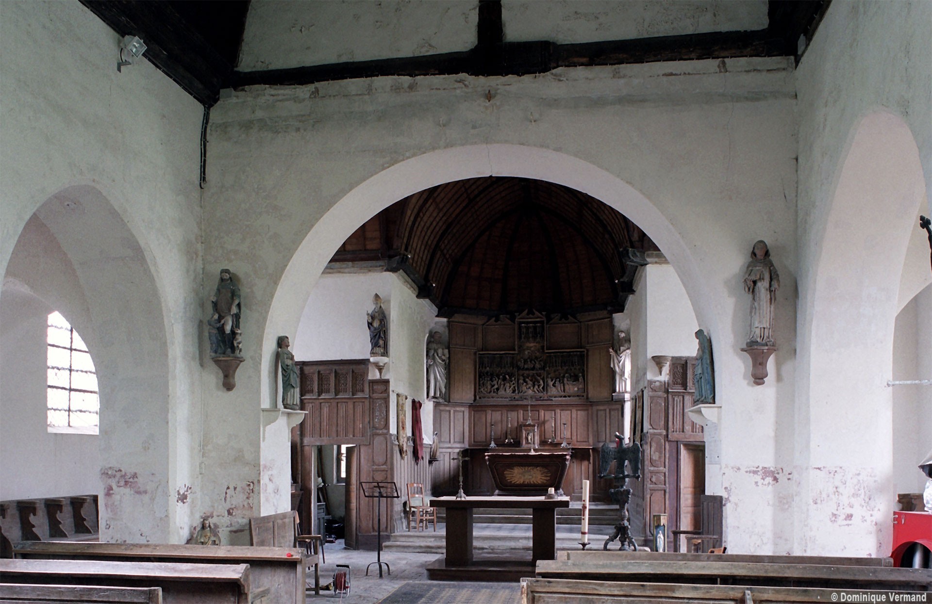 L’église est riche d’un mobilier aussi varié qu’exceptionnel, au premier rang duquel on retiendra le superbe retable en bois sculpté et doré du 16ème siècle. Représentant la Passion du Christ, il est vraisemblablement issu du même atelier que celui de Sérifontaine. Il faut également signaler la balustrade du début de la Renaissance de la tribune de la nef et le rare petit orgue Cavaillé-Coll du 19ème siècle qui y est installé. De nombreuses statues d’art populaire principalement du 16ème siècle, une poutre de gloire du 18ème siècle, un aigle lutrin du 17ème siècle ajoutent à l’intérêt de cette attachante église (2006).