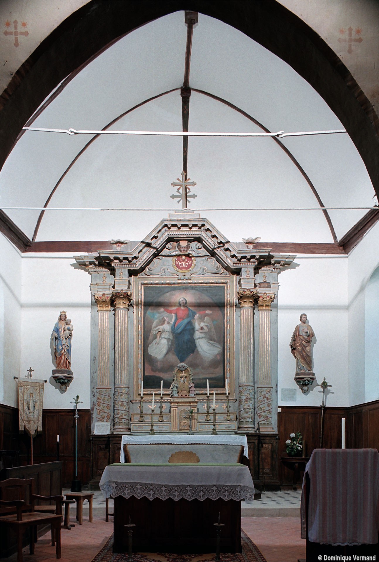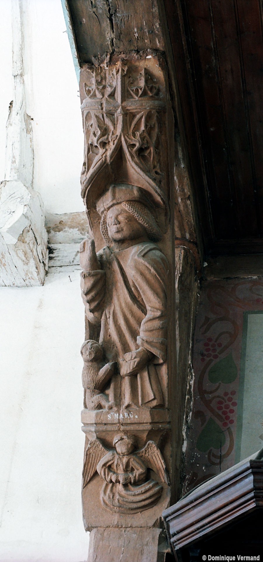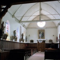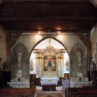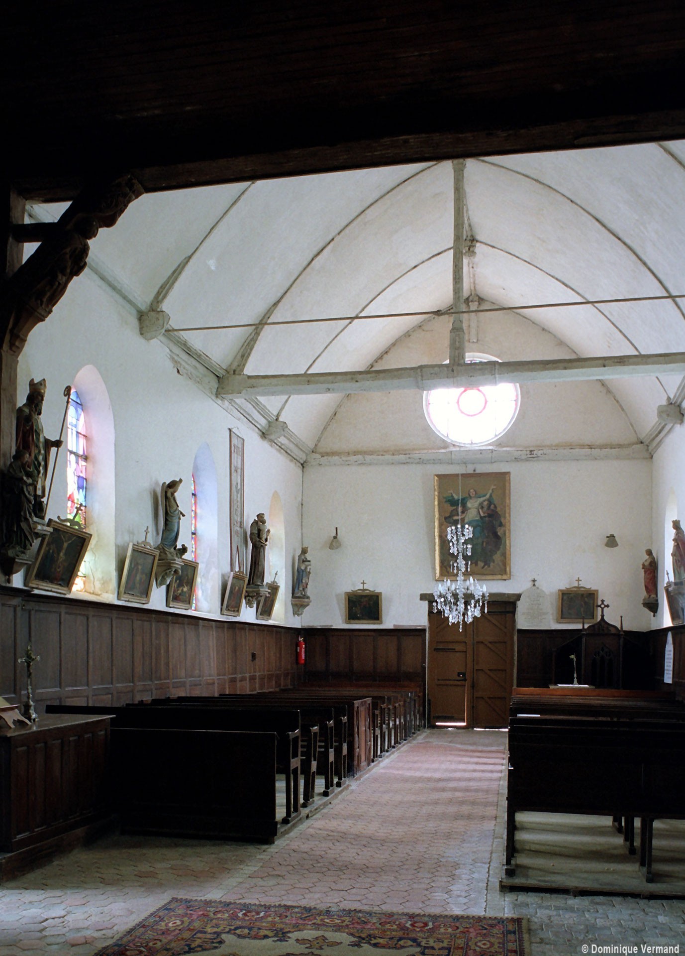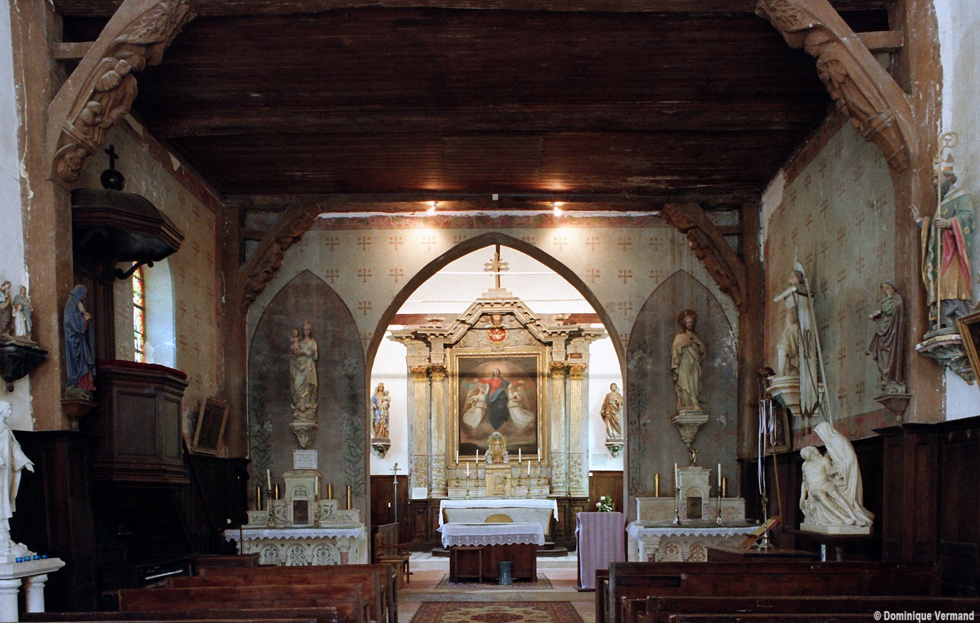 A l’intérieur, la nef est couverte par une charpente en carène renversée contemporaine de la construction. Un dispositif classique avec entrait et poinçon la soulage à mi-longueur. La première travée du choeur, qui reçoit le clocher, est renforcée par un mur percé d’une arcade en tiers-point. Ce dispositif est complété par une structure en bois remarquable par son décor sculpté. Les quatre jambettes qui la renforcent accueillent en effet, entre un dais de style flamboyant et une console sculptée d’un ange, la représentation des quatre évangélistes avec leurs attributs : au nord, saint Marc avec le lion et saint Mathieu avec l’ange ; au sud, saint Jean avec l’aigle et saint Luc avec le taureau. On détaillera également le très beau retable du maître-autel (18ème siècle) ainsi qu’une rare cuve baptismale en pierre de style renaissance, du milieu du 16ème siècle (2006).