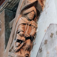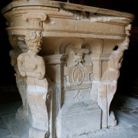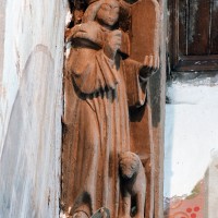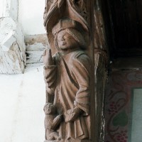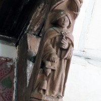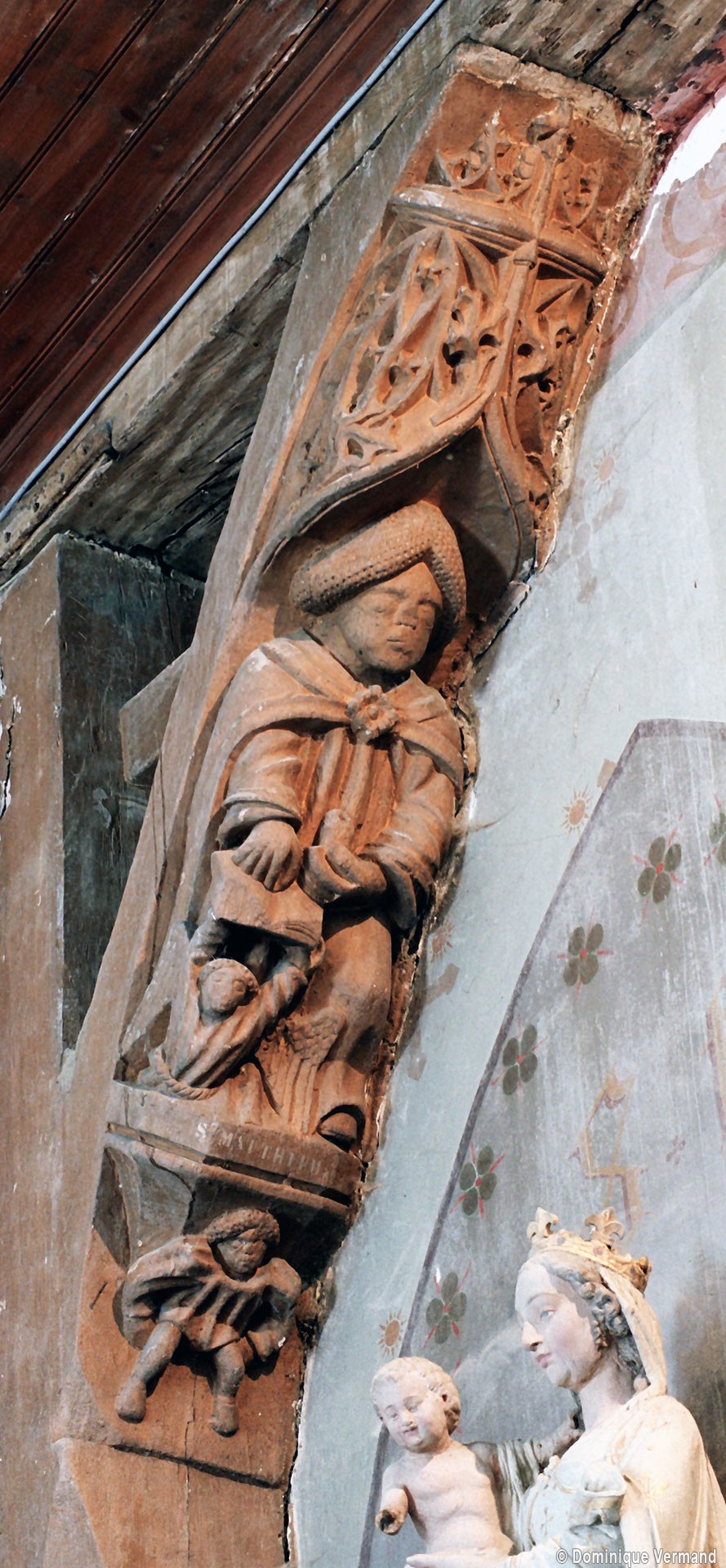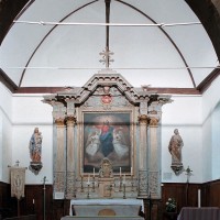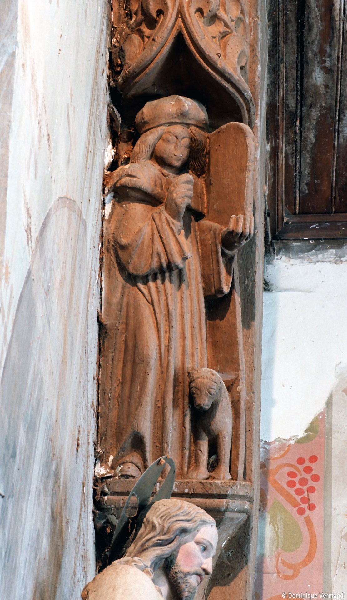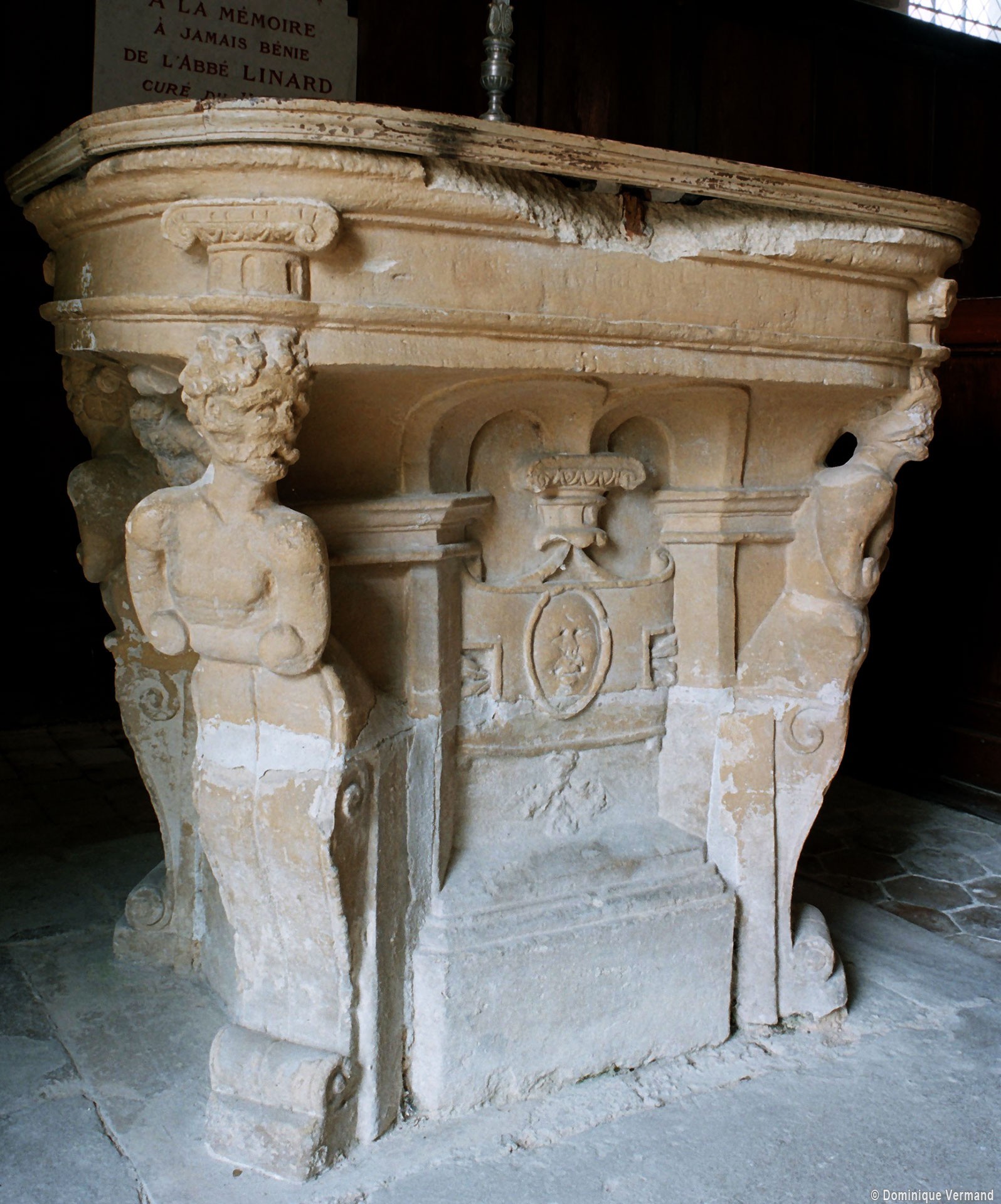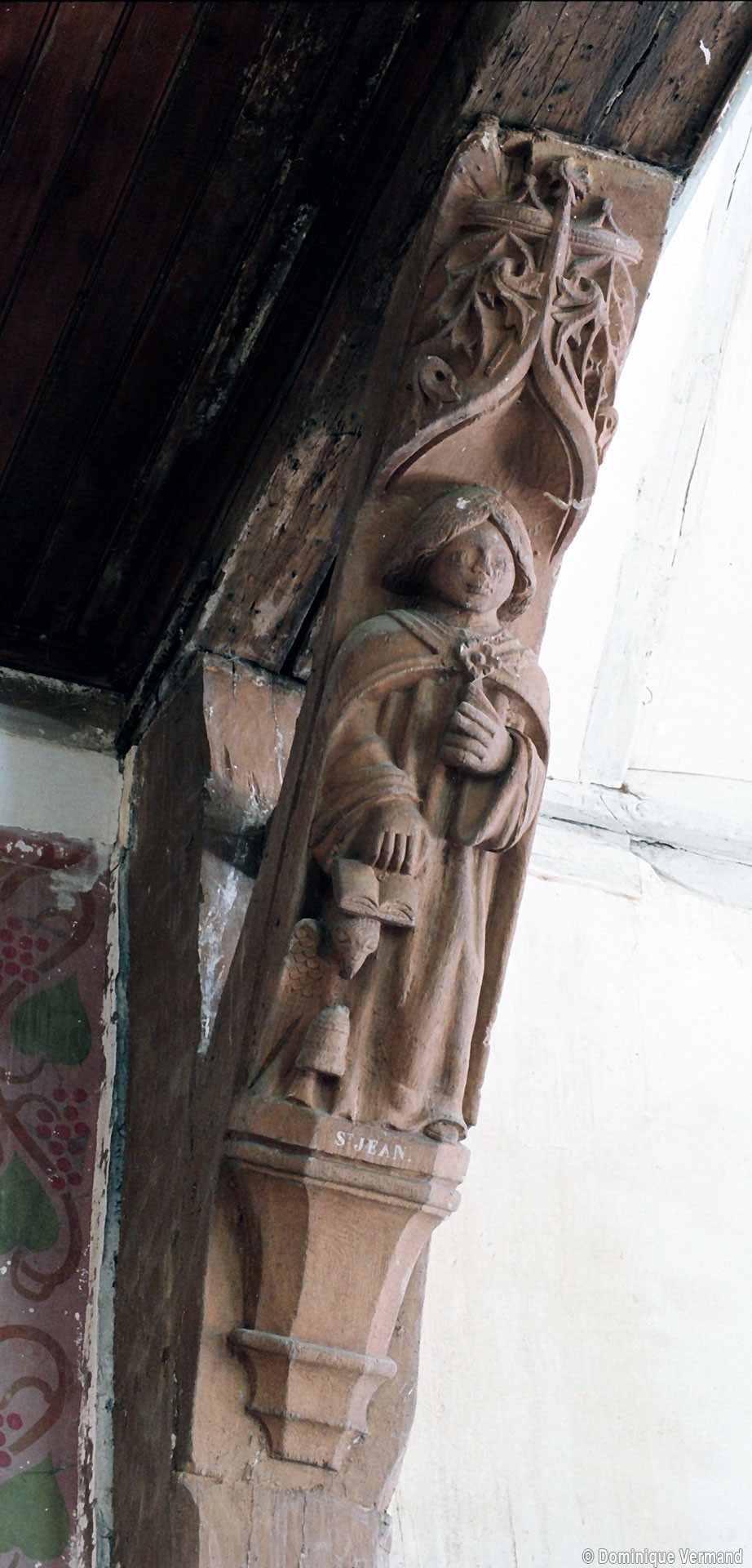 A l’intérieur, la nef est couverte par une charpente en carène renversée contemporaine de la construction. Un dispositif classique avec entrait et poinçon la soulage à mi-longueur. La première travée du choeur, qui reçoit le clocher, est renforcée par un mur percé d’une arcade en tiers-point. Ce dispositif est complété par une structure en bois remarquable par son décor sculpté. Les quatre jambettes qui la renforcent accueillent en effet, entre un dais de style flamboyant et une console sculptée d’un ange, la représentation des quatre évangélistes avec leurs attributs : au nord, saint Marc avec le lion et saint Mathieu avec l’ange ; au sud, saint Jean avec l’aigle et saint Luc avec le taureau. On détaillera également le très beau retable du maître-autel (18ème siècle) ainsi qu’une rare cuve baptismale en pierre de style renaissance, du milieu du 16ème siècle (2006).