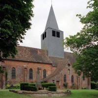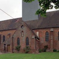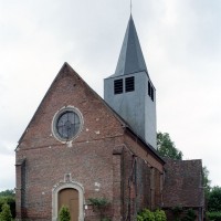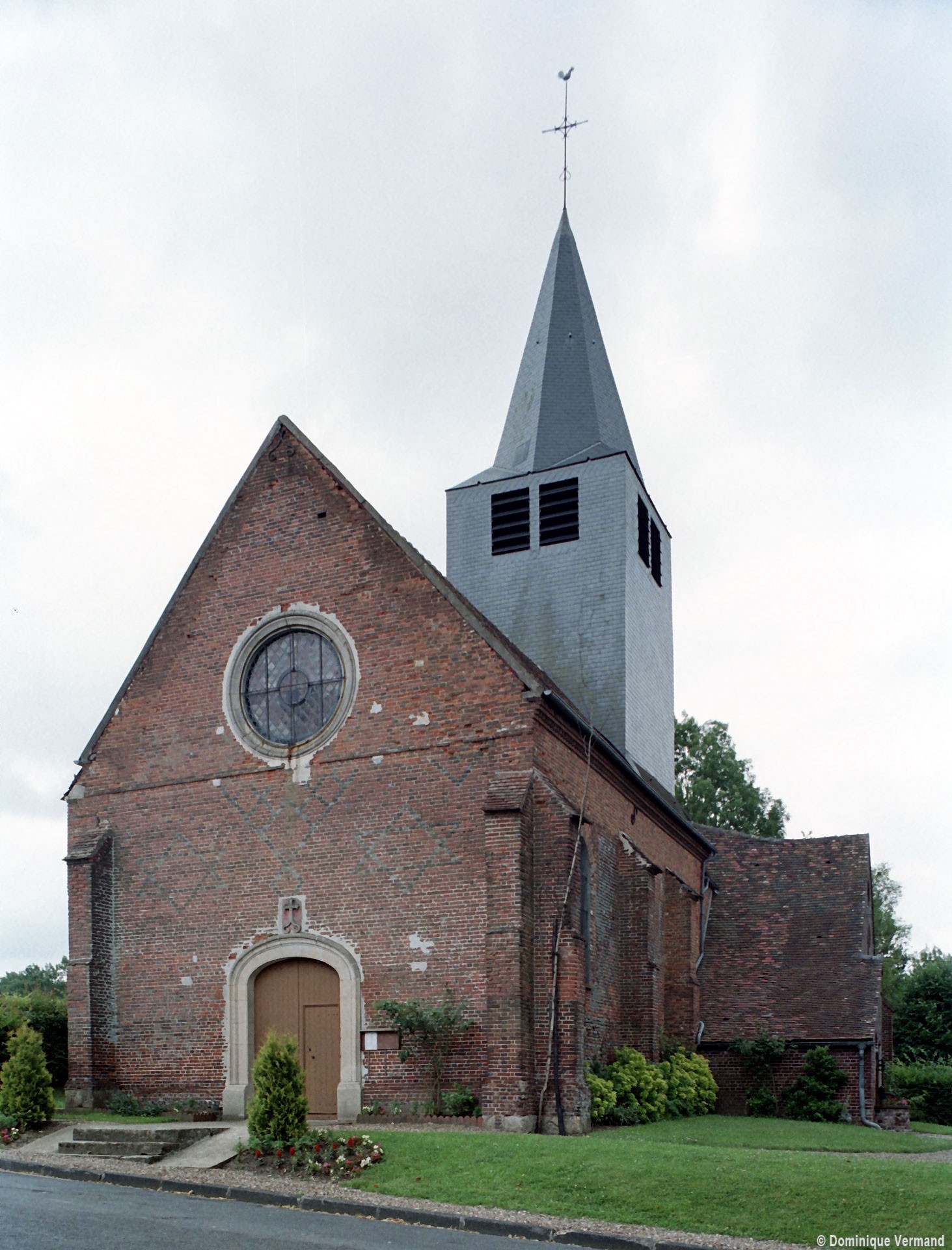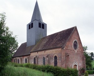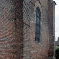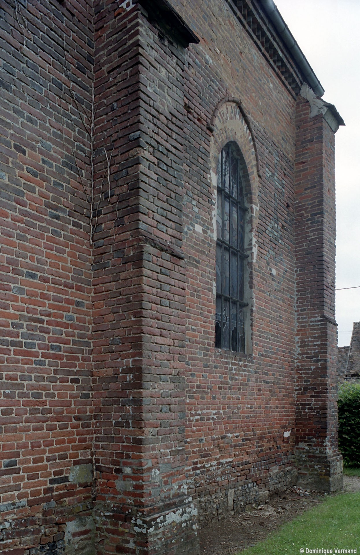 Tout l’édifice est construit en briques, très répandues dans cette région où la pierre est absente. La cuisson au feu de bois utilisée jusqu’au milieu du 19ème siècle pour leur fabrication ne permettant pas d’obtenir des briques homogènes, la couleur variant du rose clair au noir, ce défaut fut souvent mis à profit pour obtenir des effets décoratifs. C’est le cas ici où des motifs géométriques se remarquent à la façade de même qu’une croix de saint André et un coeur au mur nord de la nef. Toutes les fenêtres sont en arc brisé et celles de la nef étaient soulignées à l’origine par une petite moulure, toujours en briques.