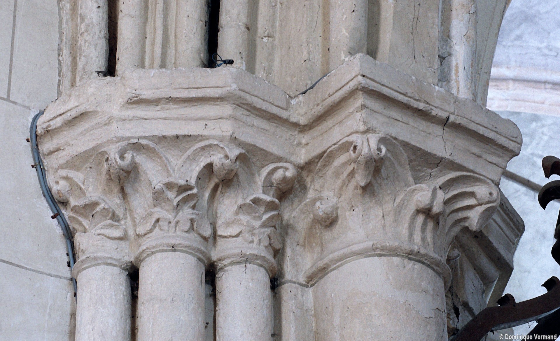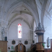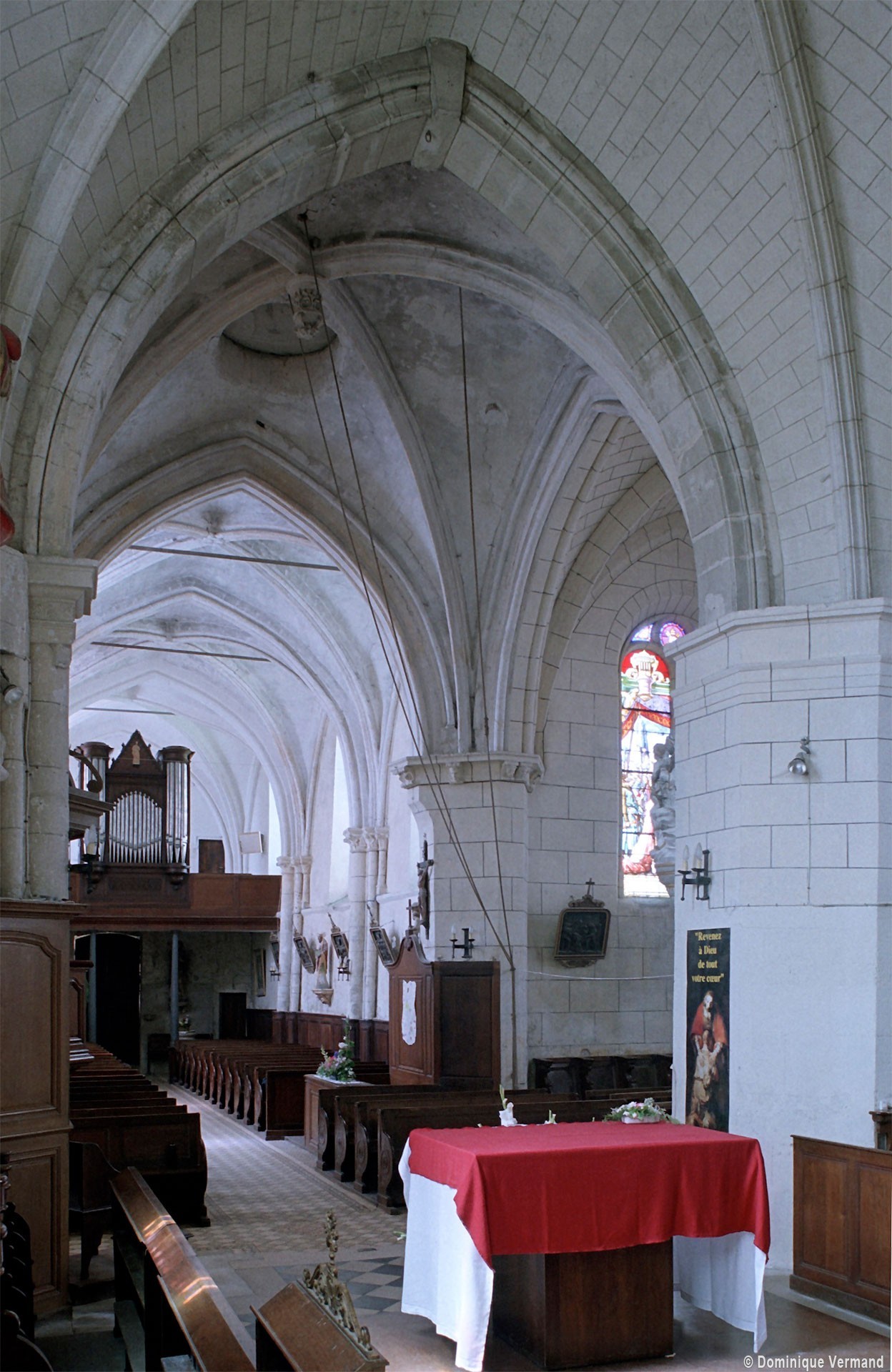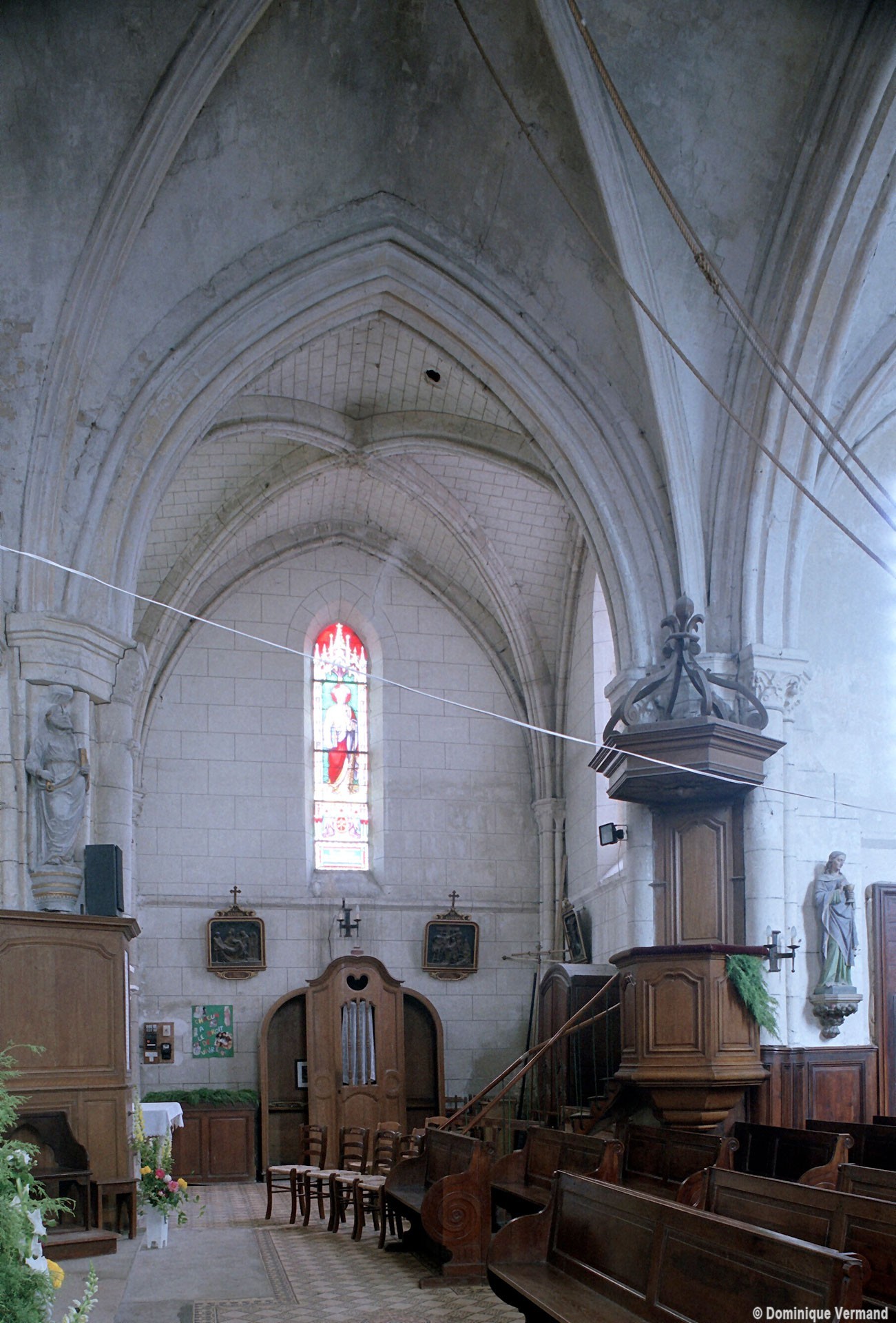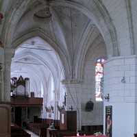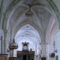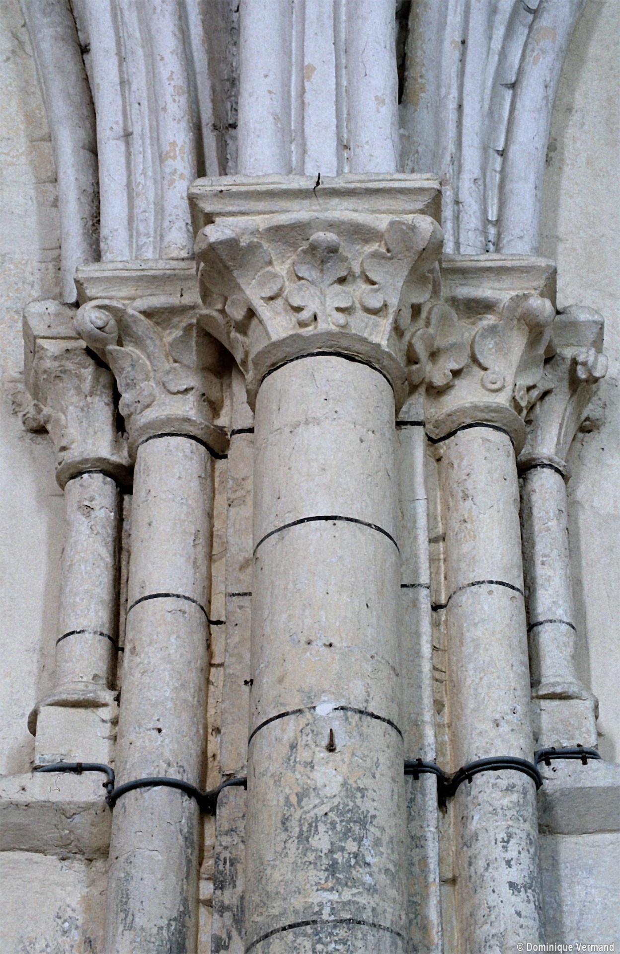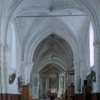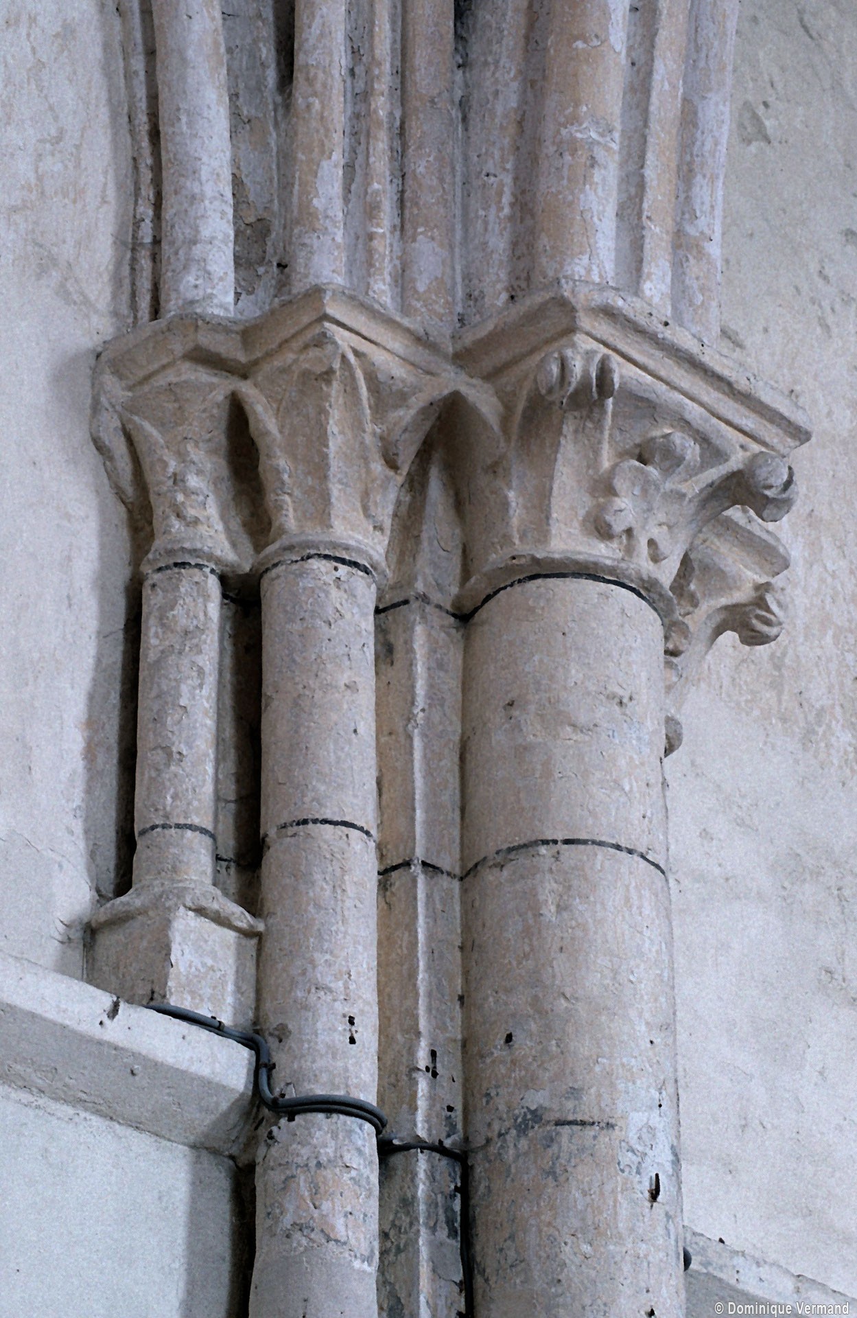 La nef, dont l’élévation est rigoureusement reprise dans le croisillon sud, est une construction très soignée et d’une grande élégance. Doubleaux, ogives et formerets de la voûte sont reçus sur un faisceau constitué d’une demi colonne et de quatre colonnettes par l’intermédiaire de chapiteaux décorés de crochets et de feuilles découpées. Contrairement à celles associées aux doubleaux et ogives, les colonnettes recevant l’arc formeret prennent naissance sur un bandeau saillant qui court à mi hauteur de l’élévation de la nef comme du transept.