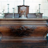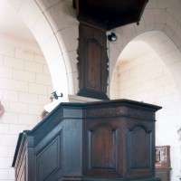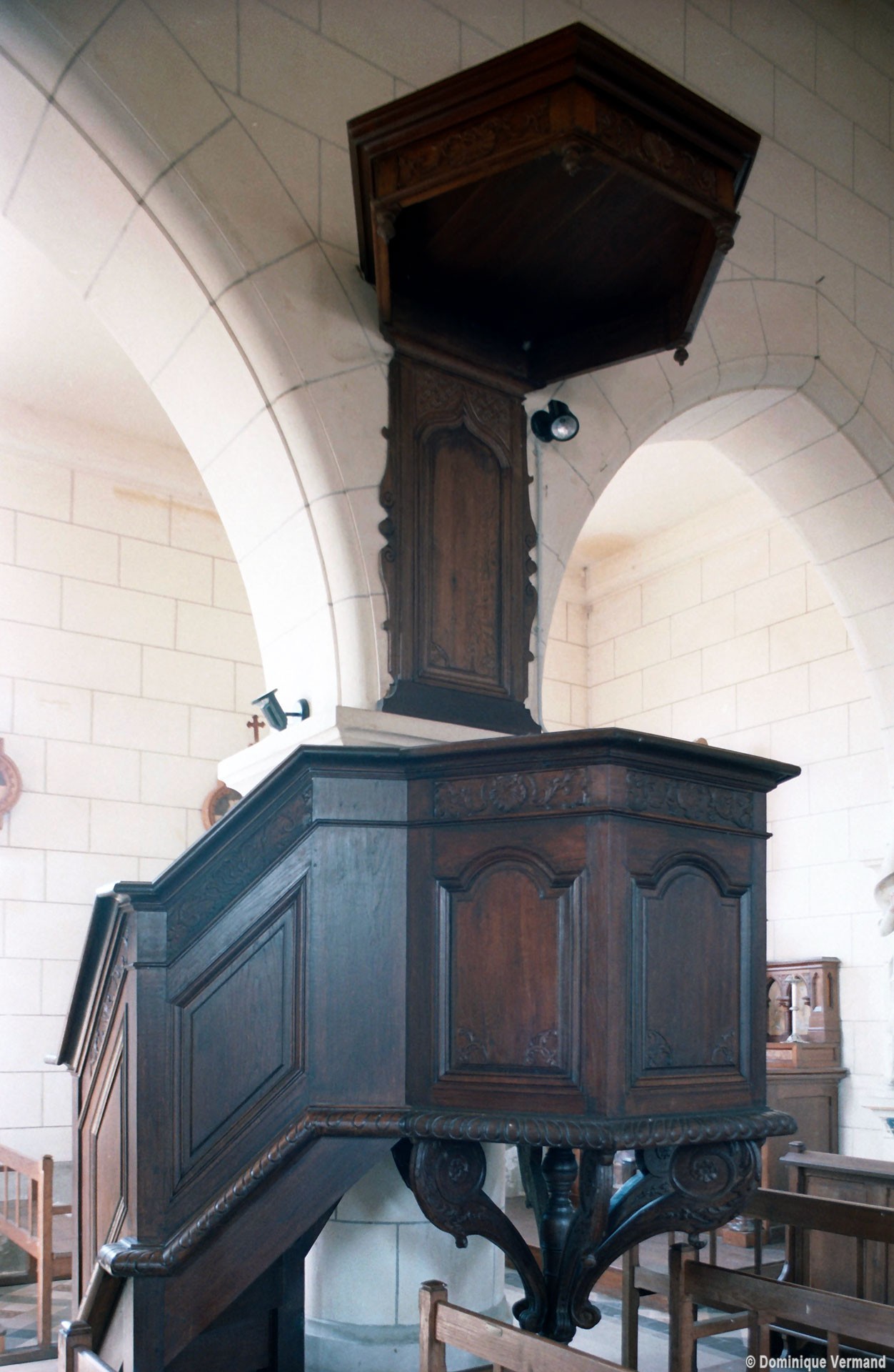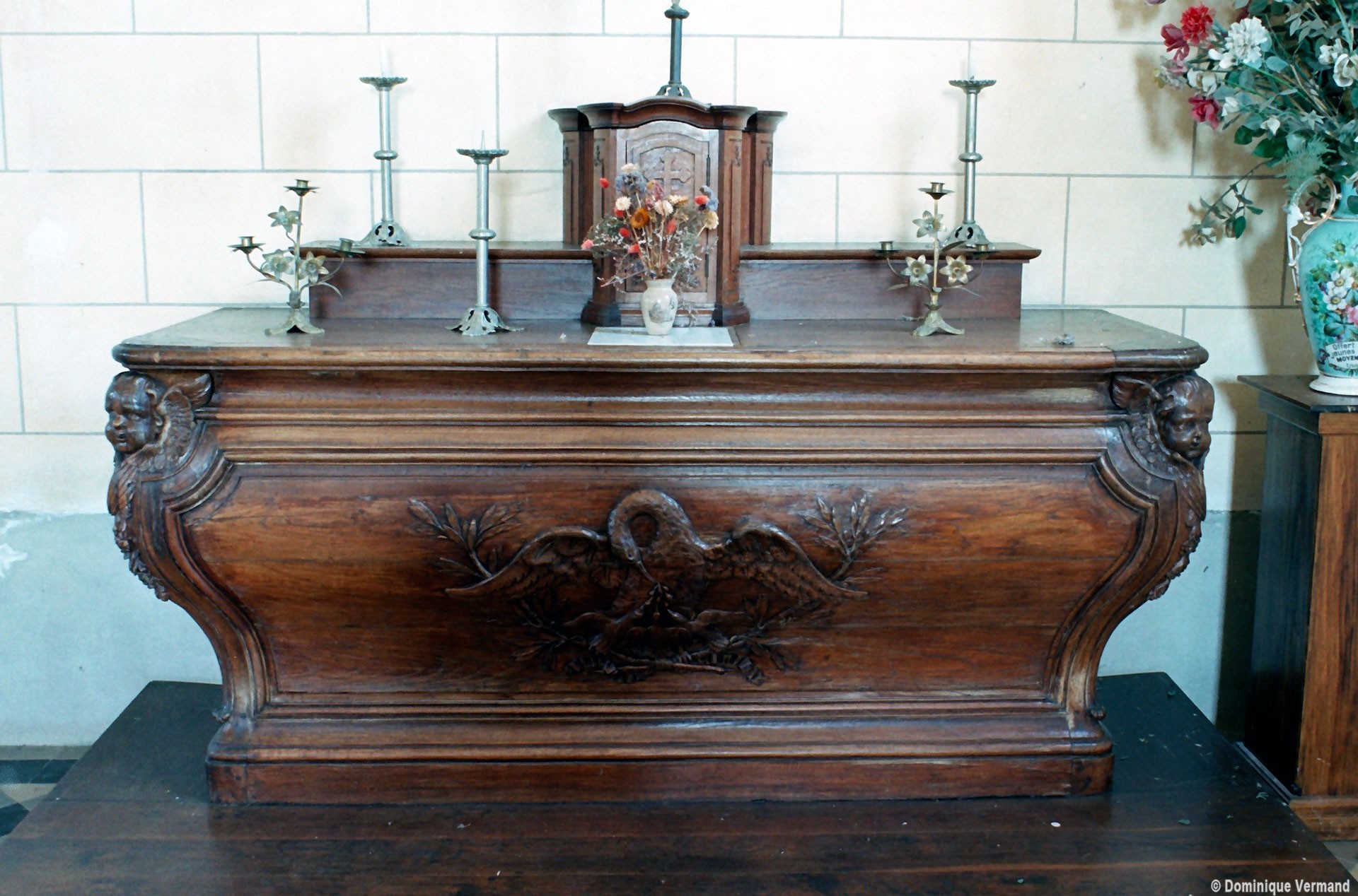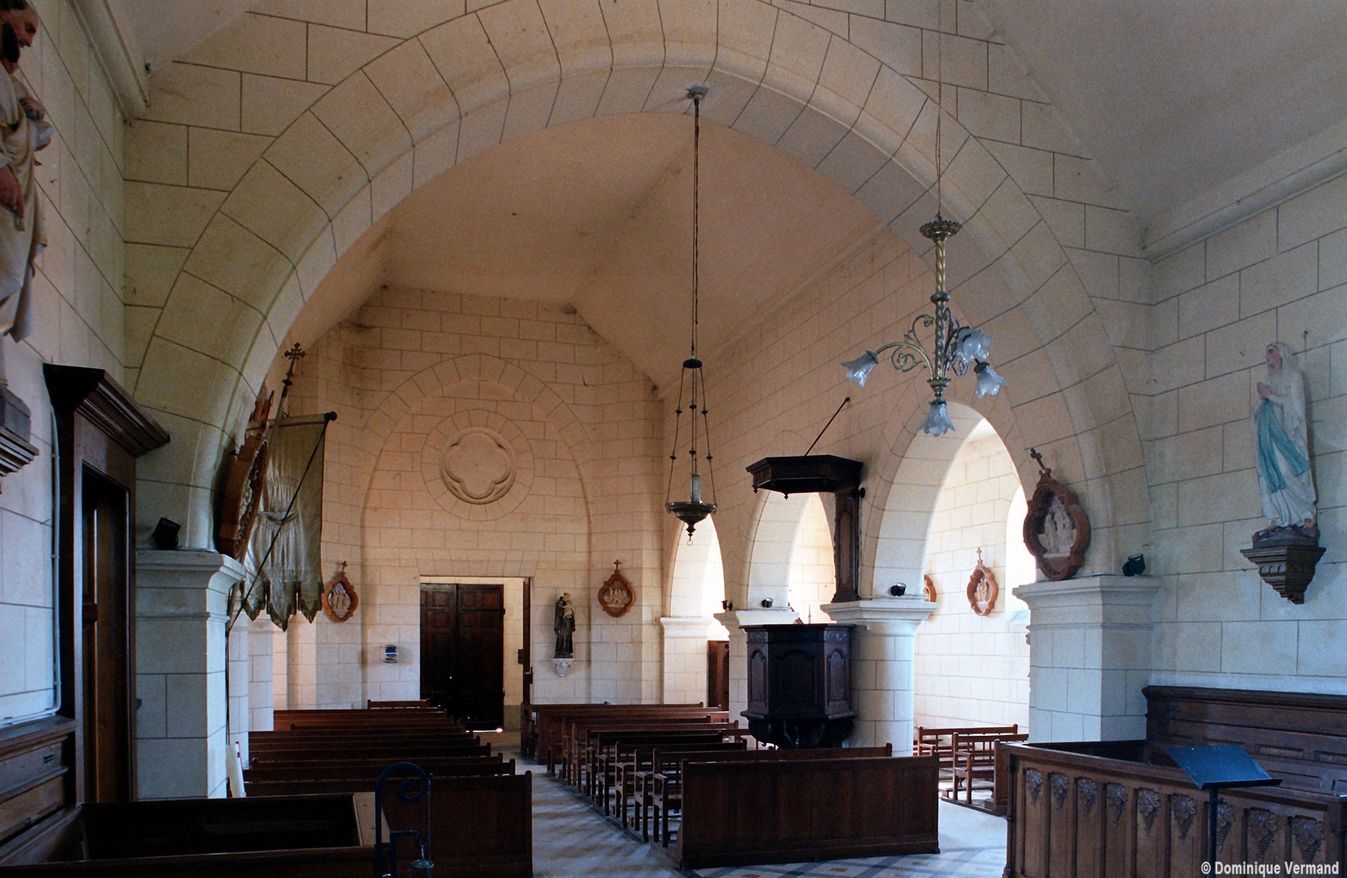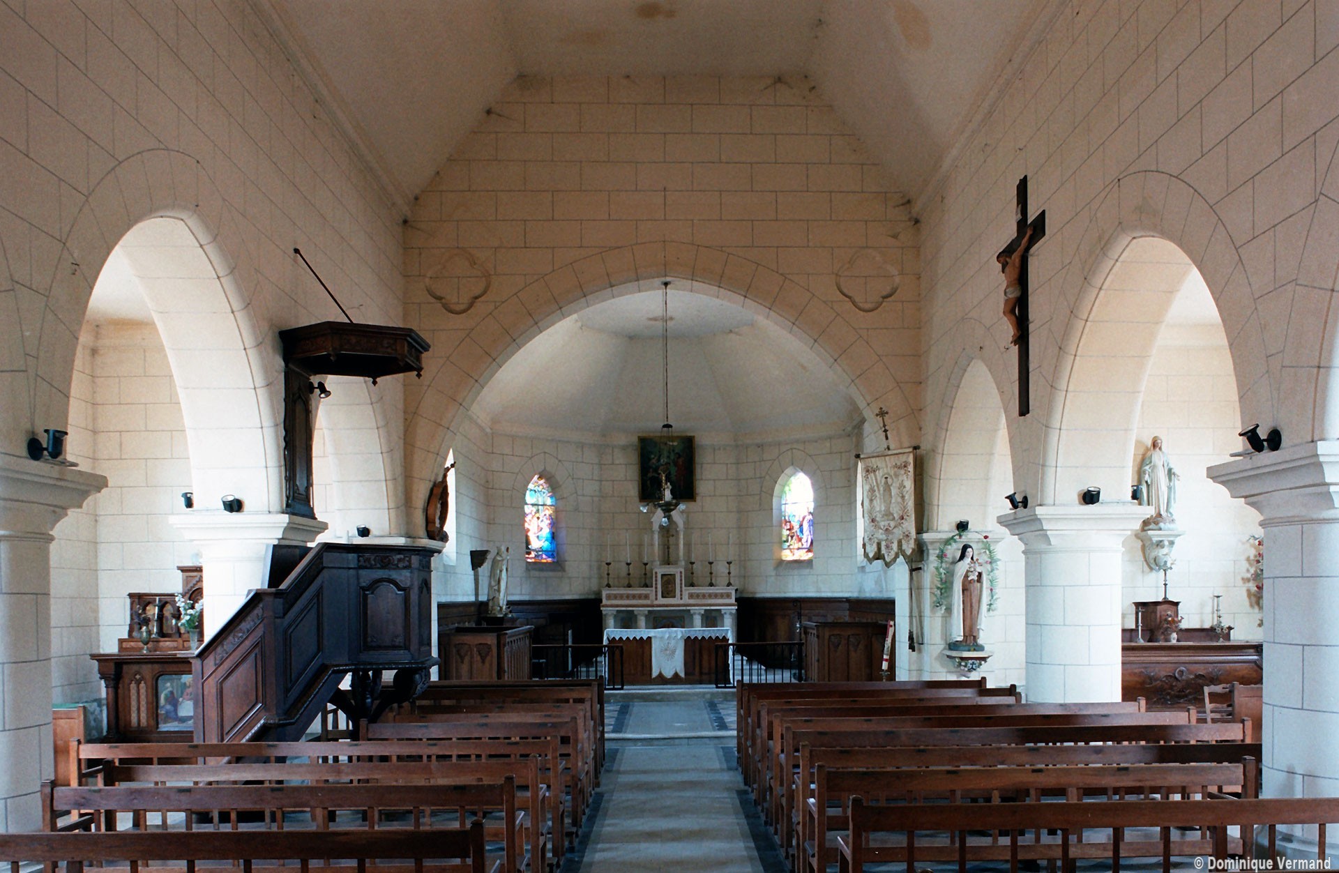 Contrairement au schéma habituel, le clocher, dont l’étage du beffroi est ajouré sur chaque face de deux hautes baies en plein cintre, ne comporte pas de tribune. La nef communique avec les bas-côtés par trois arcades brisées retombant sur des piles circulaires par l’intermédiaire de chapiteaux à la corbeille très courte que surmonte un tailloir en forte saillie, dans l’esprit de la fin du gothique. Des éléments de l’ancien mobilier du 18ème siècle – maître-autel et chaire à prêcher en chêne massif – ainsi qu’un bénitier en pierre du 16ème siècle ont pu être sauvegardés (2009).