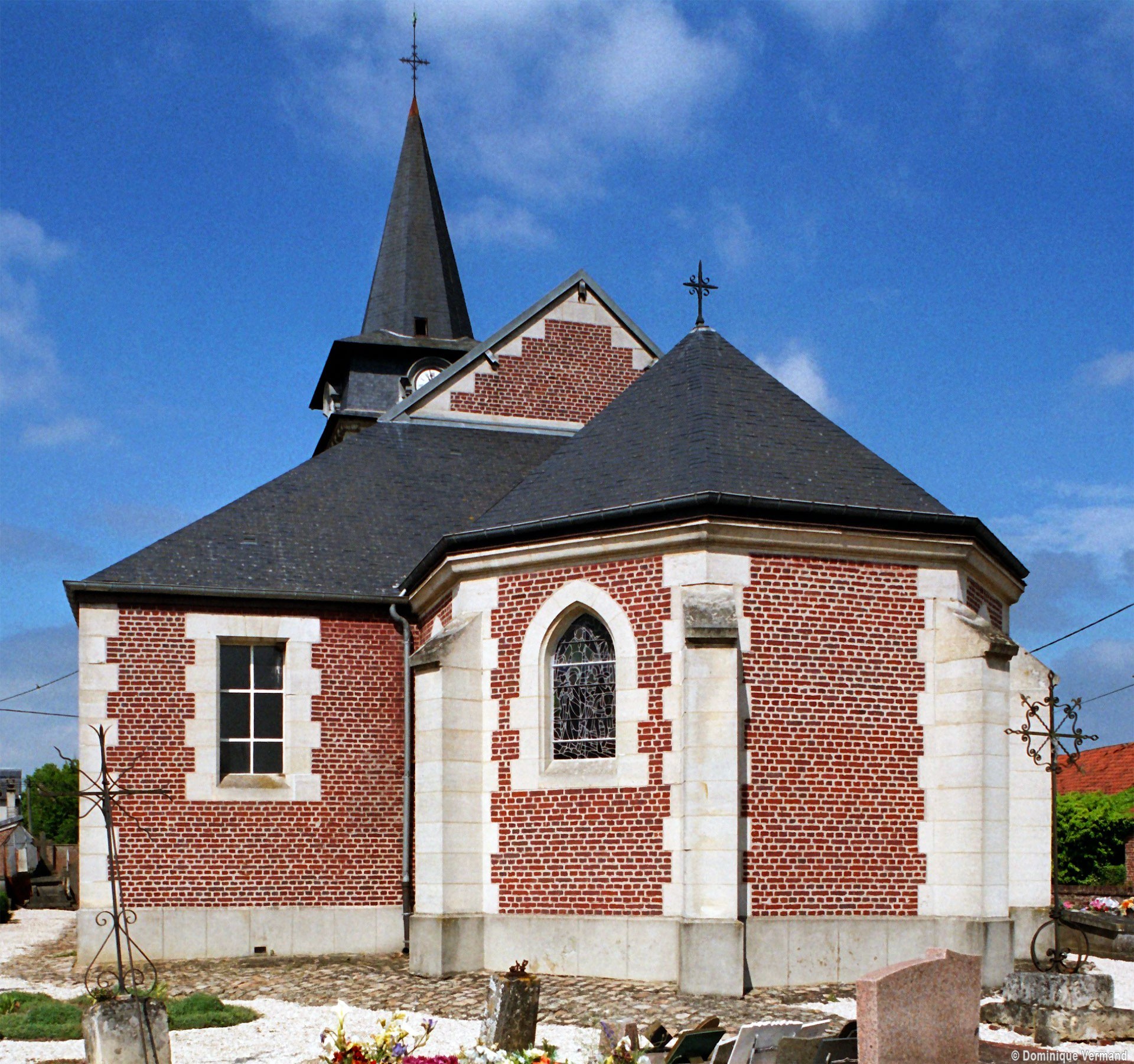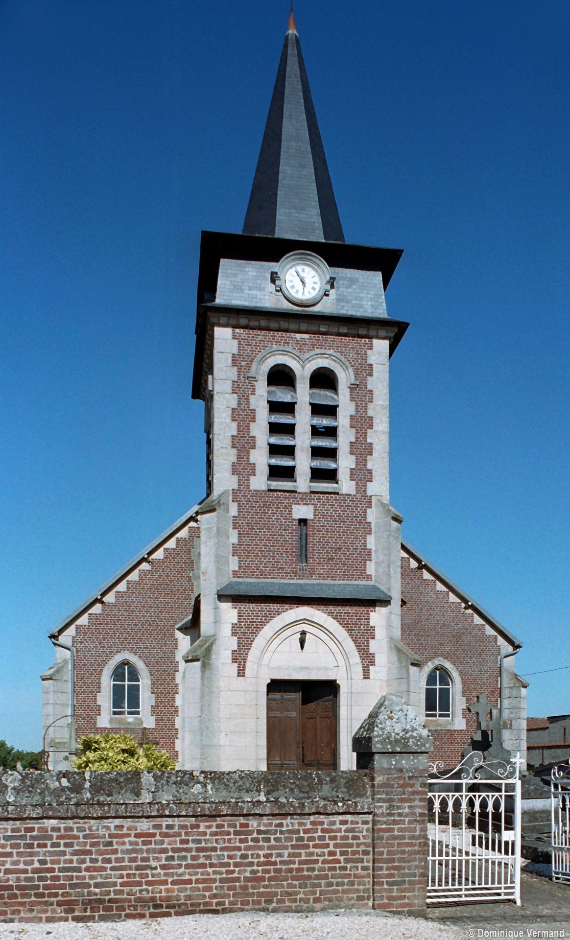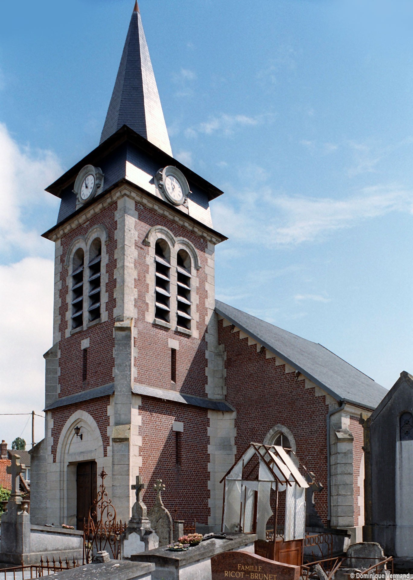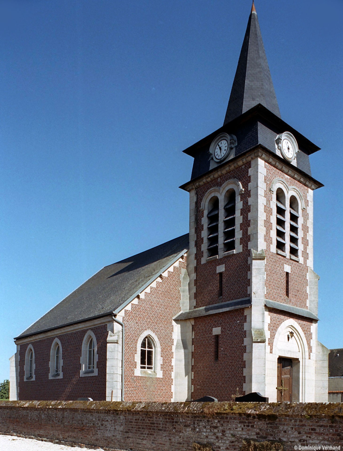 Détruite durant la Guerre 14-18, Saint-Eloi a été rebâtie dans les années 1920 en s’inspirant librement de l’édifice précédent. Avec son clocher porche en façade, sa nef avec bas-côtés et son choeur à chevet polygonal, le plan en est assez classique, comme l’est l’usage conjoint de la brique et de la pierre.
