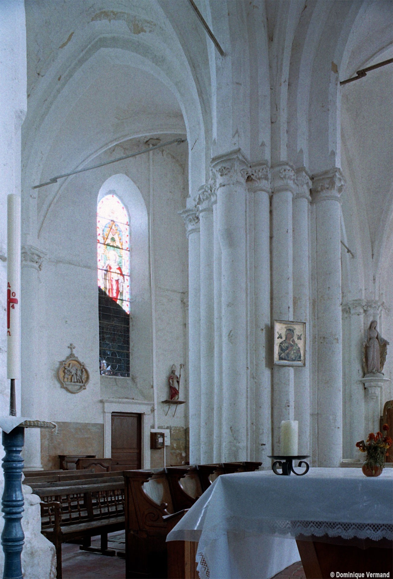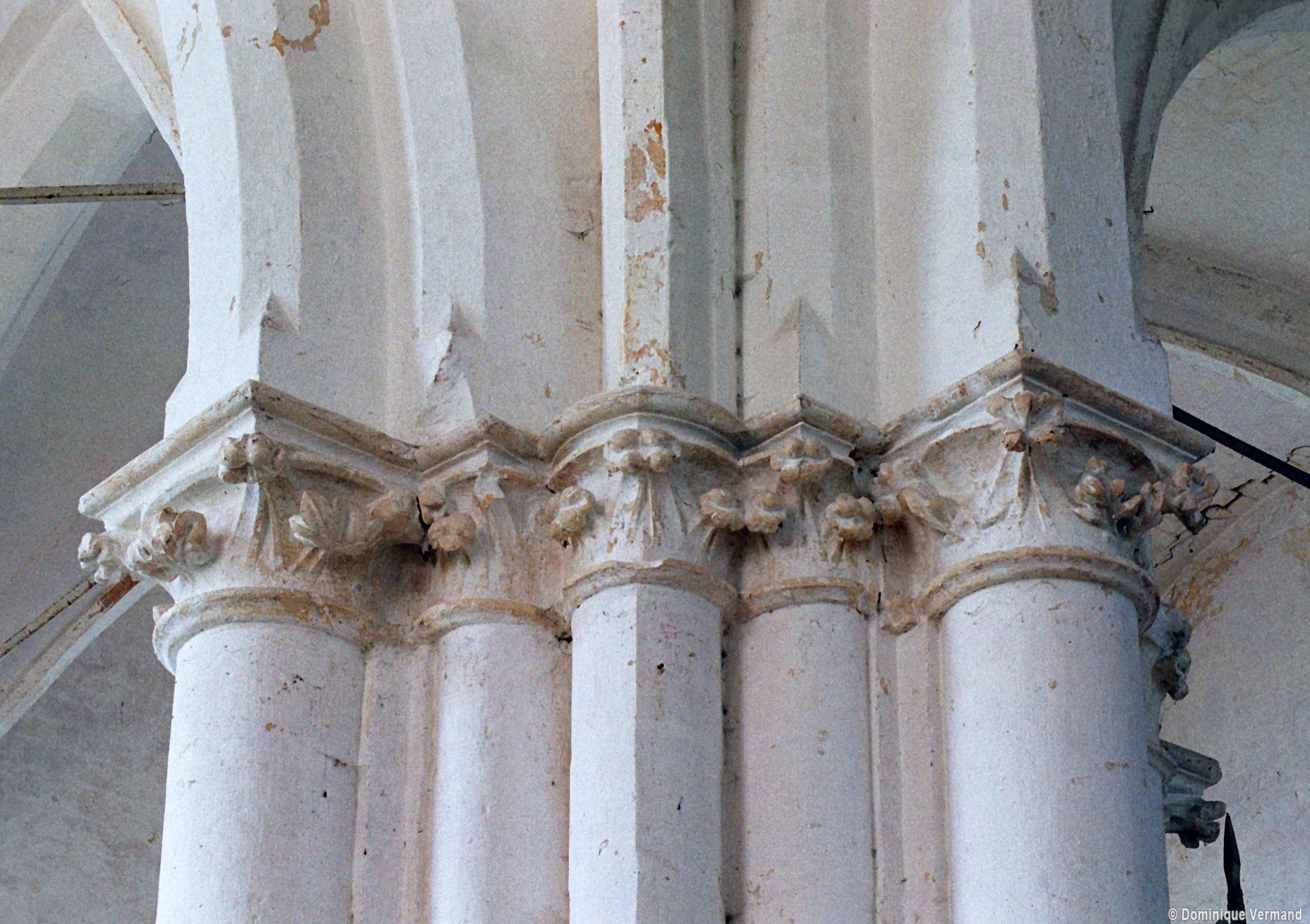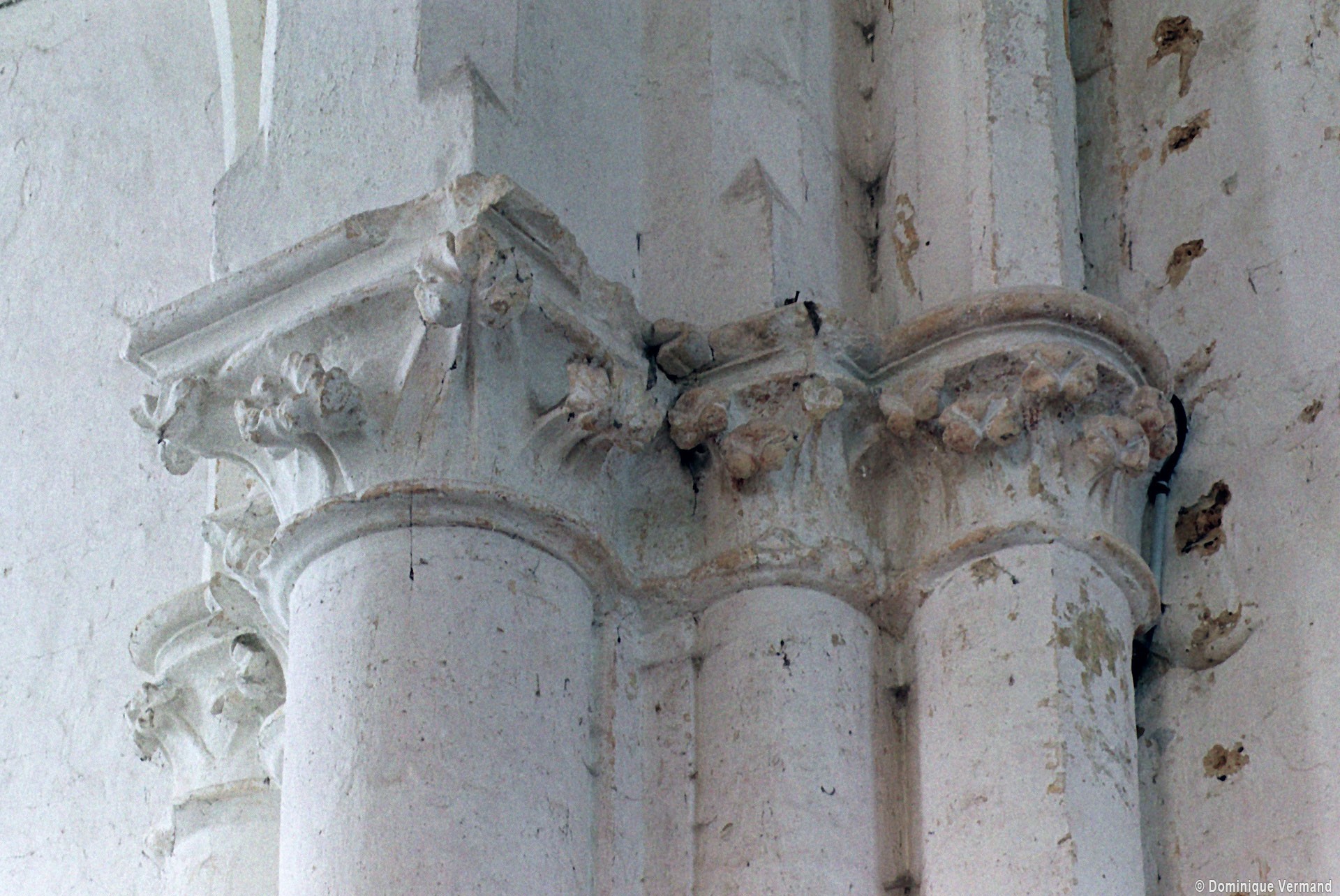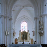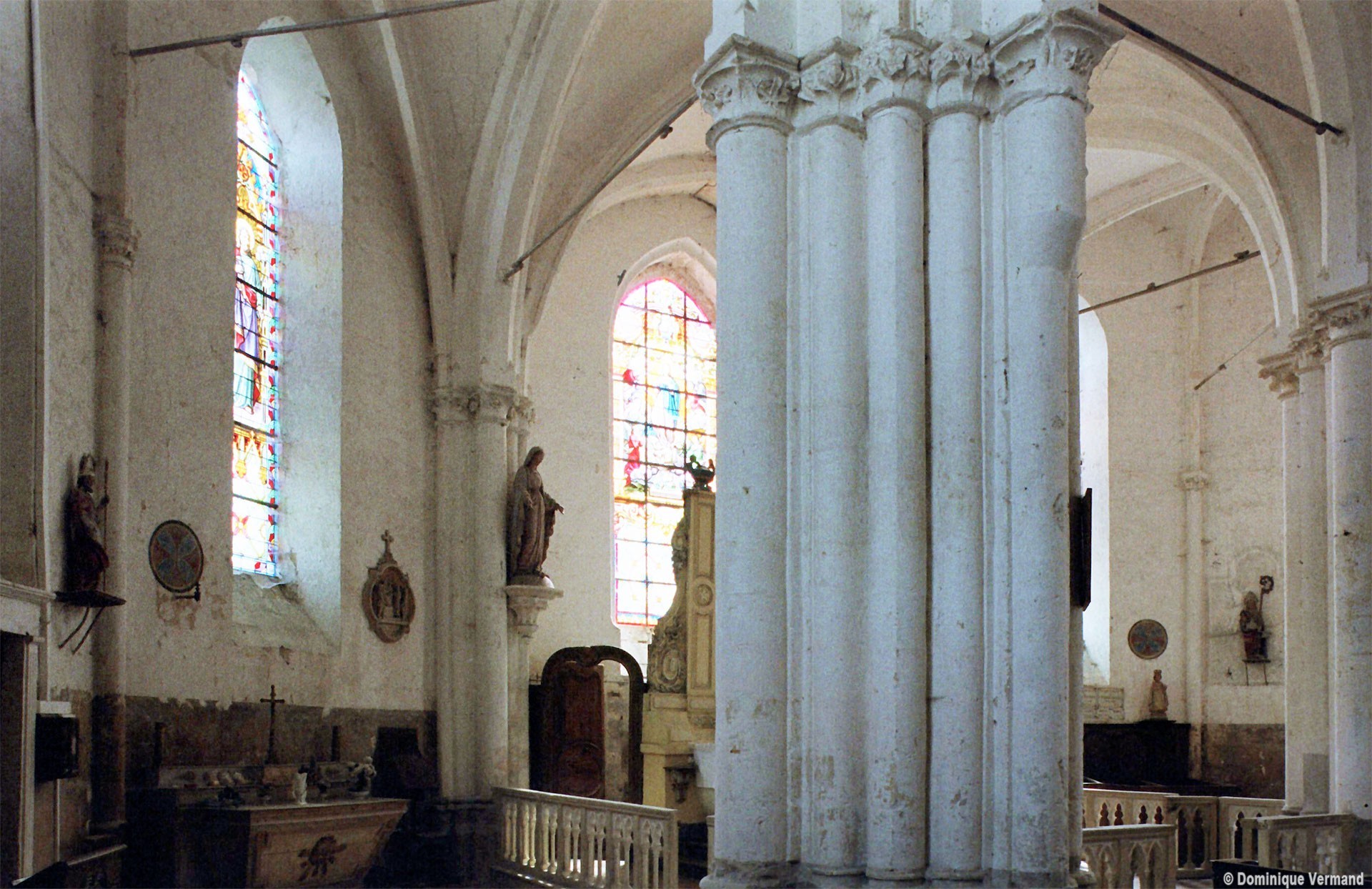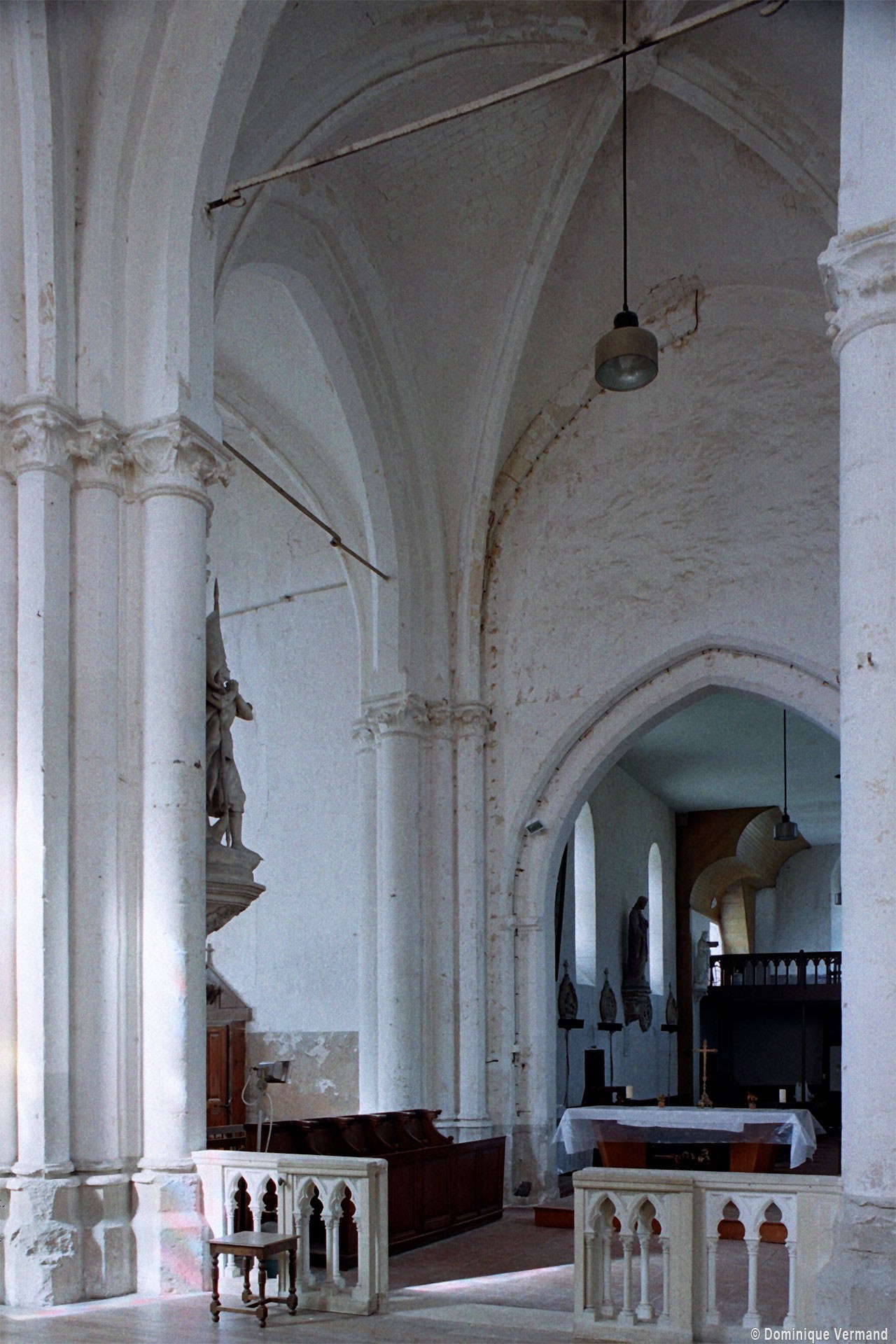 C’est à l’intérieur que ces curieuses dispositions prennent tout leur sens. A l’extrémité de la nef simplement charpentée, une arcade aux dimensions modeste introduit, en effet, à un espace complexe mais obéissant à des règles géométriques très strictes. Entièrement voûté d’ogives, il se développe à partir d’une travée centrale formant croisée et dont l’importance des piles suggère qu’un clocher en pierre s’y élevait peut-être autrefois. A partir de cette croisée, deux croisillons et une travée de choeur auraient constitué un plan des plus classiques s’ils n’avaient été reliés, au nord-est comme au sud-est, par un mur constitué de deux pans qui donnent à l’ensemble l’aspect d’un plan centré avec déambulatoire. Sa rigueur géométrique vaut, par ailleurs, à ces deux espaces ainsi créés à l’angle du transept et du choeur, de posséder chacun une voûte d’ogives très asymétrique, les deux voûtains en contact avec le mur étant beaucoup plus petits que les deux autres. Les retombées des voûtes s’effectuent sur des chapiteaux décorés de crochets et de feuilles polylobées dont la sculpture vigoureuse, d’une qualité remarquable, est caractéristique du milieu du 13ème siècle, ce que confirment les bases aux gorges très marquées.