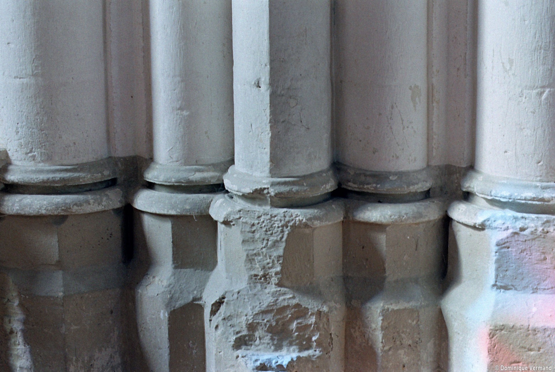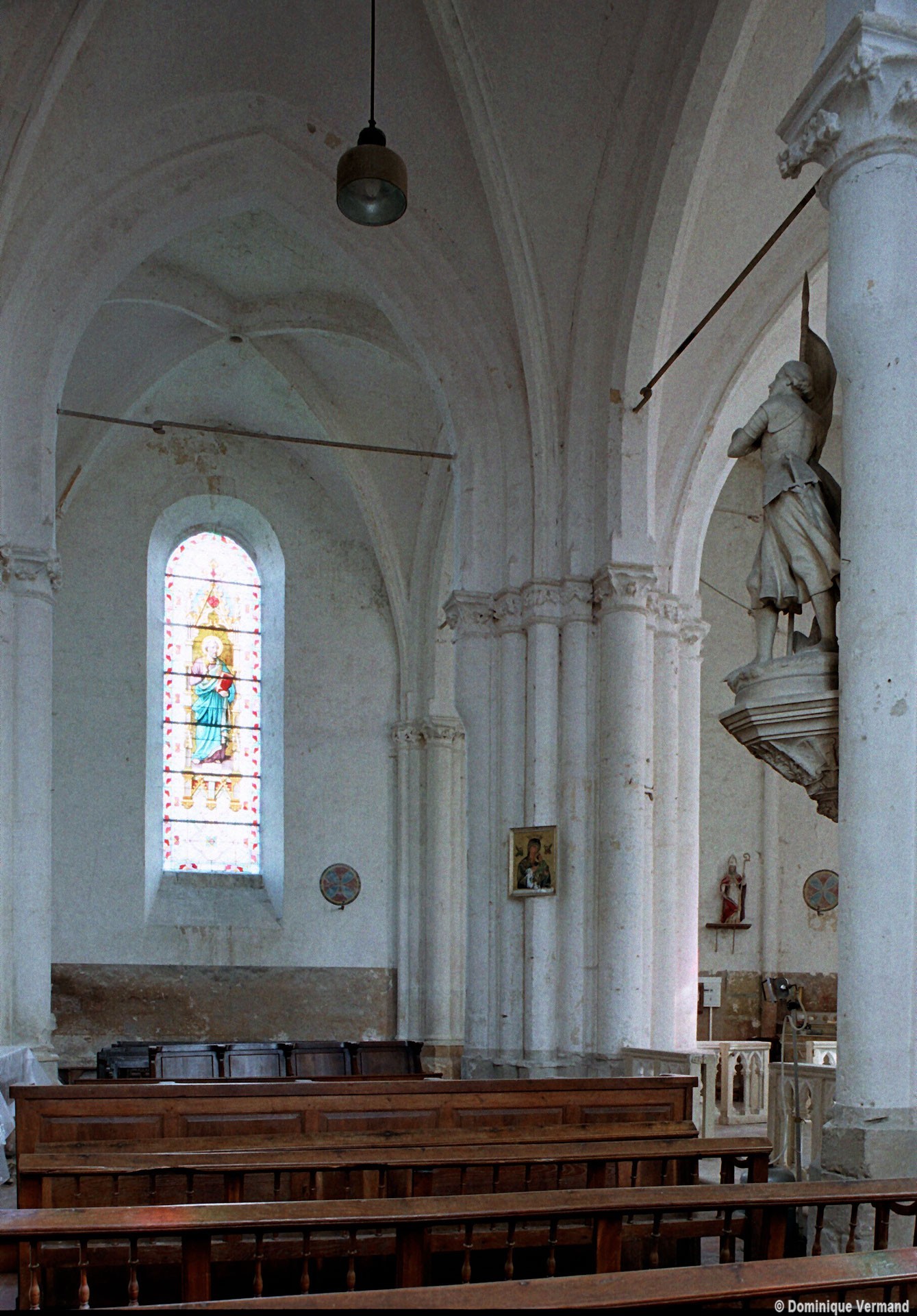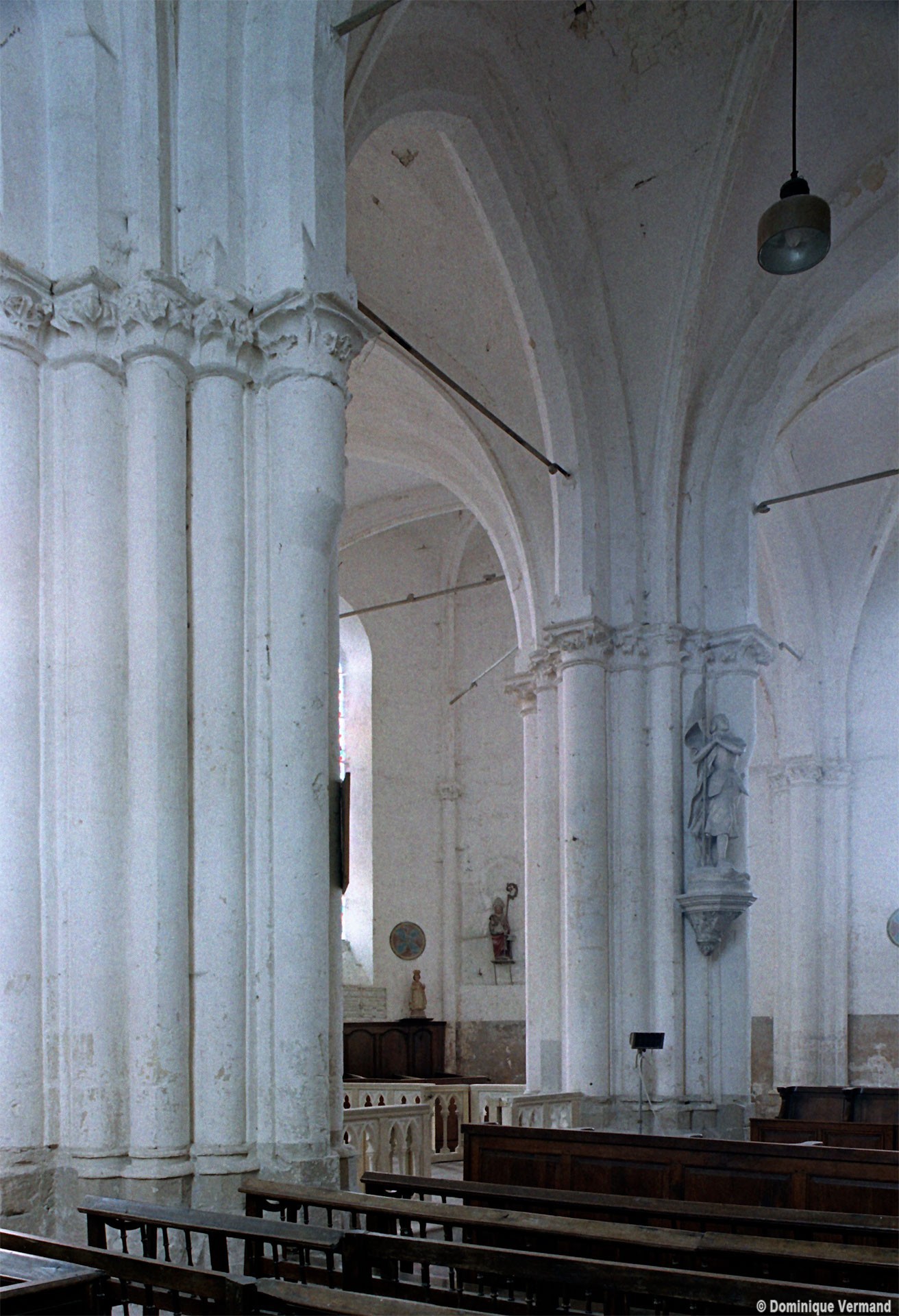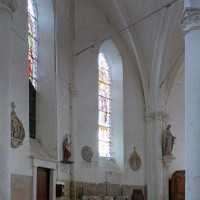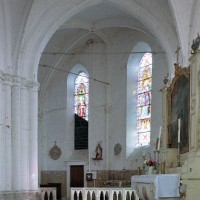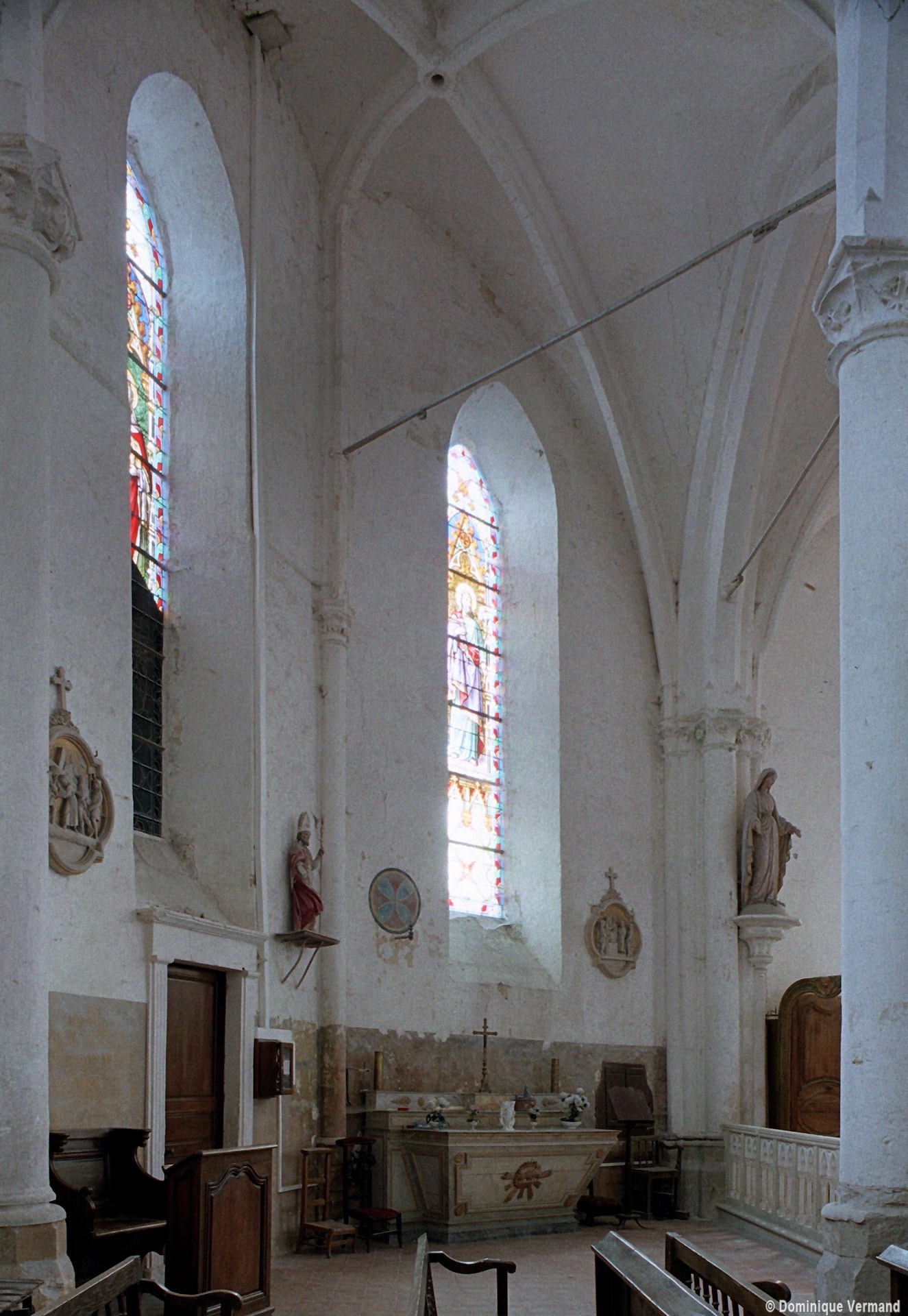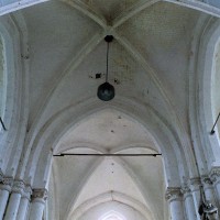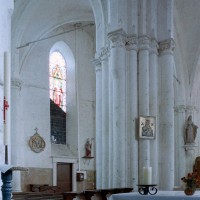 C’est à l’intérieur que ces curieuses dispositions prennent tout leur sens. A l’extrémité de la nef simplement charpentée, une arcade aux dimensions modeste introduit, en effet, à un espace complexe mais obéissant à des règles géométriques très strictes. Entièrement voûté d’ogives, il se développe à partir d’une travée centrale formant croisée et dont l’importance des piles suggère qu’un clocher en pierre s’y élevait peut-être autrefois. A partir de cette croisée, deux croisillons et une travée de choeur auraient constitué un plan des plus classiques s’ils n’avaient été reliés, au nord-est comme au sud-est, par un mur constitué de deux pans qui donnent à l’ensemble l’aspect d’un plan centré avec déambulatoire. Sa rigueur géométrique vaut, par ailleurs, à ces deux espaces ainsi créés à l’angle du transept et du choeur, de posséder chacun une voûte d’ogives très asymétrique, les deux voûtains en contact avec le mur étant beaucoup plus petits que les deux autres. Les retombées des voûtes s’effectuent sur des chapiteaux décorés de crochets et de feuilles polylobées dont la sculpture vigoureuse, d’une qualité remarquable, est caractéristique du milieu du 13ème siècle, ce que confirment les bases aux gorges très marquées.