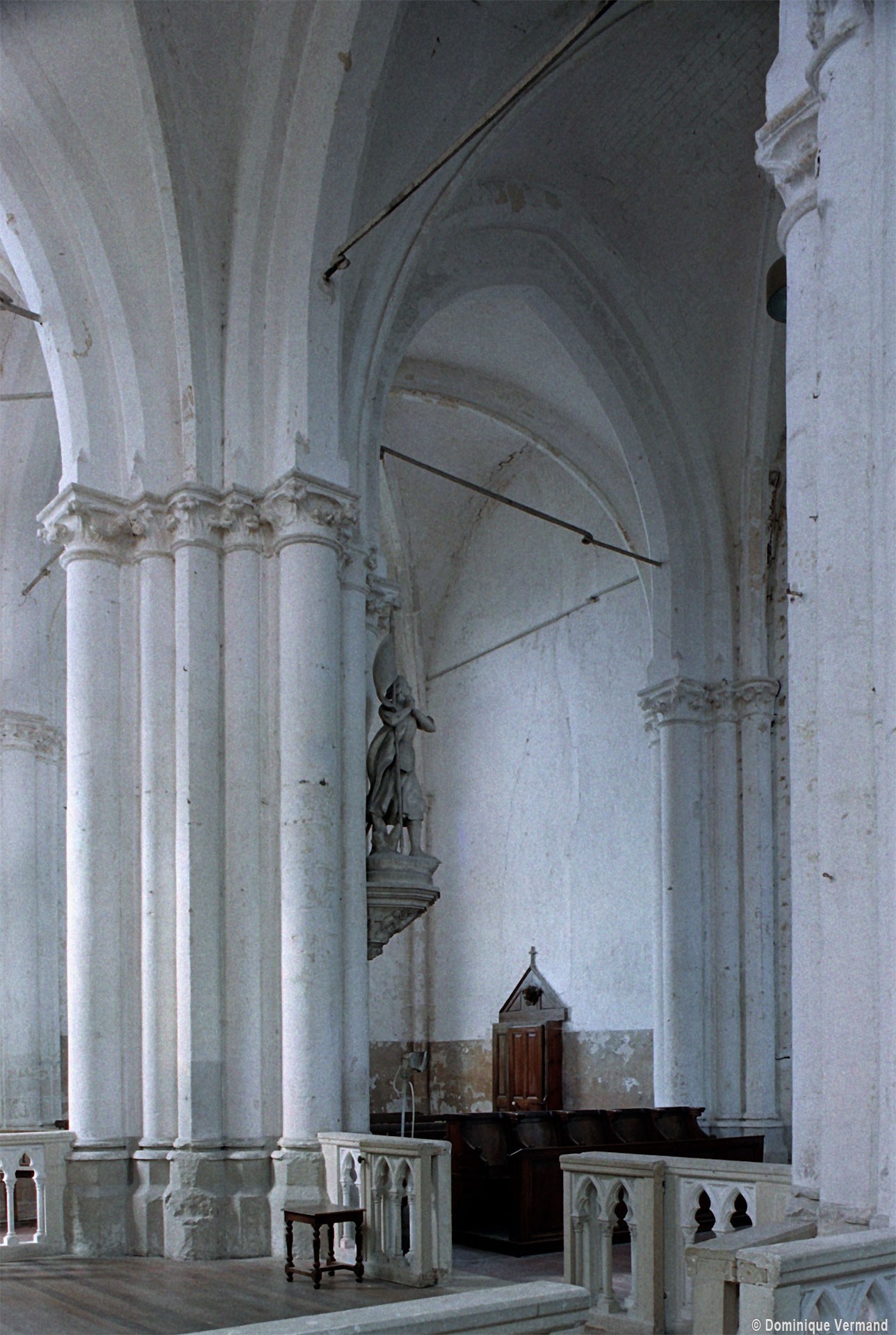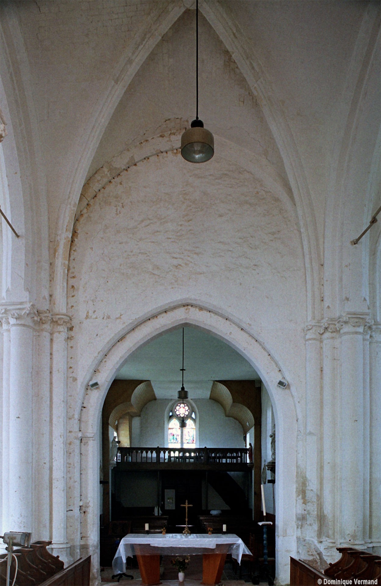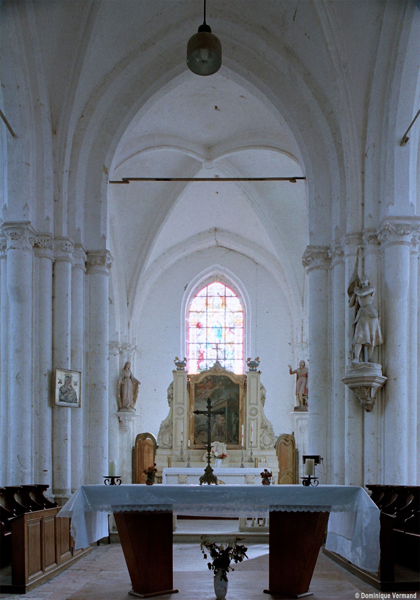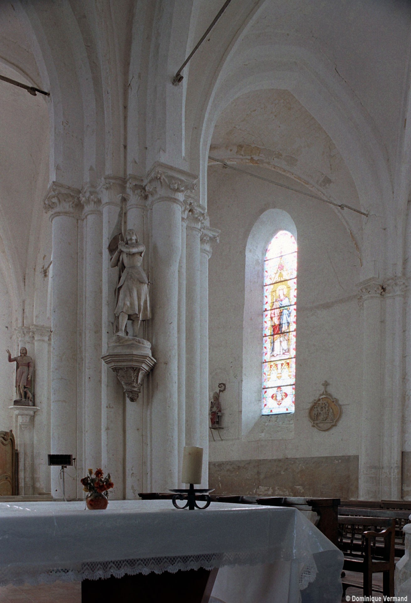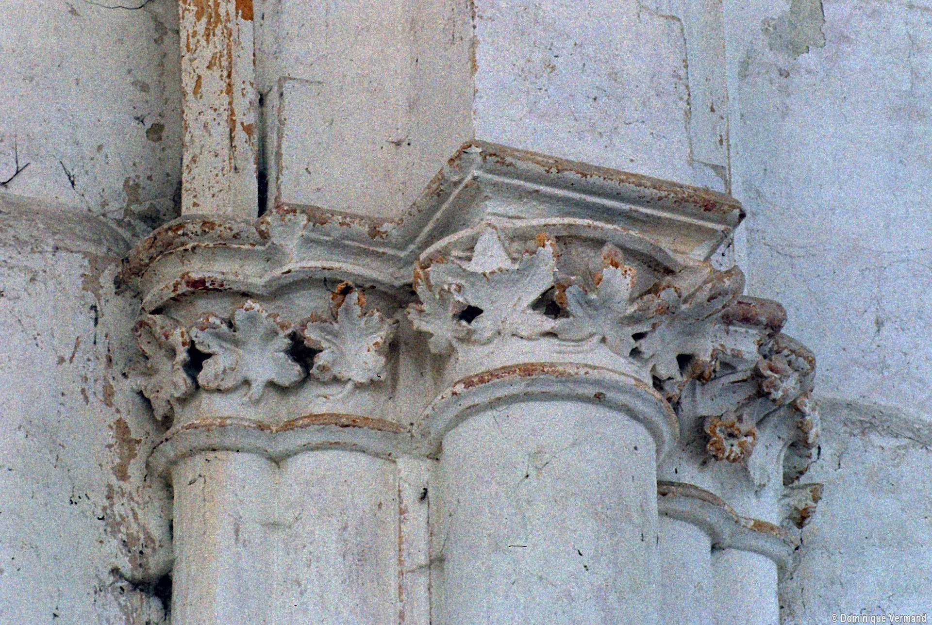 C’est à l’intérieur que ces curieuses dispositions prennent tout leur sens. A l’extrémité de la nef simplement charpentée, une arcade aux dimensions modeste introduit, en effet, à un espace complexe mais obéissant à des règles géométriques très strictes. Entièrement voûté d’ogives, il se développe à partir d’une travée centrale formant croisée et dont l’importance des piles suggère qu’un clocher en pierre s’y élevait peut-être autrefois. A partir de cette croisée, deux croisillons et une travée de choeur auraient constitué un plan des plus classiques s’ils n’avaient été reliés, au nord-est comme au sud-est, par un mur constitué de deux pans qui donnent à l’ensemble l’aspect d’un plan centré avec déambulatoire. Sa rigueur géométrique vaut, par ailleurs, à ces deux espaces ainsi créés à l’angle du transept et du choeur, de posséder chacun une voûte d’ogives très asymétrique, les deux voûtains en contact avec le mur étant beaucoup plus petits que les deux autres. Les retombées des voûtes s’effectuent sur des chapiteaux décorés de crochets et de feuilles polylobées dont la sculpture vigoureuse, d’une qualité remarquable, est caractéristique du milieu du 13ème siècle, ce que confirment les bases aux gorges très marquées.