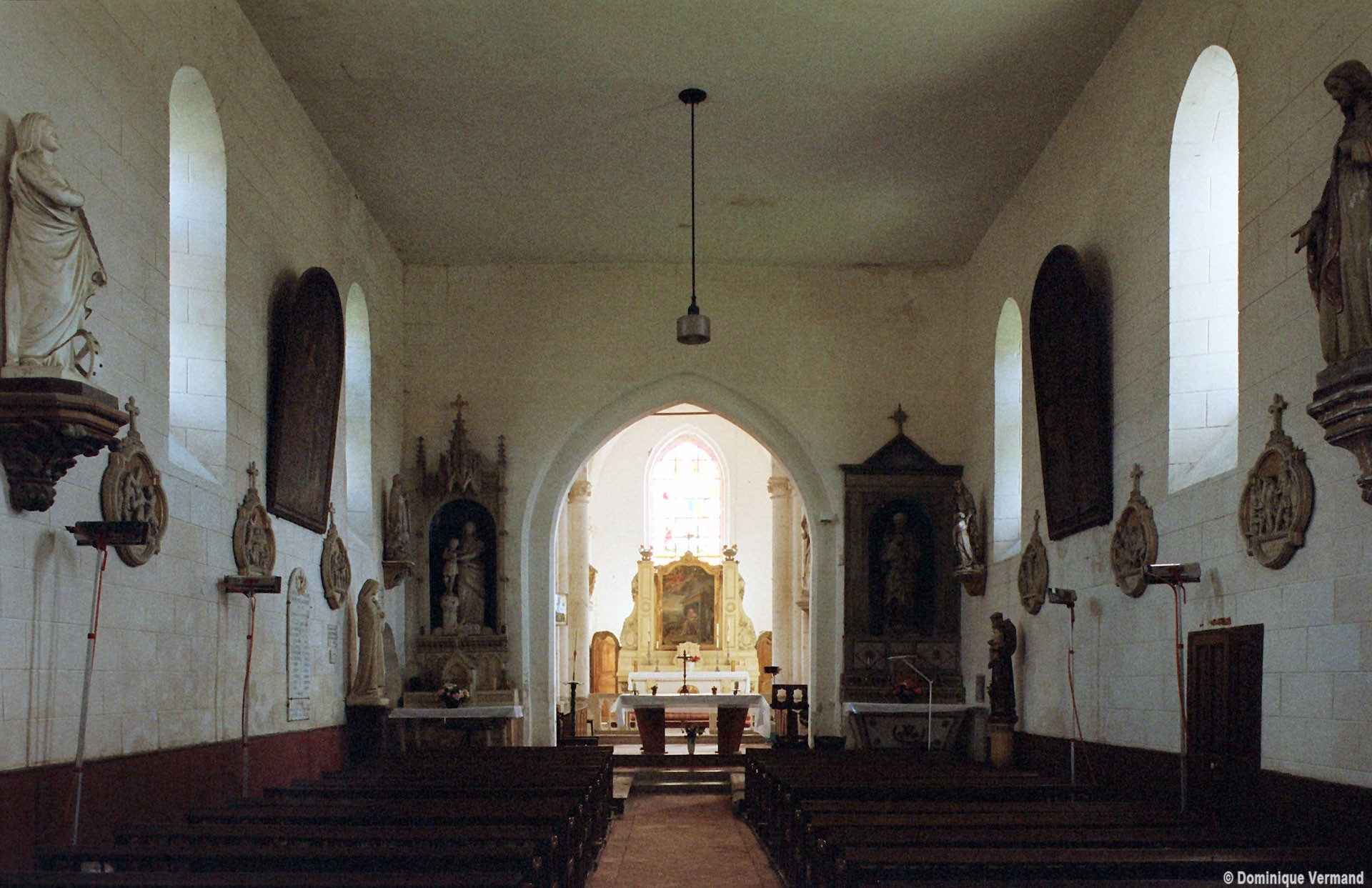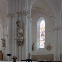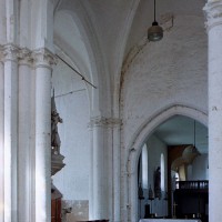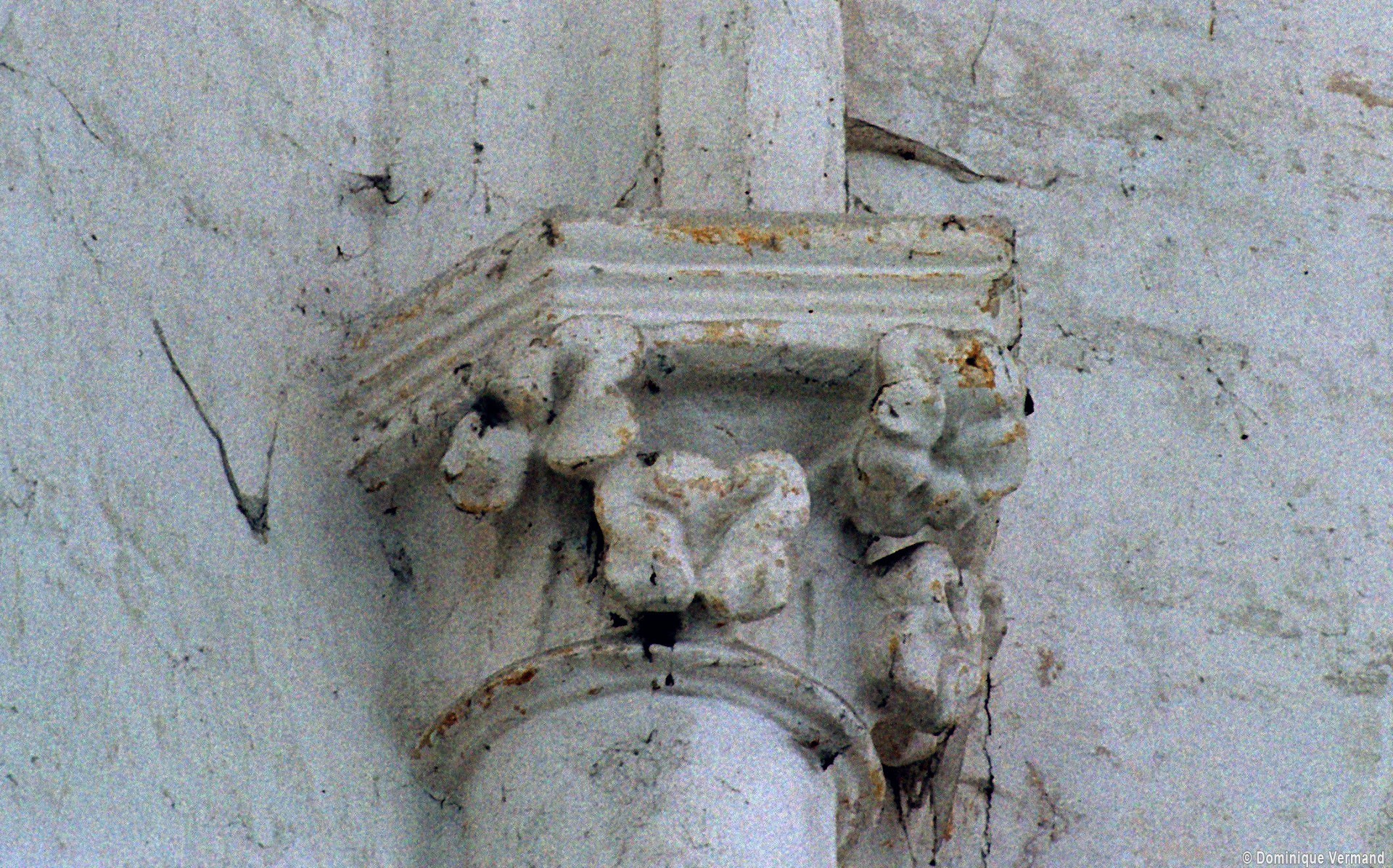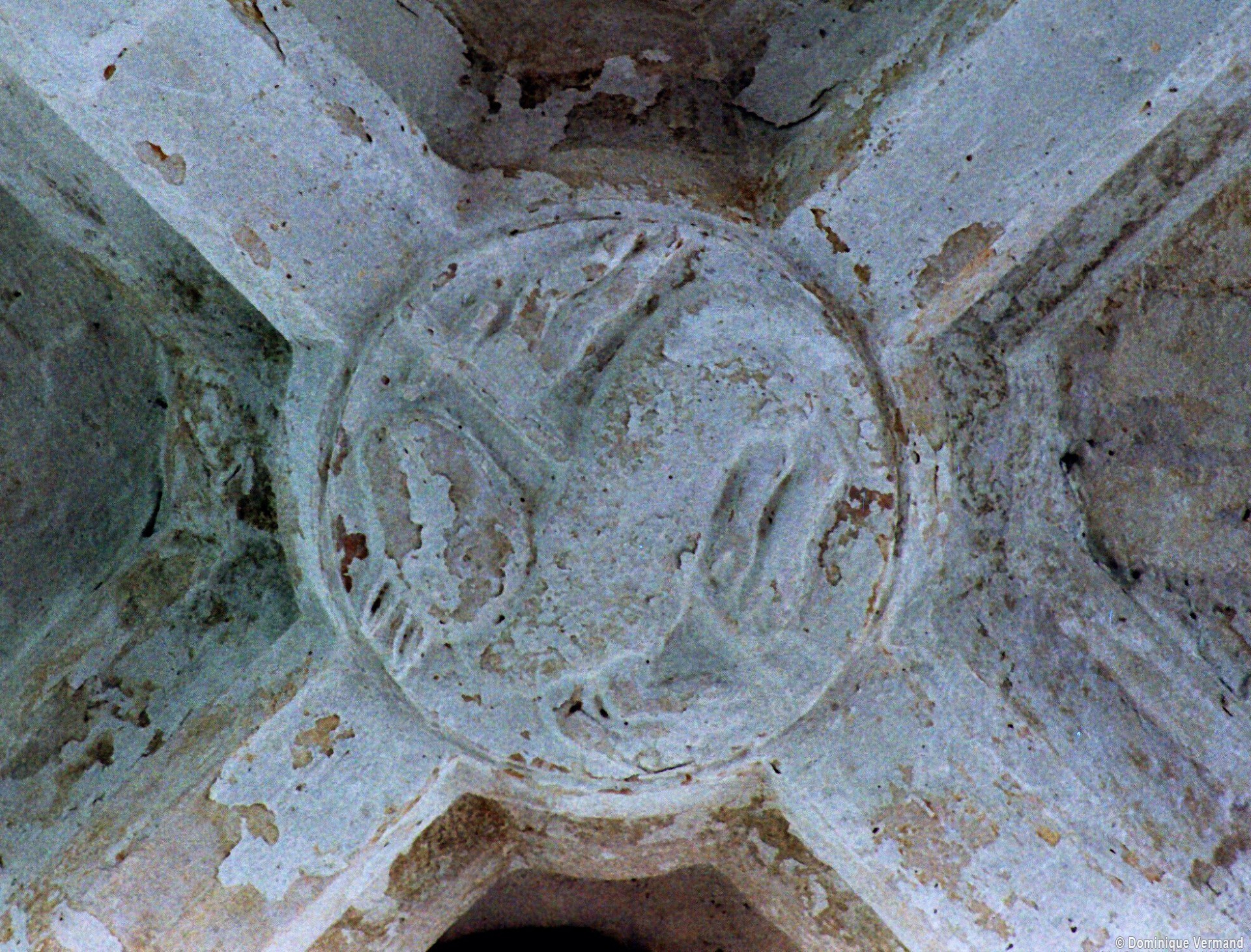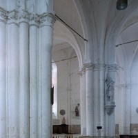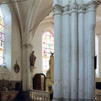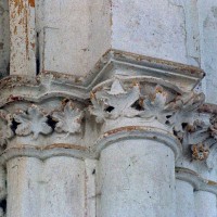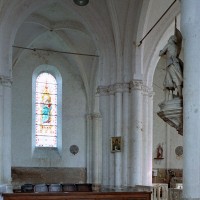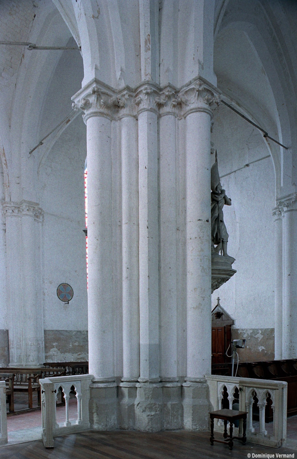 C’est à l’intérieur que ces curieuses dispositions prennent tout leur sens. A l’extrémité de la nef simplement charpentée, une arcade aux dimensions modeste introduit, en effet, à un espace complexe mais obéissant à des règles géométriques très strictes. Entièrement voûté d’ogives, il se développe à partir d’une travée centrale formant croisée et dont l’importance des piles suggère qu’un clocher en pierre s’y élevait peut-être autrefois. A partir de cette croisée, deux croisillons et une travée de choeur auraient constitué un plan des plus classiques s’ils n’avaient été reliés, au nord-est comme au sud-est, par un mur constitué de deux pans qui donnent à l’ensemble l’aspect d’un plan centré avec déambulatoire. Sa rigueur géométrique vaut, par ailleurs, à ces deux espaces ainsi créés à l’angle du transept et du choeur, de posséder chacun une voûte d’ogives très asymétrique, les deux voûtains en contact avec le mur étant beaucoup plus petits que les deux autres. Les retombées des voûtes s’effectuent sur des chapiteaux décorés de crochets et de feuilles polylobées dont la sculpture vigoureuse, d’une qualité remarquable, est caractéristique du milieu du 13ème siècle, ce que confirment les bases aux gorges très marquées.