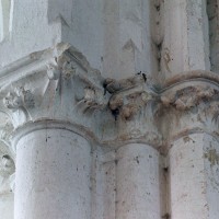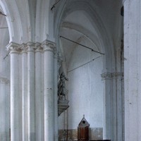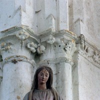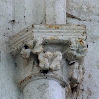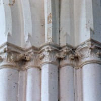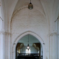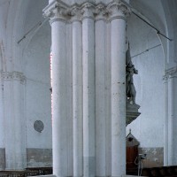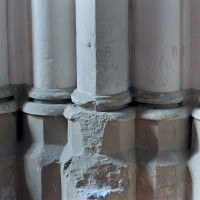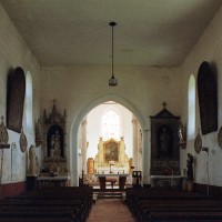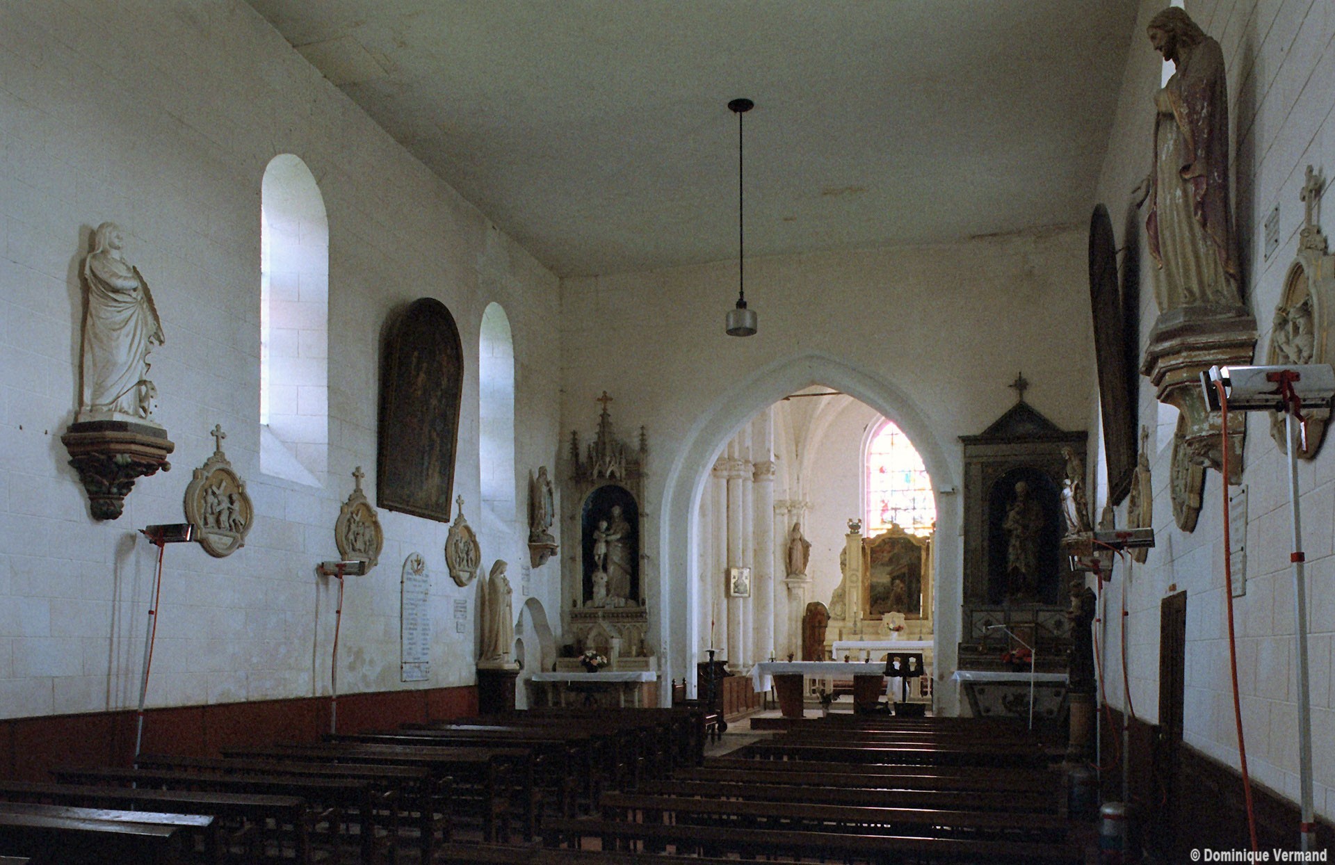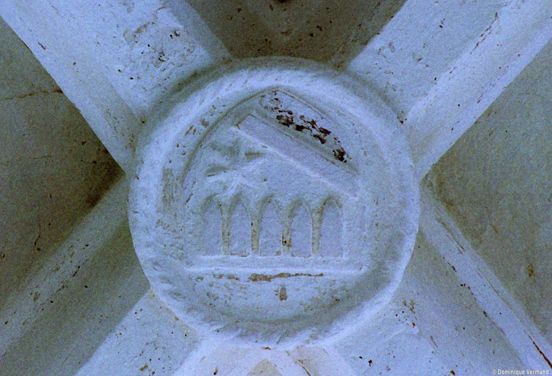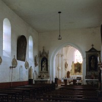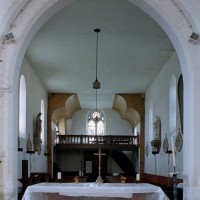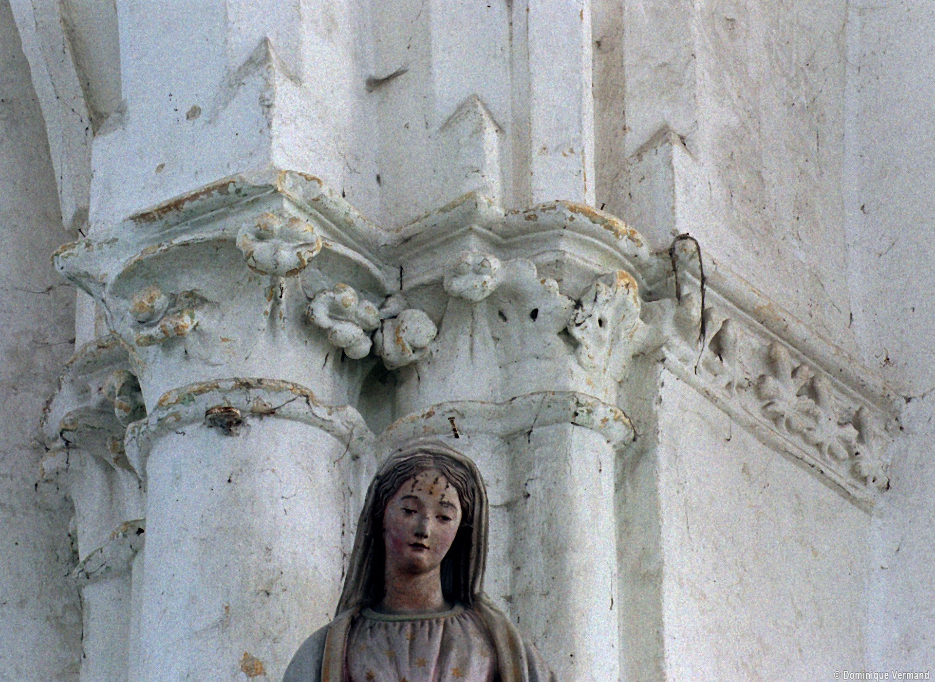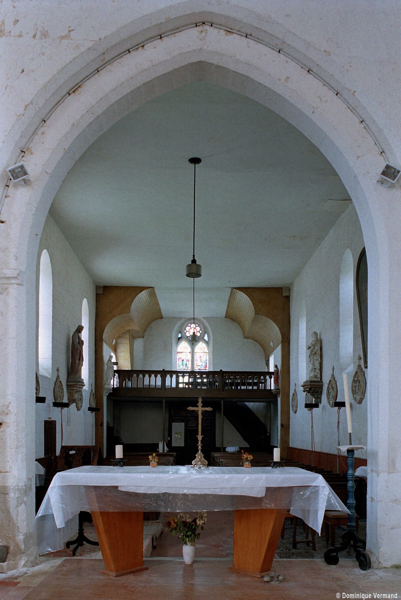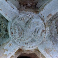 C’est à l’intérieur que ces curieuses dispositions prennent tout leur sens. A l’extrémité de la nef simplement charpentée, une arcade aux dimensions modeste introduit, en effet, à un espace complexe mais obéissant à des règles géométriques très strictes. Entièrement voûté d’ogives, il se développe à partir d’une travée centrale formant croisée et dont l’importance des piles suggère qu’un clocher en pierre s’y élevait peut-être autrefois. A partir de cette croisée, deux croisillons et une travée de choeur auraient constitué un plan des plus classiques s’ils n’avaient été reliés, au nord-est comme au sud-est, par un mur constitué de deux pans qui donnent à l’ensemble l’aspect d’un plan centré avec déambulatoire. Sa rigueur géométrique vaut, par ailleurs, à ces deux espaces ainsi créés à l’angle du transept et du choeur, de posséder chacun une voûte d’ogives très asymétrique, les deux voûtains en contact avec le mur étant beaucoup plus petits que les deux autres. Les retombées des voûtes s’effectuent sur des chapiteaux décorés de crochets et de feuilles polylobées dont la sculpture vigoureuse, d’une qualité remarquable, est caractéristique du milieu du 13ème siècle, ce que confirment les bases aux gorges très marquées.